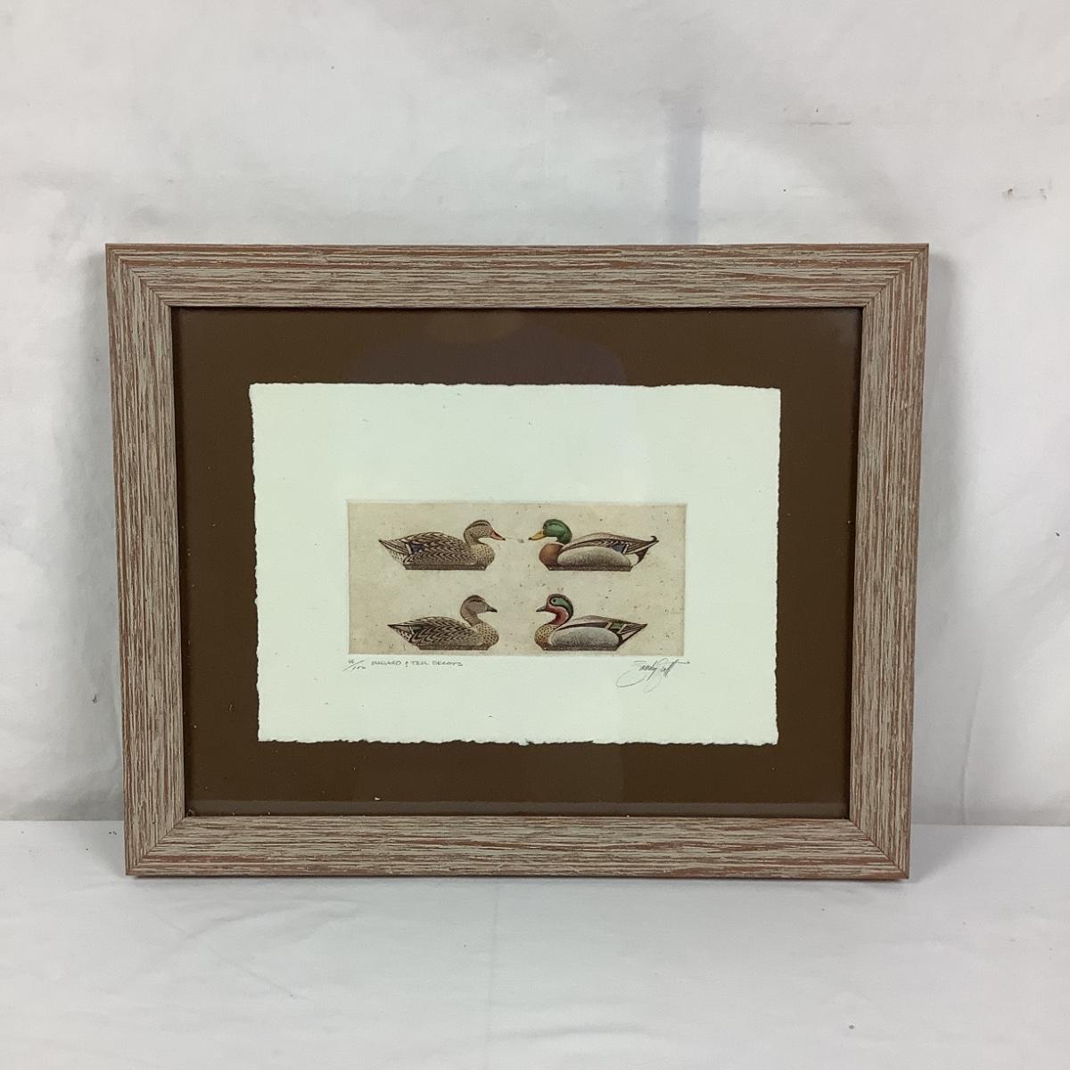 1006 Sandy Scott Hand Colored Copperplate Etching on French Rag Paper of Mallards & Teal Decoys - Signed & Numbered 46/100. Glassed with Wood Frame.