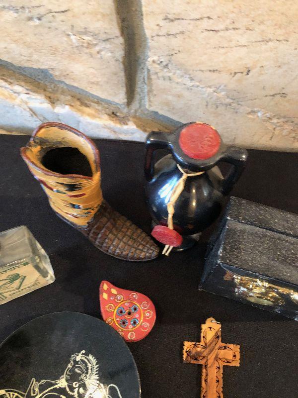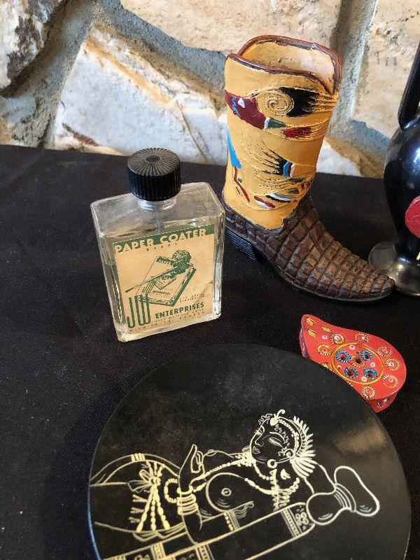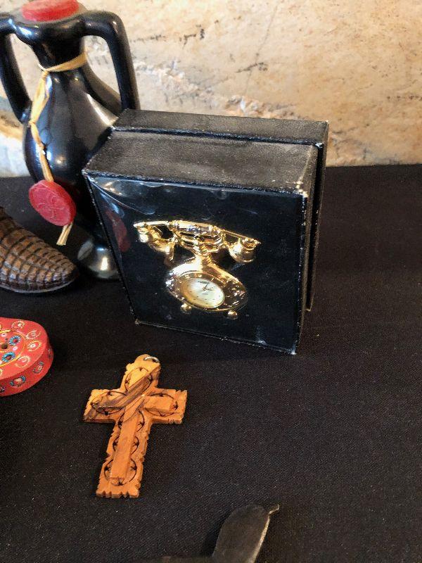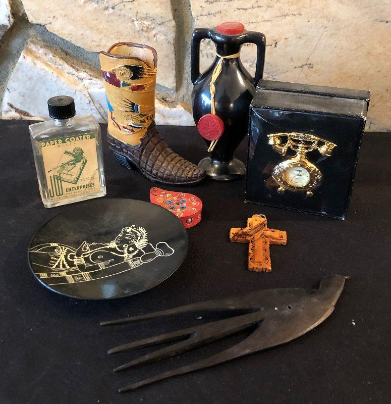 #1007 Collection of smalls: Bottle, plate, clock, bird