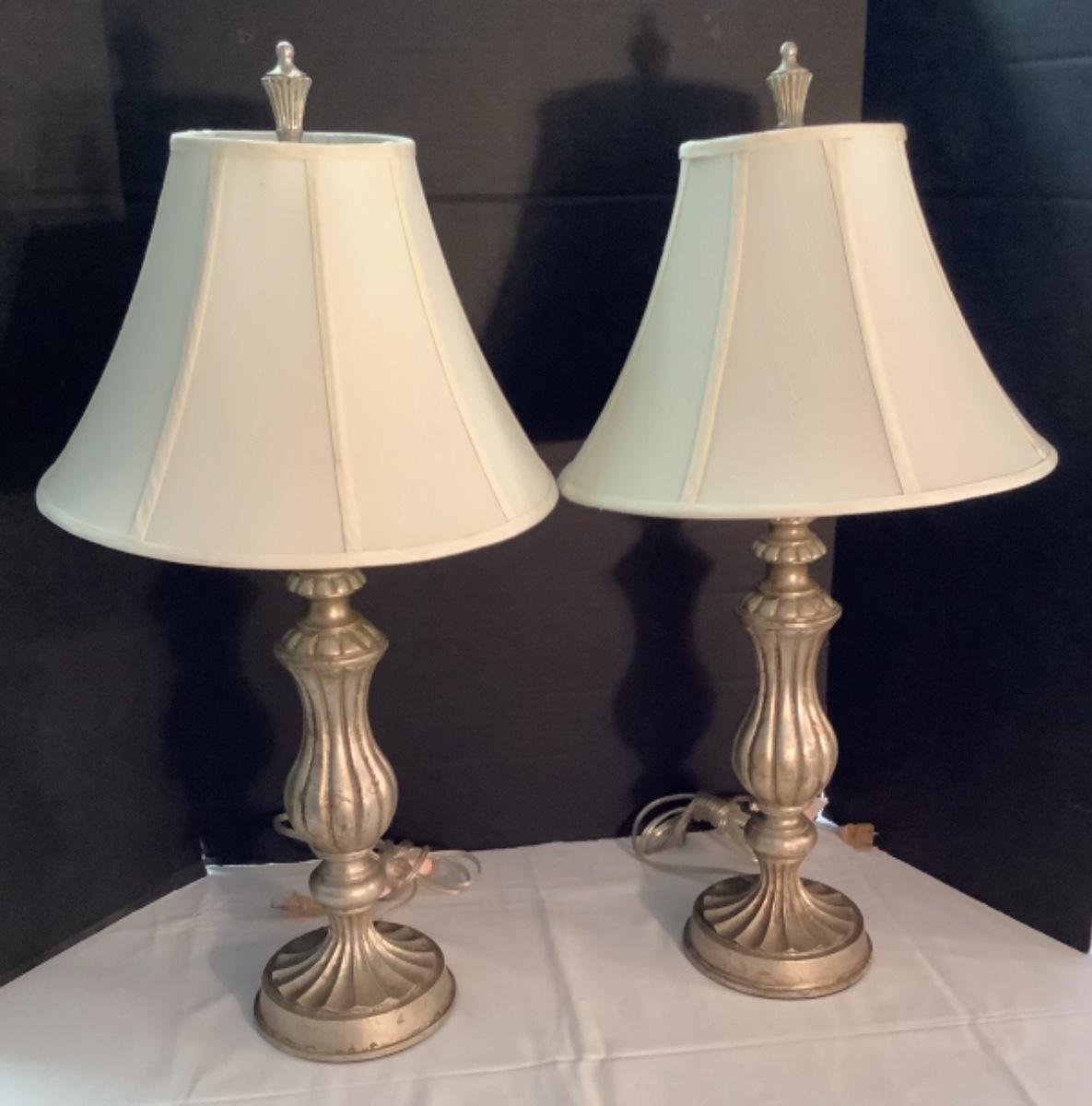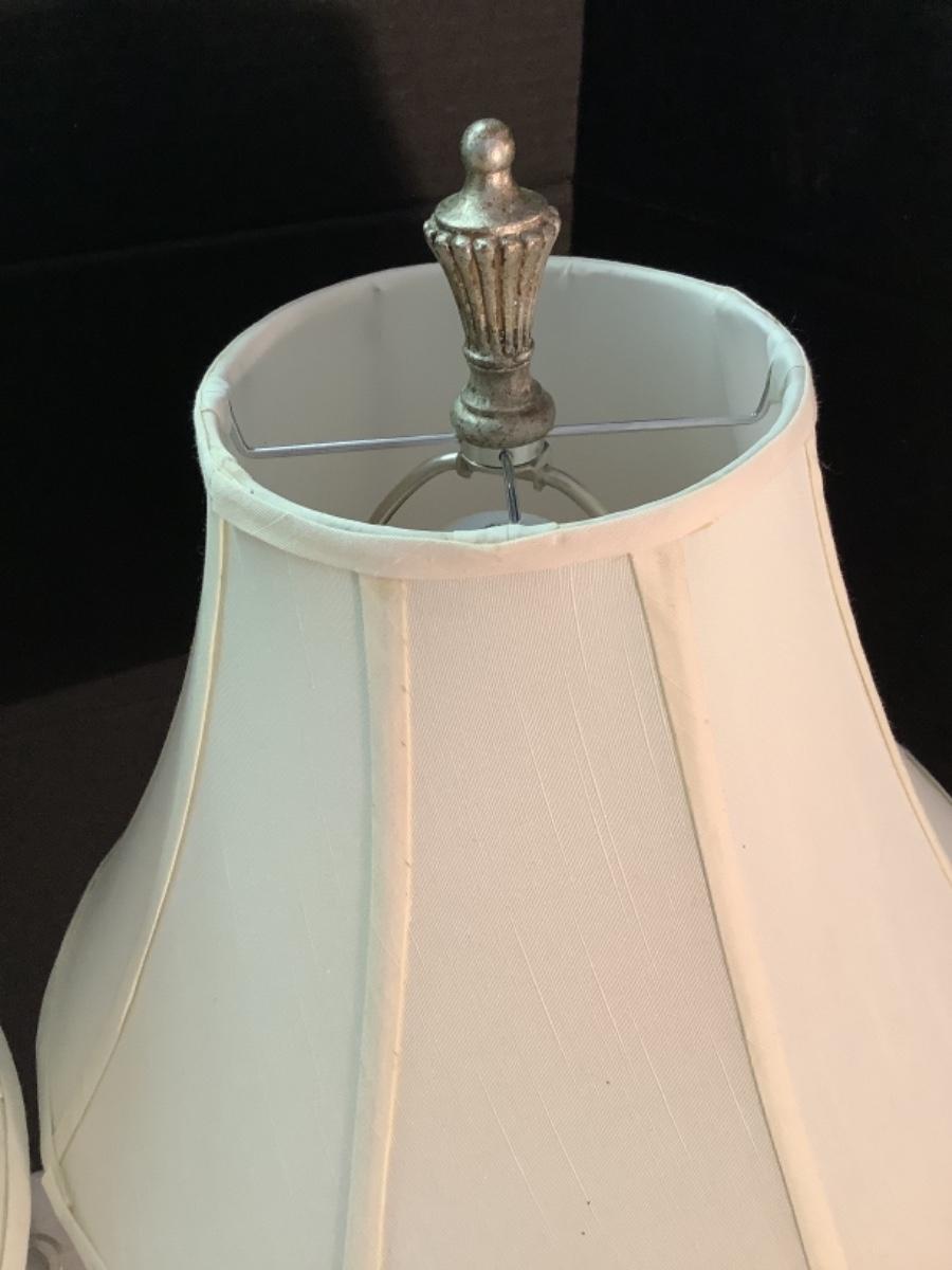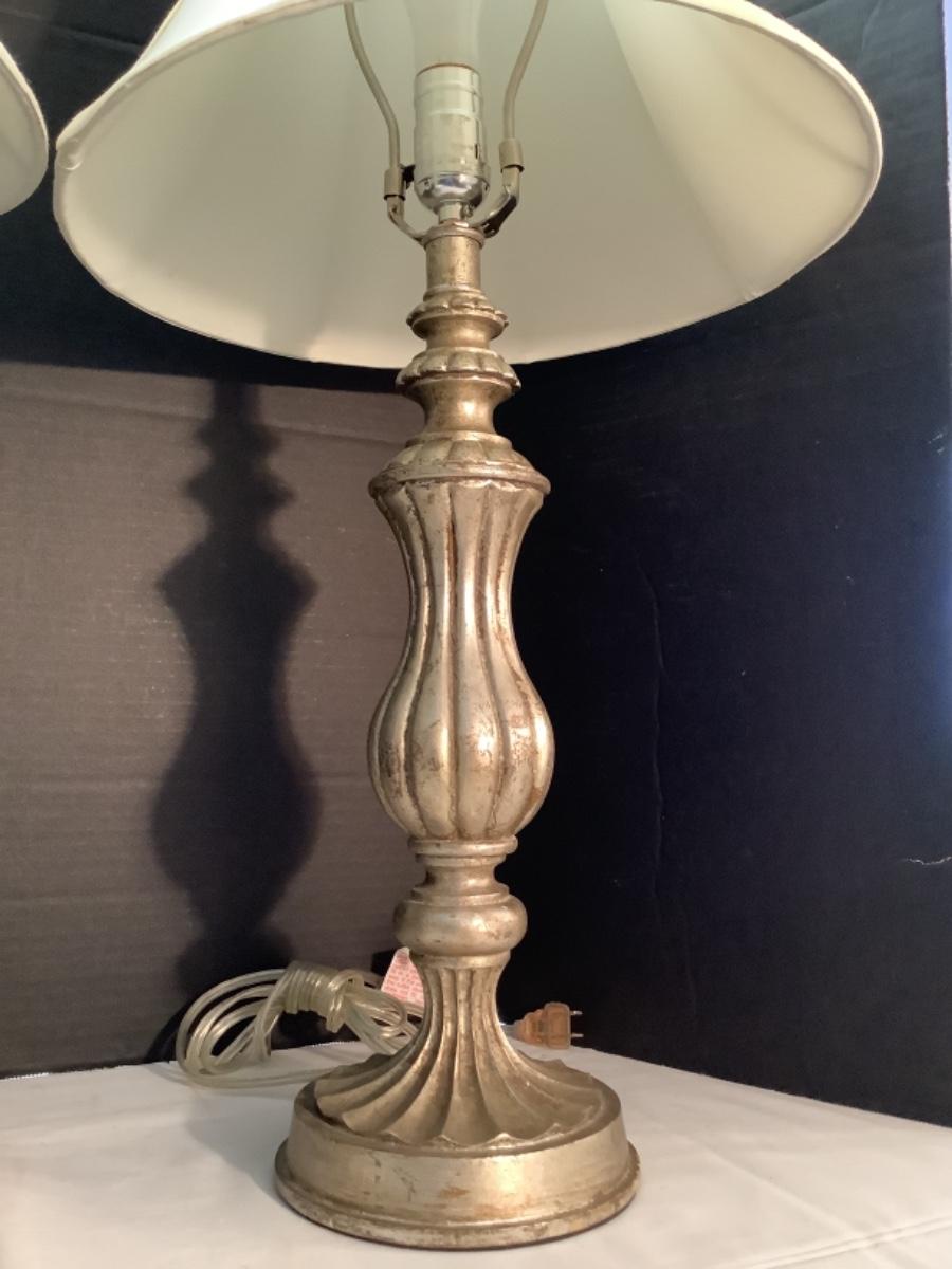 Pair of silver painted table lamps with lampshades measuring 27-1/2” tall