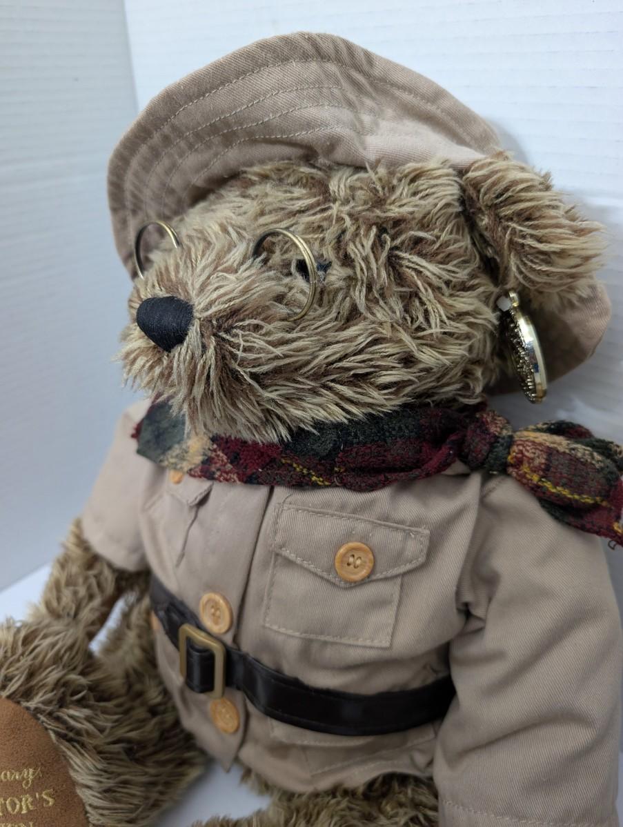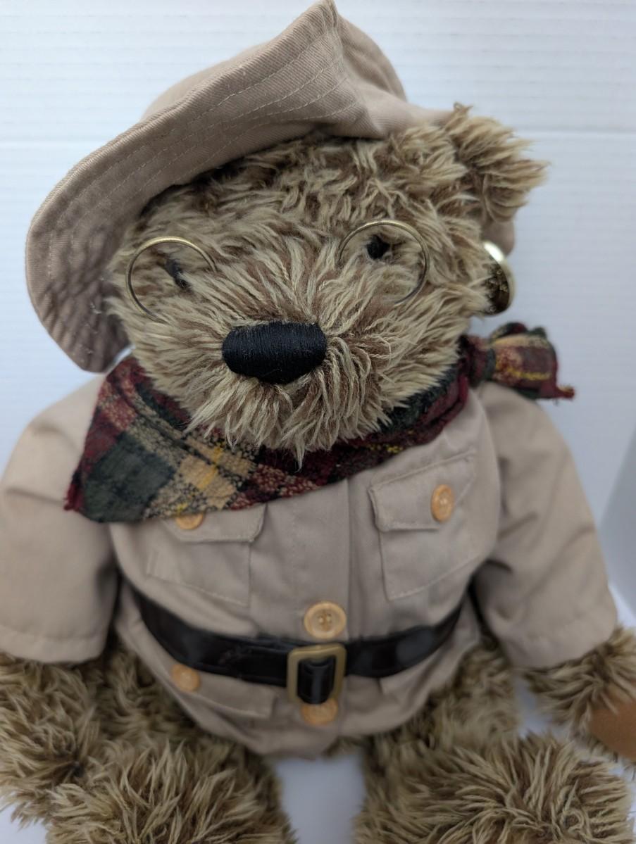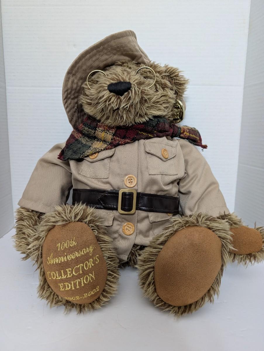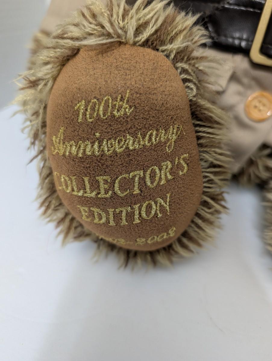 Special 100th Anniversary Collector’s Edition teddy bear dressed in a khaki explorer-style outfit with belt, plaid scarf, and round glasses. One paw is embroidered with “100th Anniversary Collector’s Edition 1902–2002,” marking its commemorative release. A charming plush keepsake that makes a wonderful display piece for bear collectors, anniversary editions, or vintage-inspired plush toys.