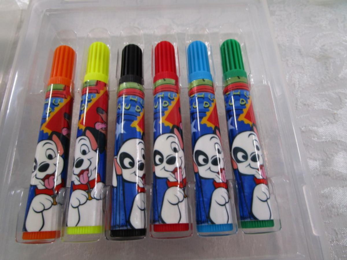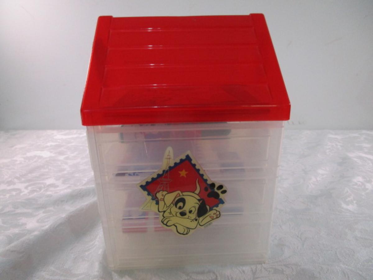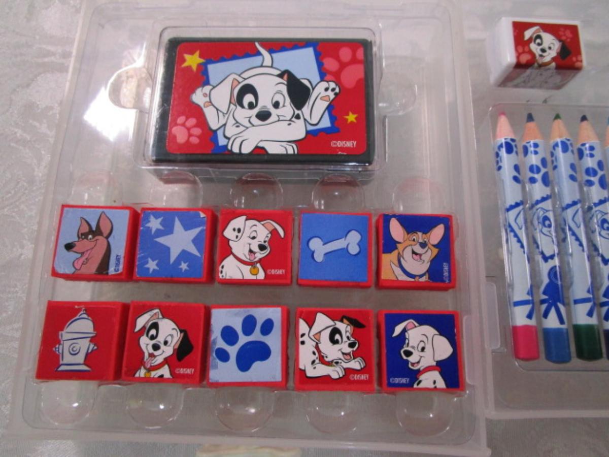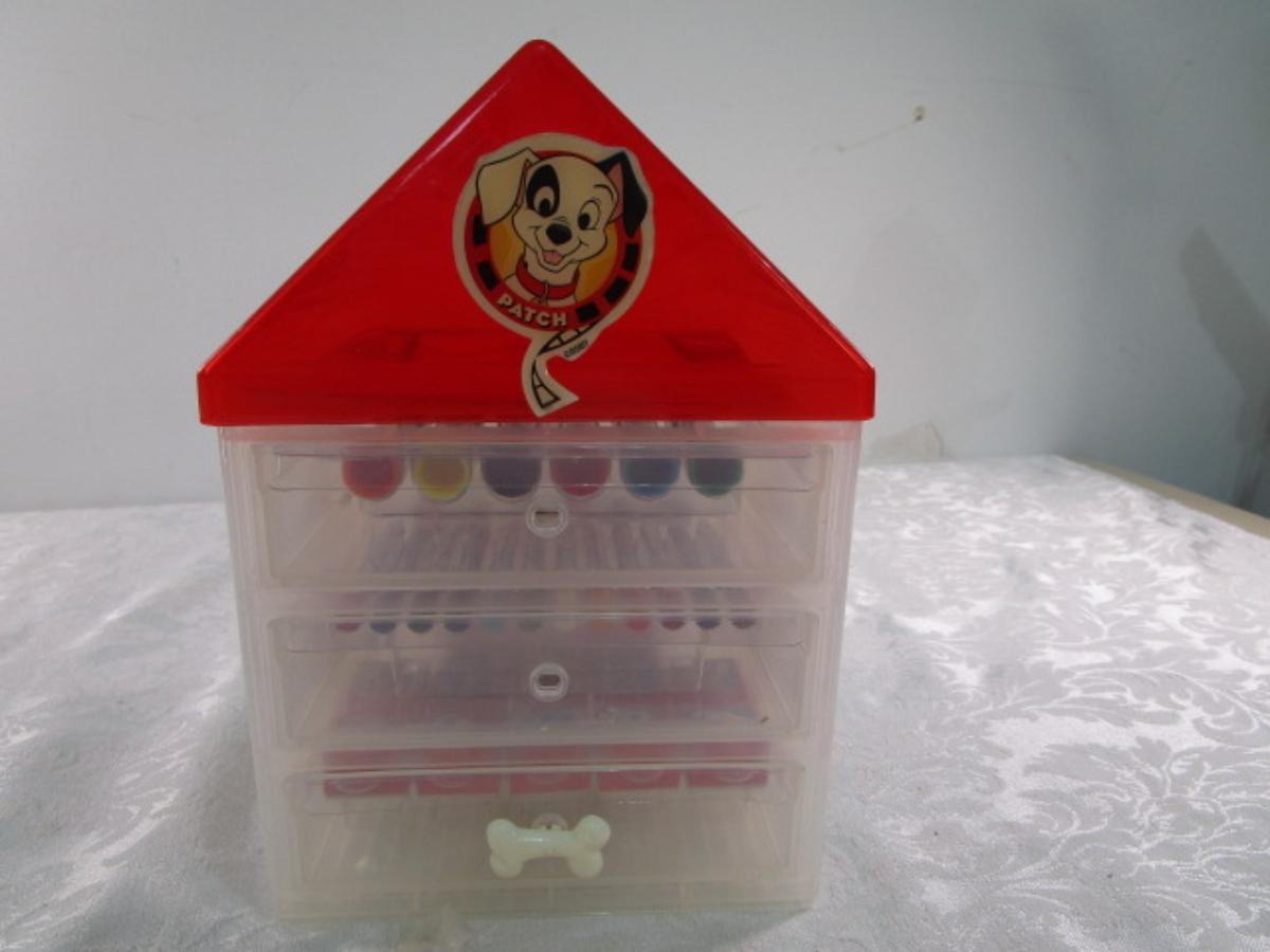 Has markers, rubber stamps, note pad, colored pencils, pencil sharpener & eraser. See pictures. Missing handles to two drawers.