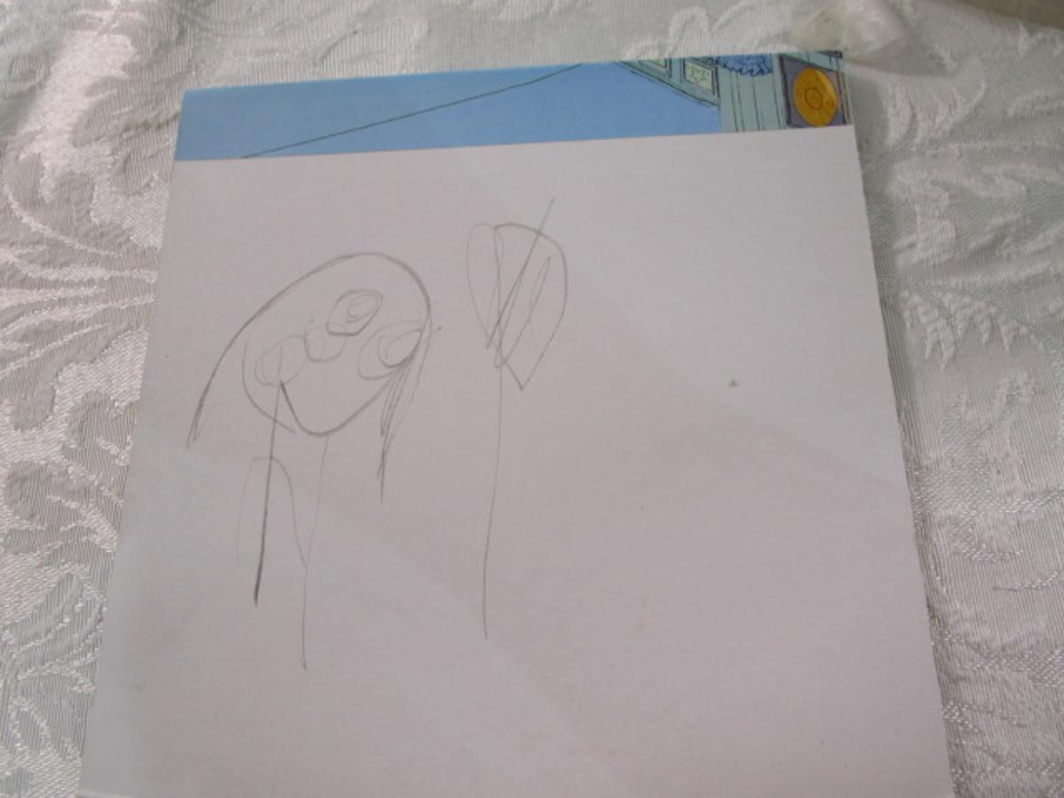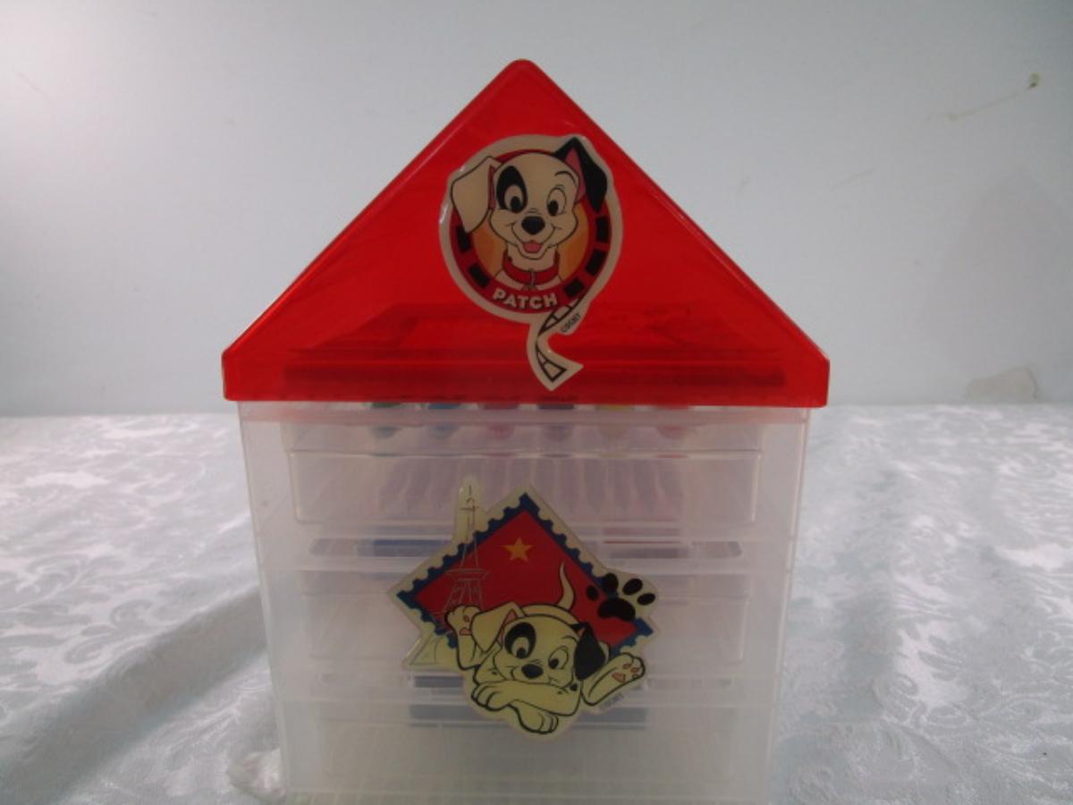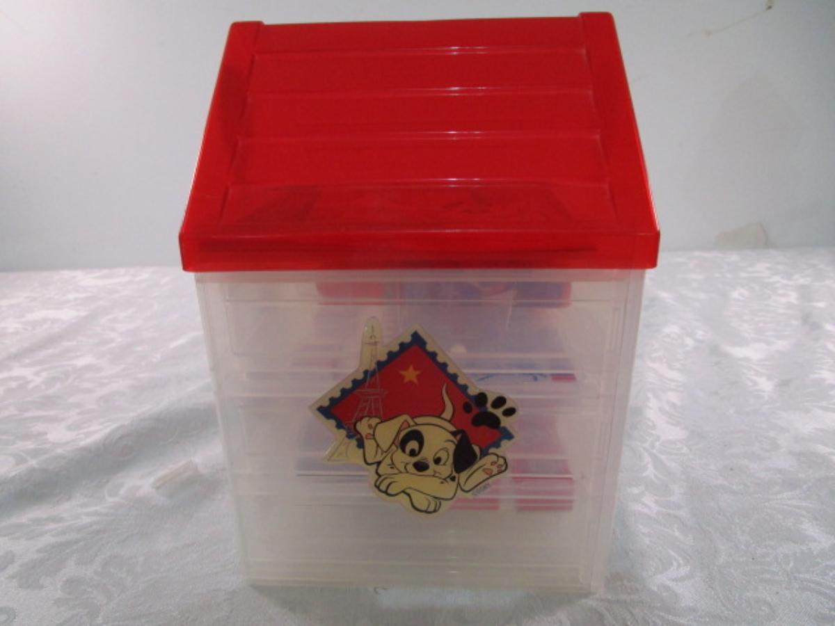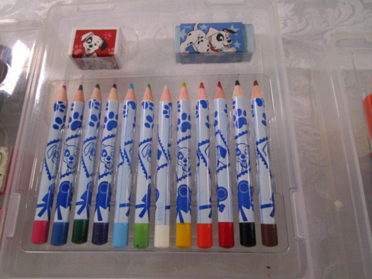 Has markers, rubber stamps, note pad, colored pencils, pencil sharpener & eraser. See pictures. Missing handles to two drawers.