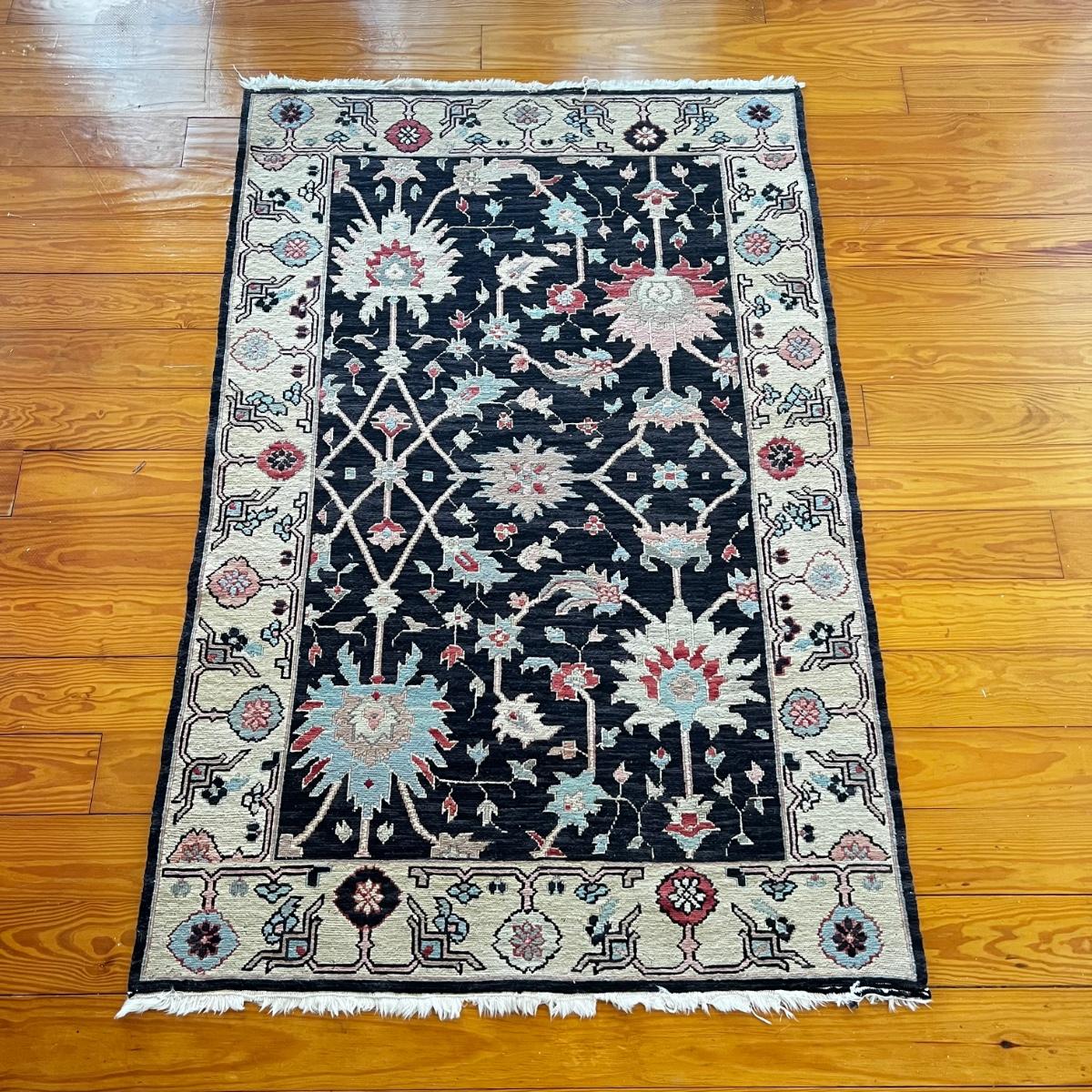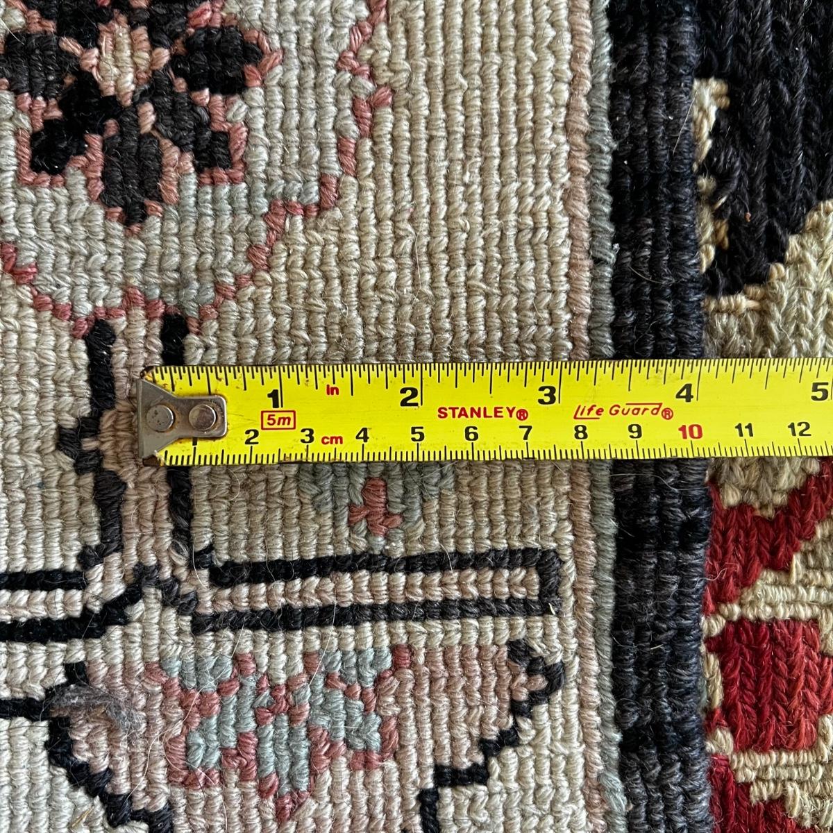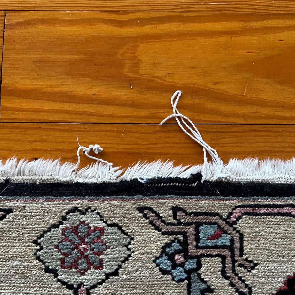 Flat weave rug with small areas with thread slippage on fringe.