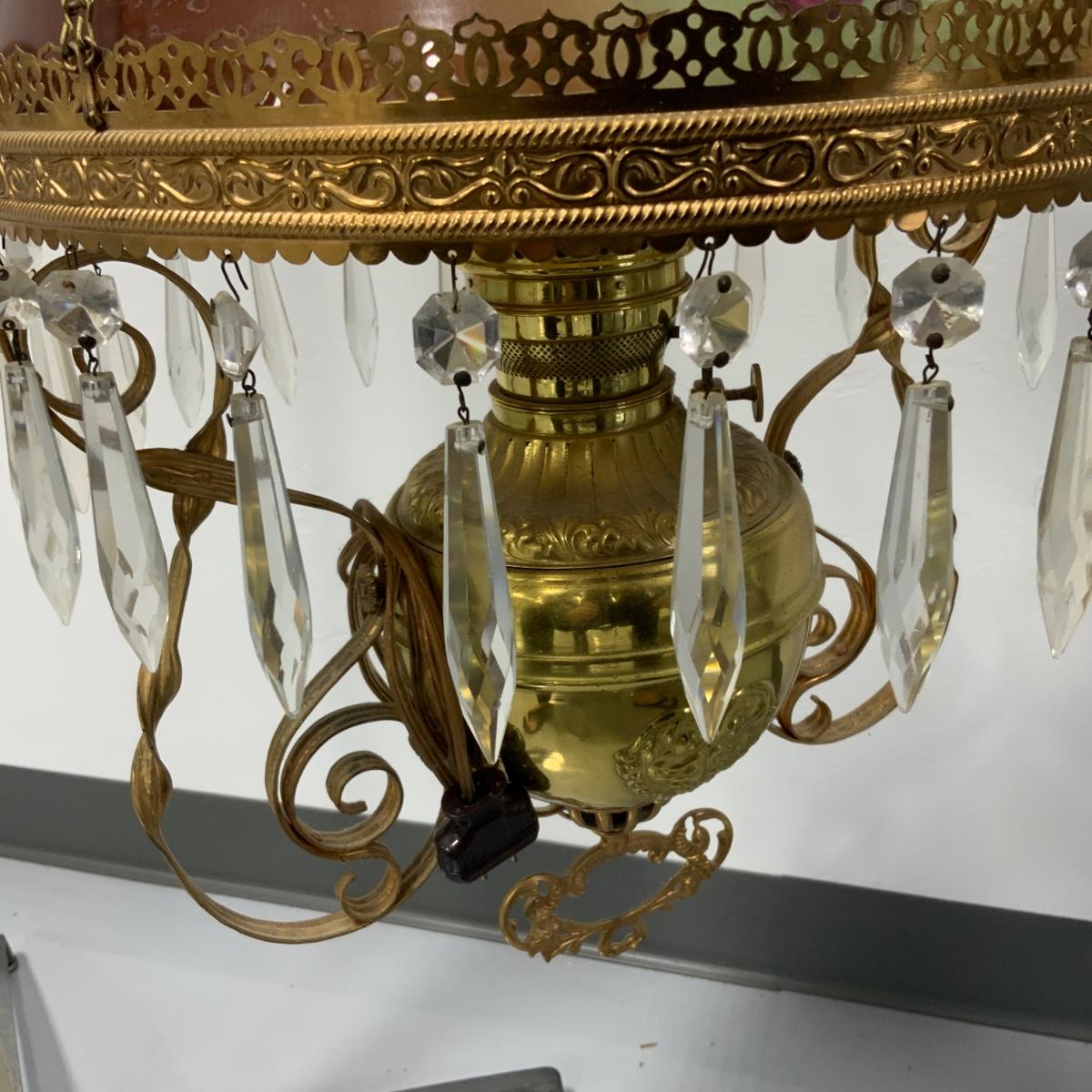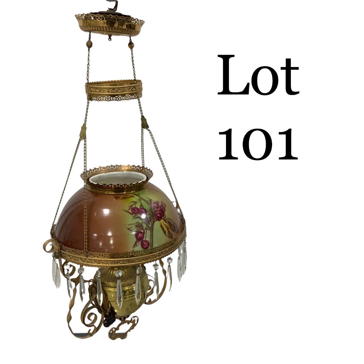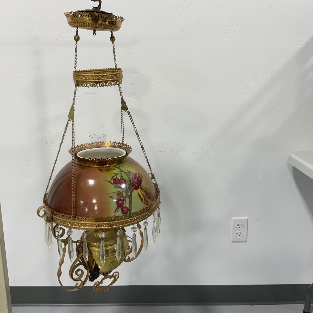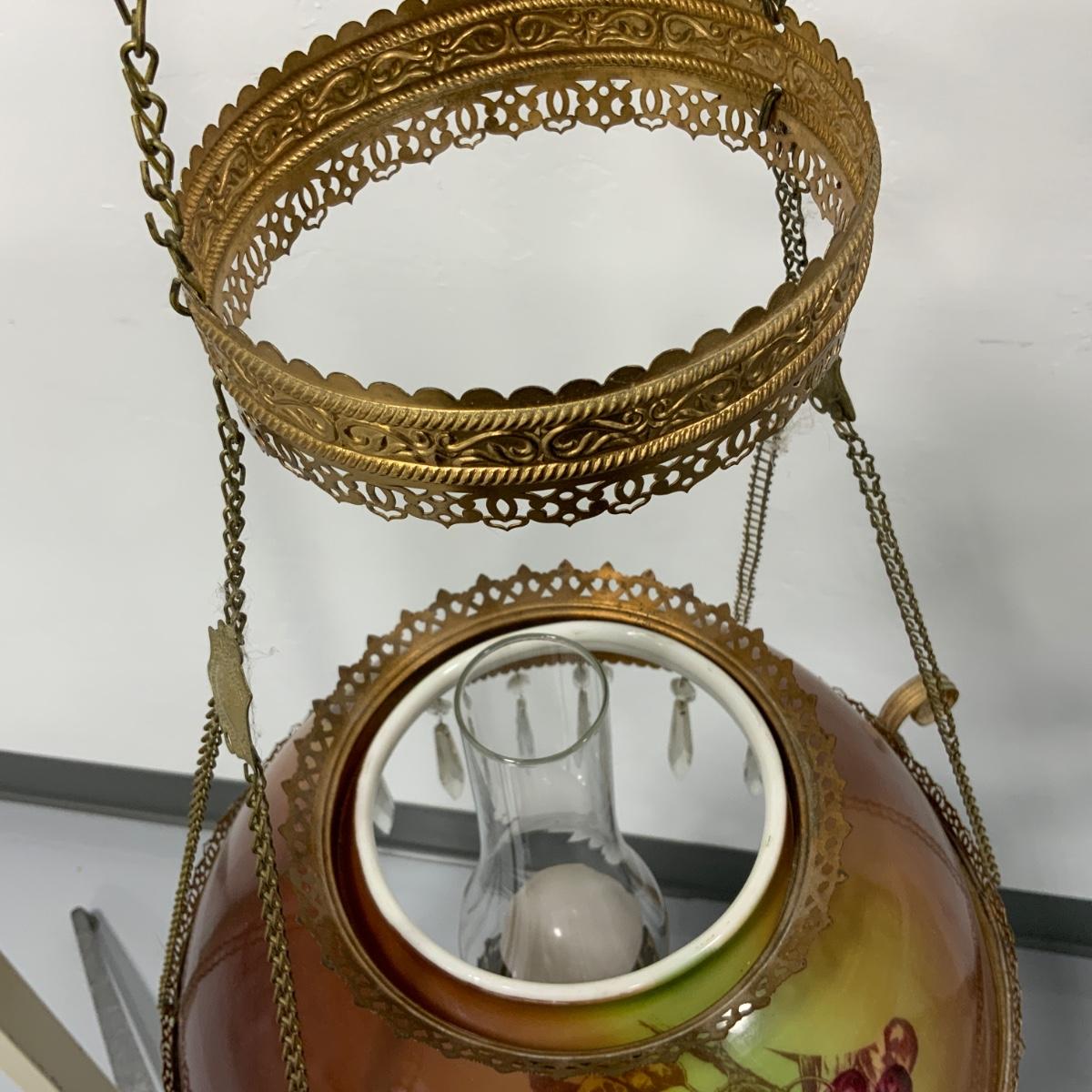 Attractive Burnished Metal on this Electrified Hanging Lamp. Shade is Hand Painted and in beautiful condition. As it hangs here it measures 36” long and 18” at it’s widest. Please see photos for details and condition. ::: Shipping is NOT available on this lot. If you have any questions regarding this lot please contact the auctioneer either via this website, by direct email or by phone. PICK UP TIMES and other important information can be found in the TERMS and DESCRIPTION of the auction. Please take a look for pertinent information. Thanks!
