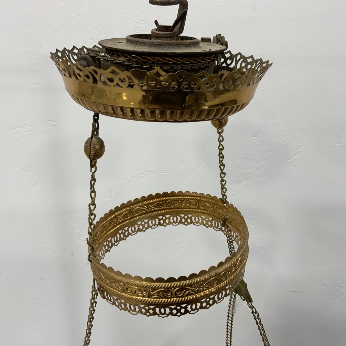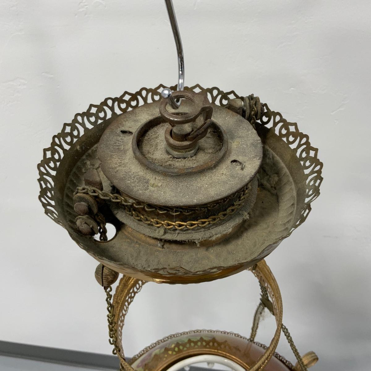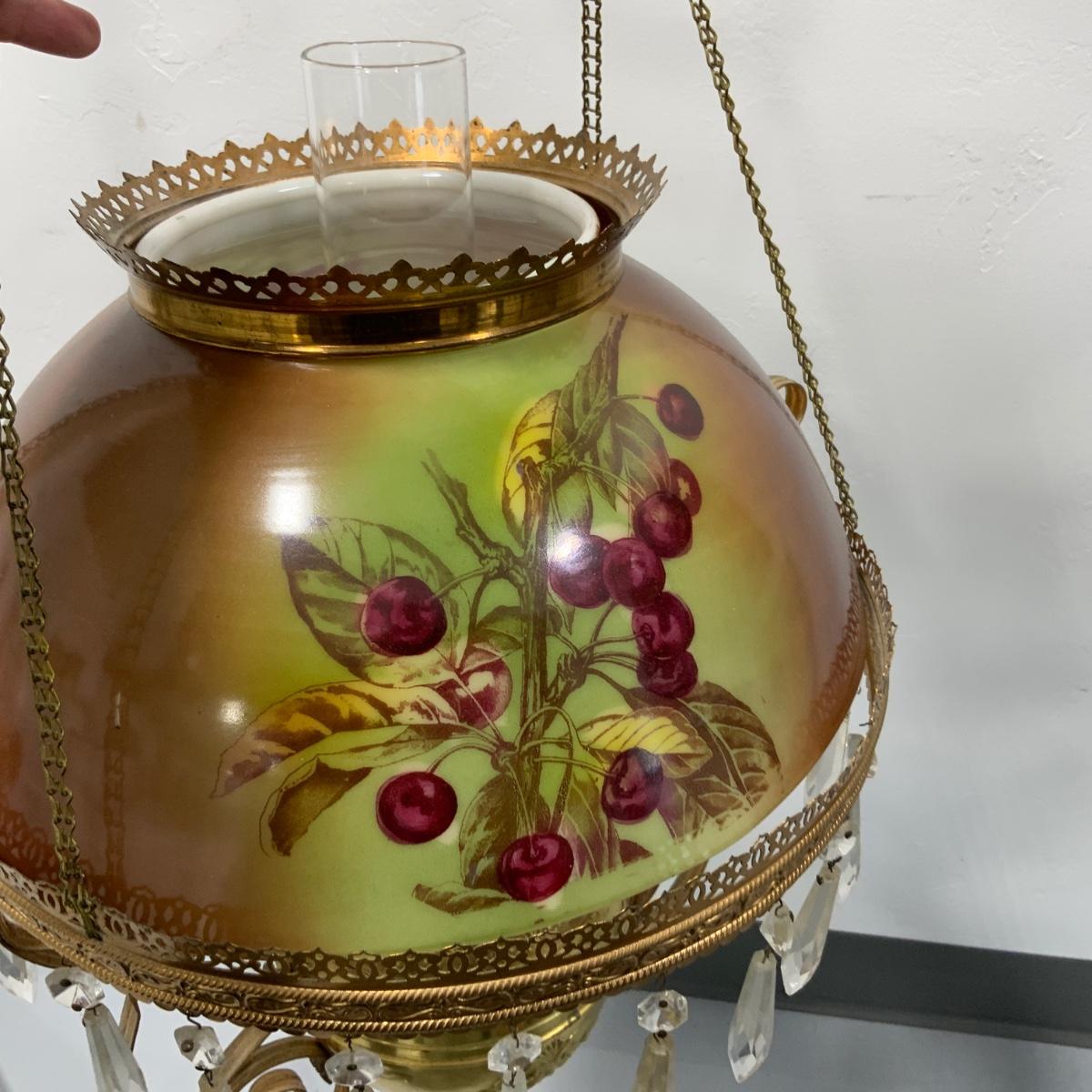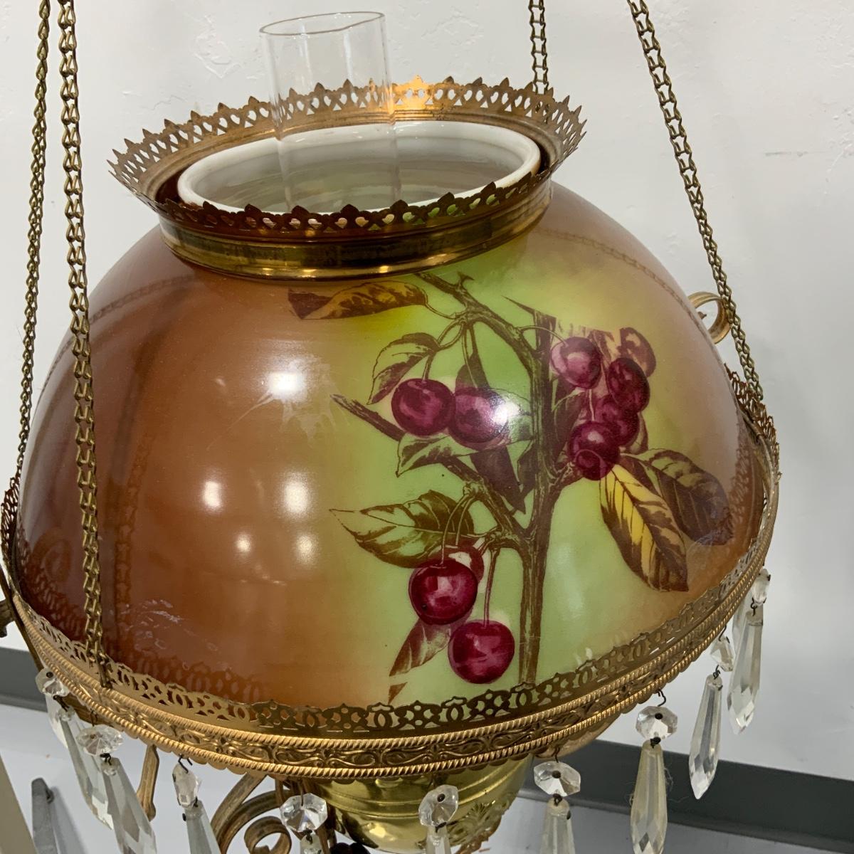 Attractive Burnished Metal on this Electrified Hanging Lamp. Shade is Hand Painted and in beautiful condition. As it hangs here it measures 36” long and 18” at it’s widest. Please see photos for details and condition. ::: Shipping is NOT available on this lot. If you have any questions regarding this lot please contact the auctioneer either via this website, by direct email or by phone. PICK UP TIMES and other important information can be found in the TERMS and DESCRIPTION of the auction. Please take a look for pertinent information. Thanks!