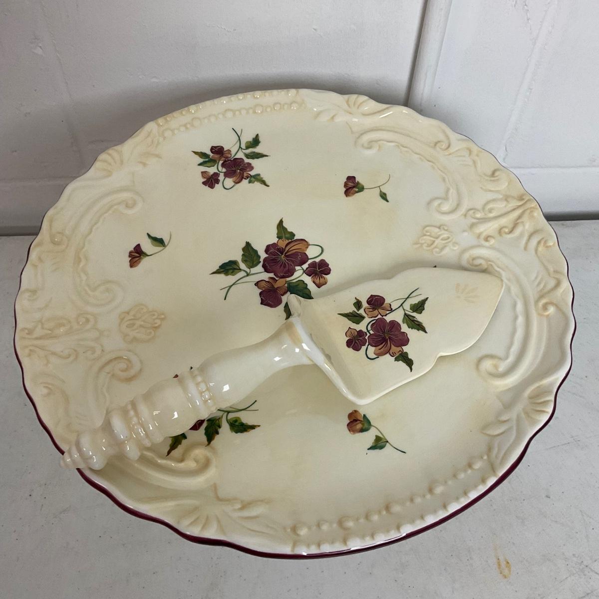 1011 Very Large Painted Floral Pedestal Cake Plate with Server