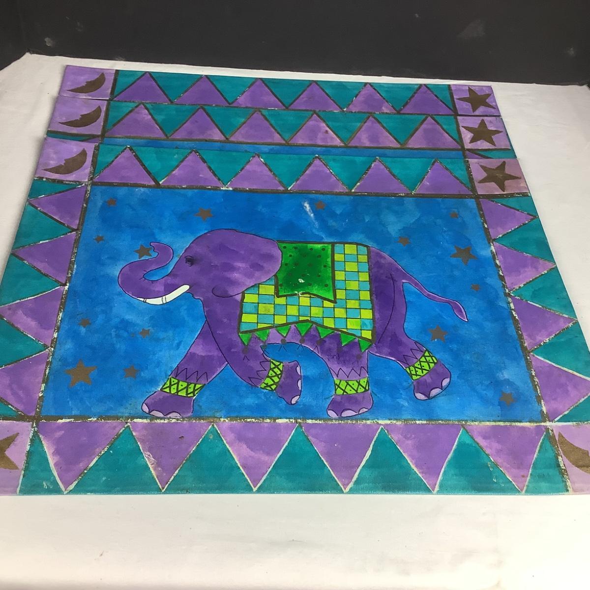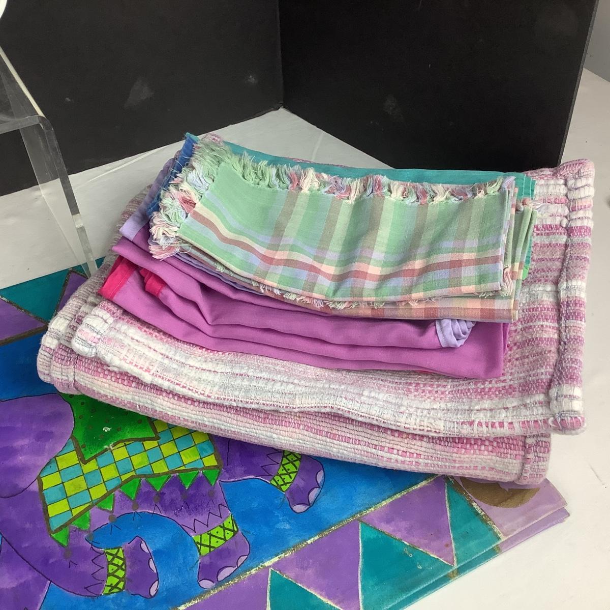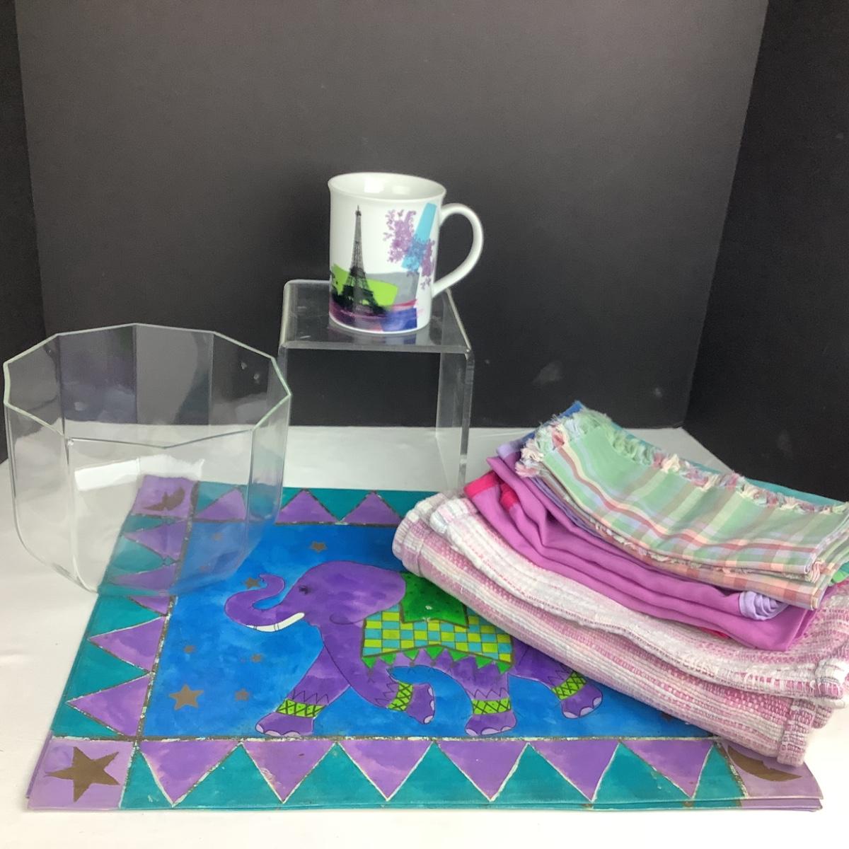 Lot of handpainted elephant placemats, napkins , with glass bowl and paris coffee mug