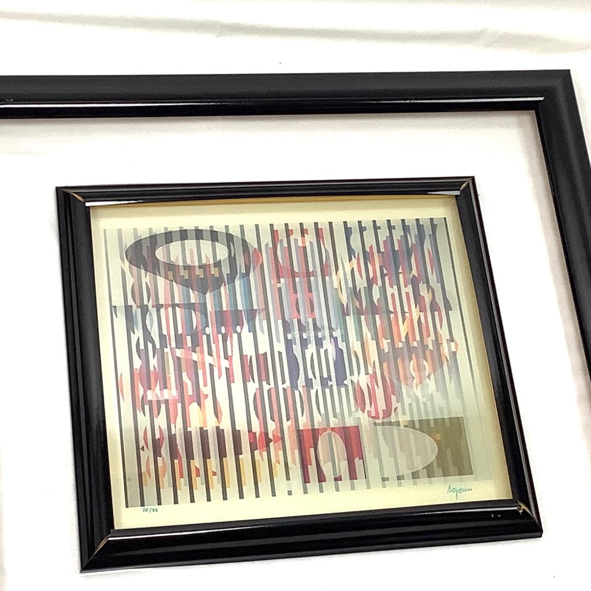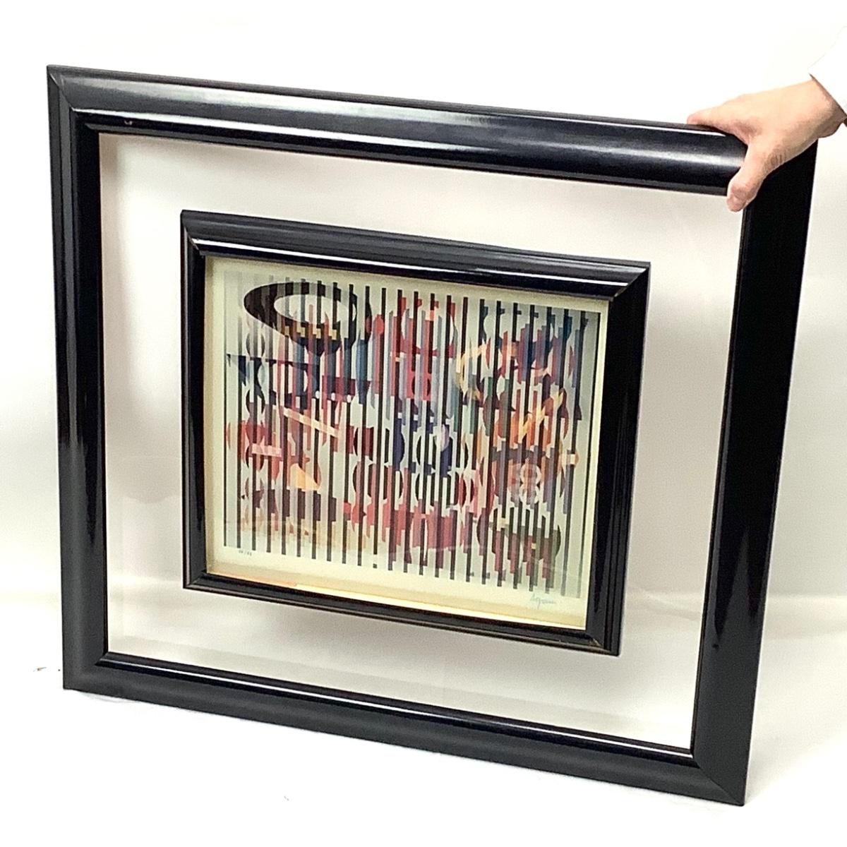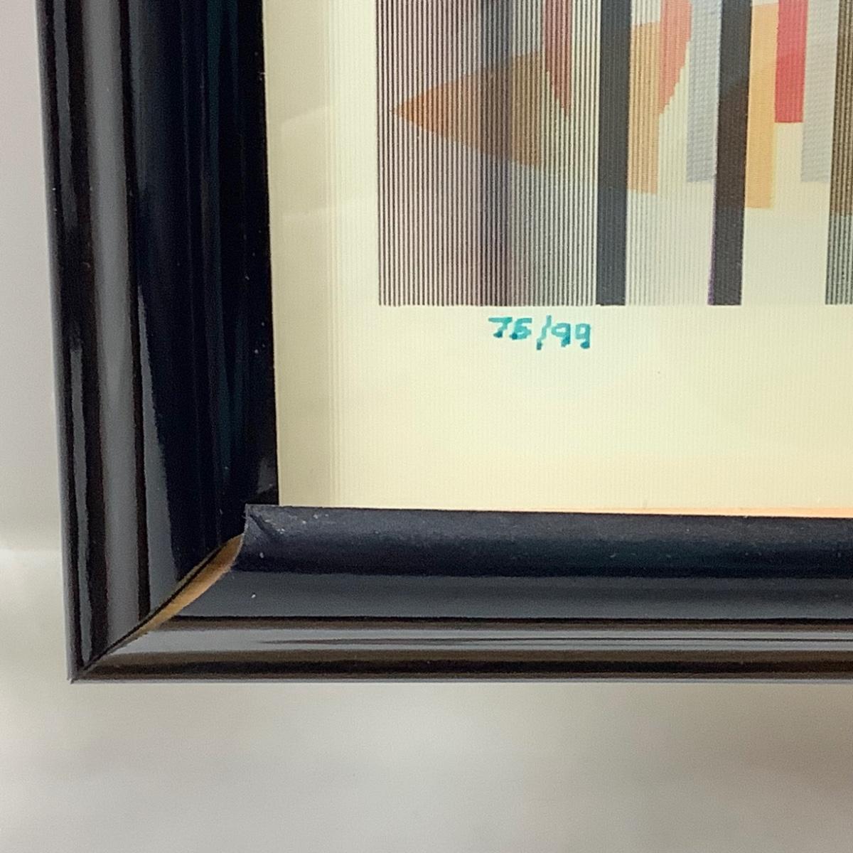 The art measures 27" wide x 24.5" high, signed by artist Agam and numbered 75/99. The inner metal frame has some spots of damage. The artist Yaacov Agam is an Israeli artist best known for pioneering Kinetic art. His lenticular prints, knowns as Agamographs make illusory images appear depending on the view point. He has been quoted explaining his heart "My aim is to show what can be seen within the limits of possibility which exists in the midst of coming into being." His works grace the walls of numerous influential art museums including the Metropolitan Museum of Art in New York.