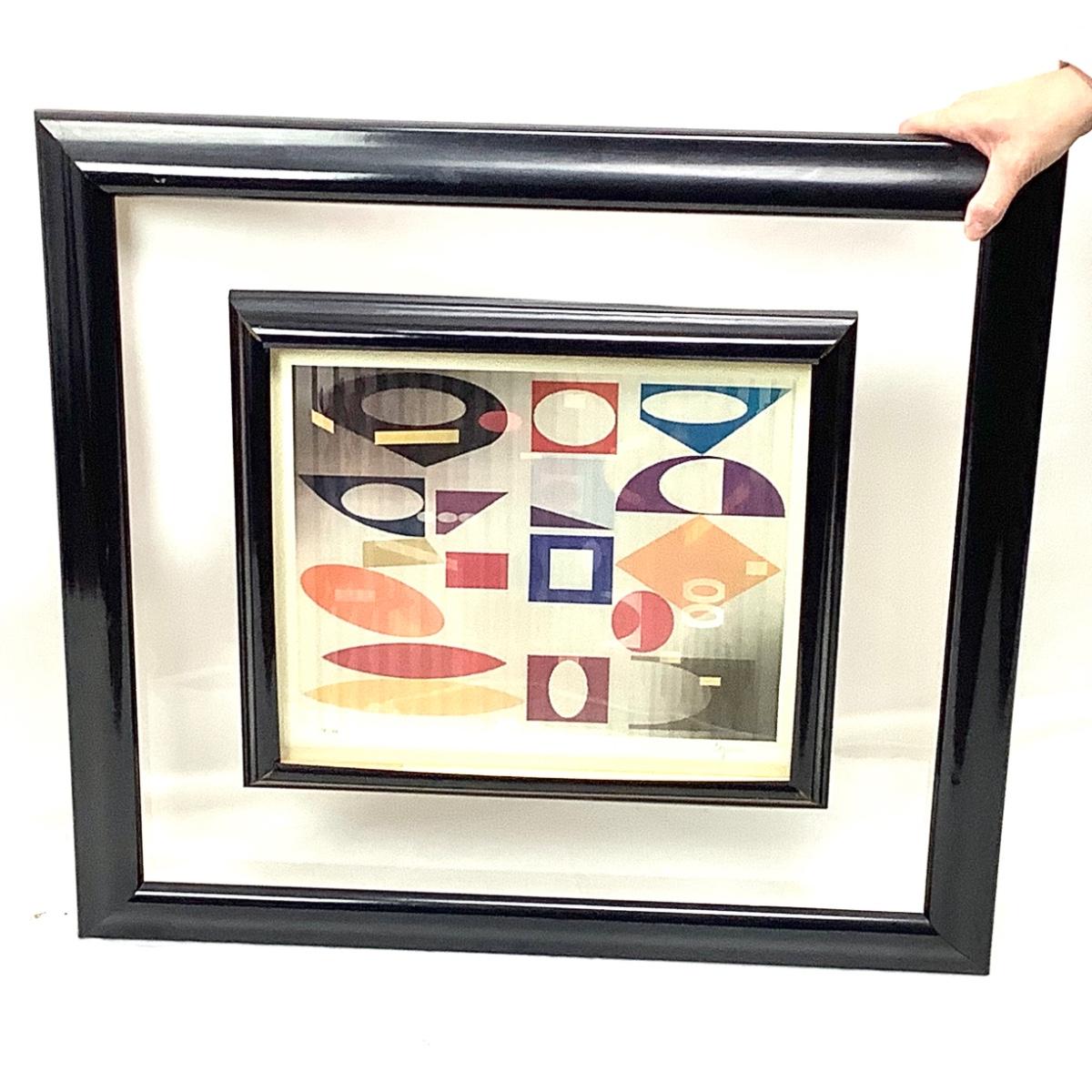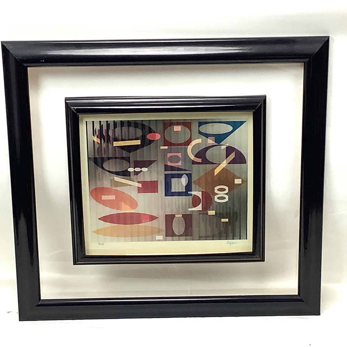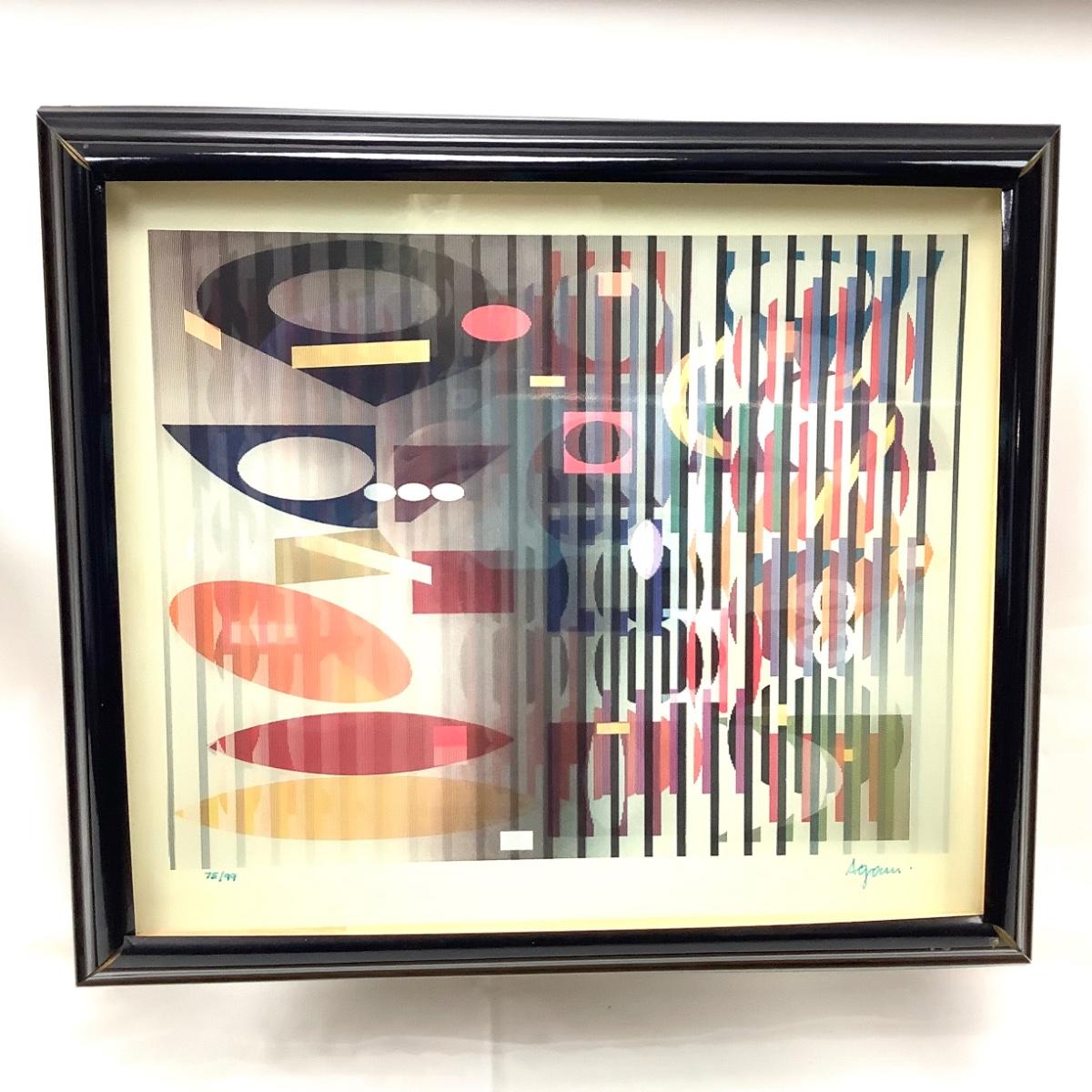 The art measures 27" wide x 24.5" high, signed by artist Agam and numbered 75/99. The inner metal frame has some spots of damage. The artist Yaacov Agam is an Israeli artist best known for pioneering Kinetic art. His lenticular prints, knowns as Agamographs make illusory images appear depending on the view point. He has been quoted explaining his heart "My aim is to show what can be seen within the limits of possibility which exists in the midst of coming into being." His works grace the walls of numerous influential art museums including the Metropolitan Museum of Art in New York.