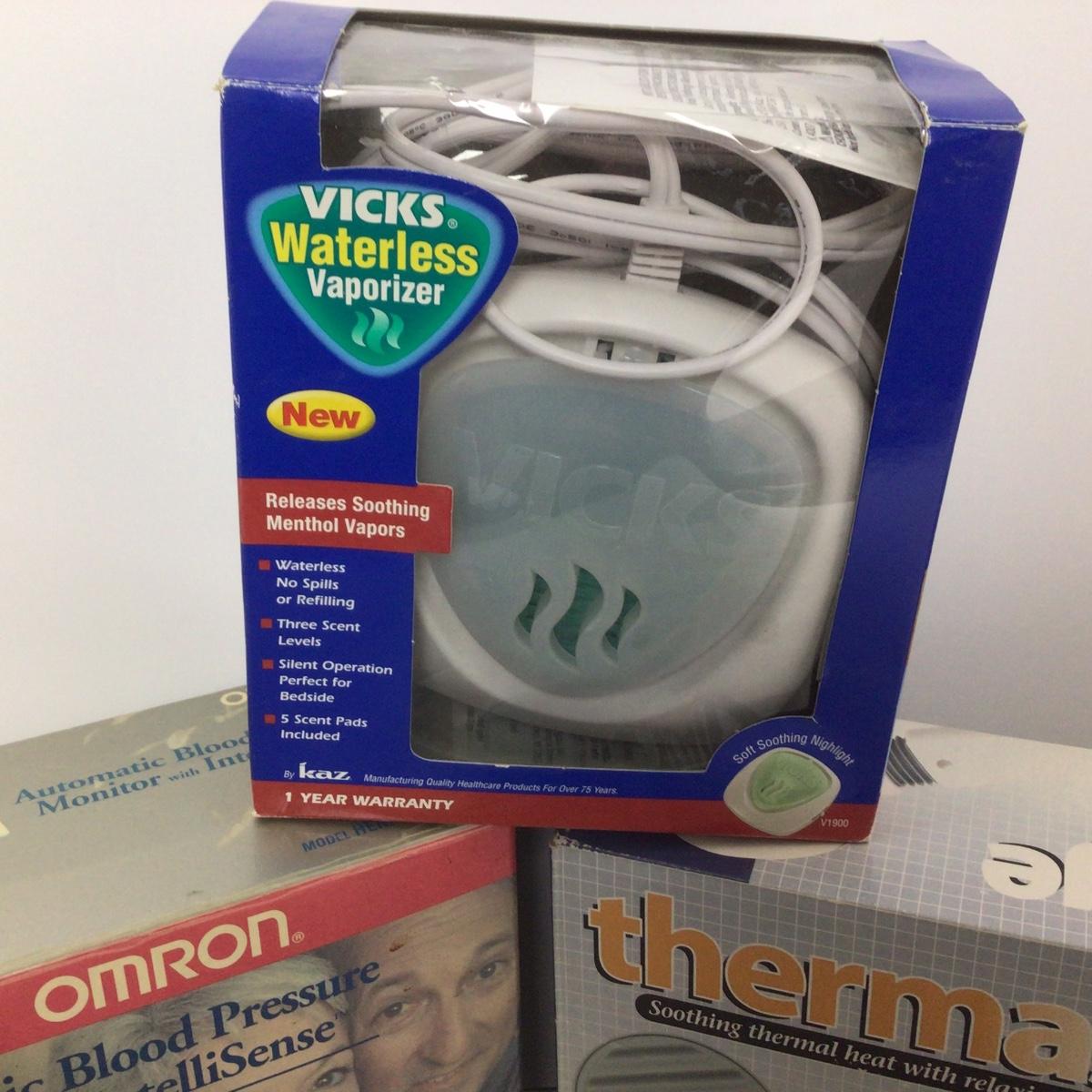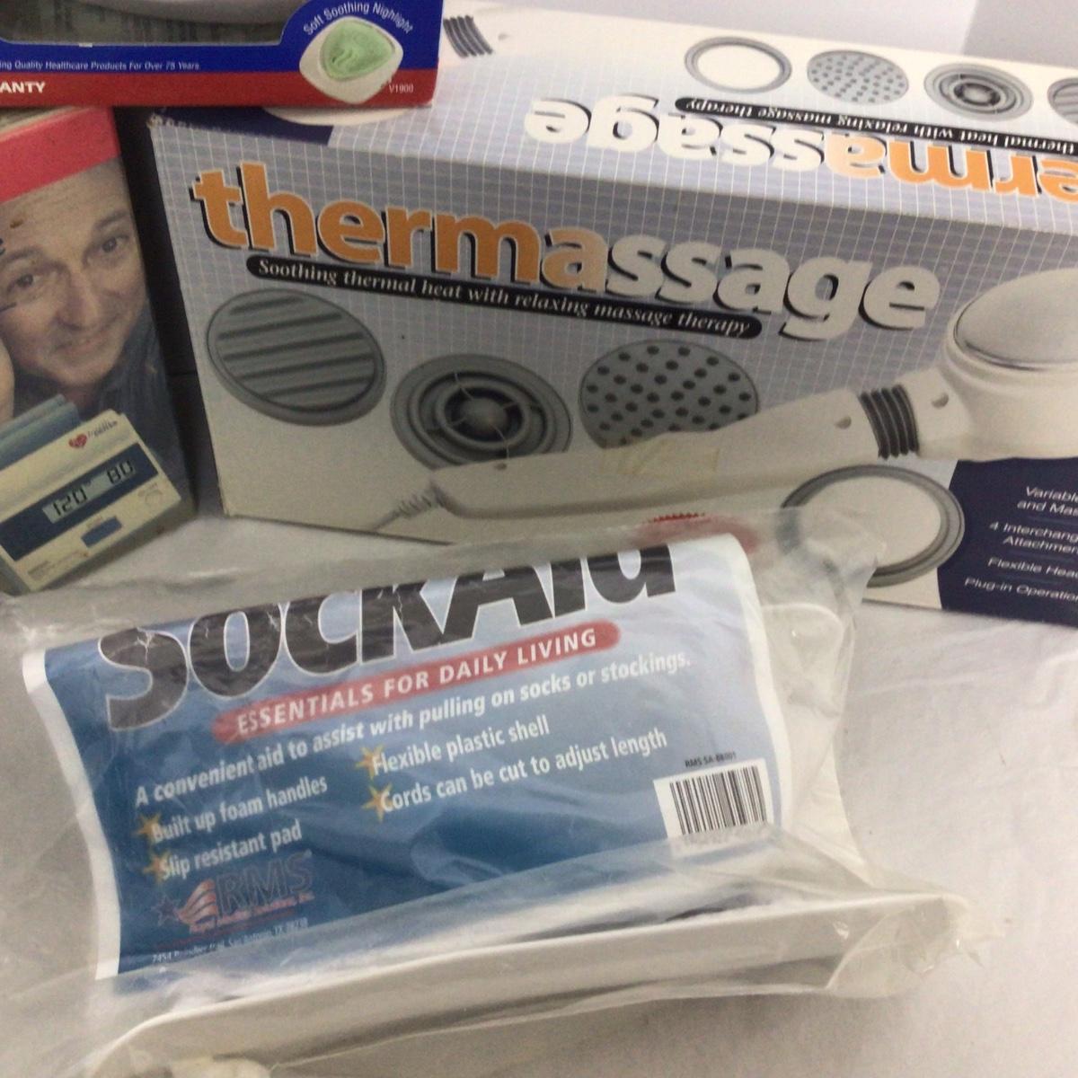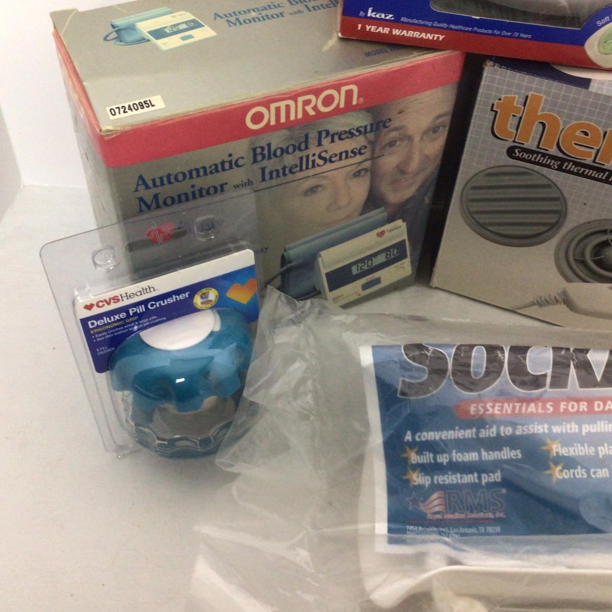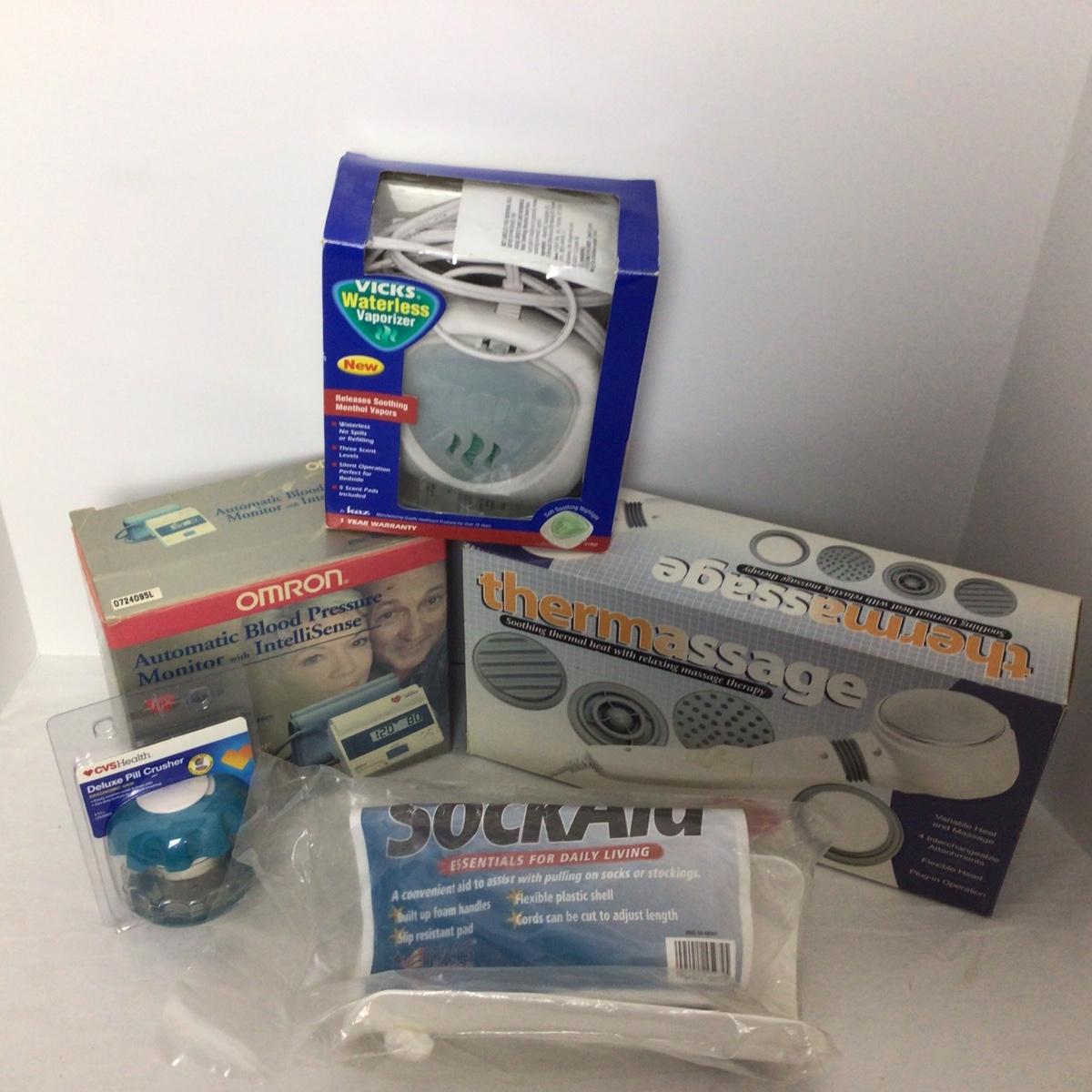 Lot contains blood pressure monitor, sock aid, vaporizer.