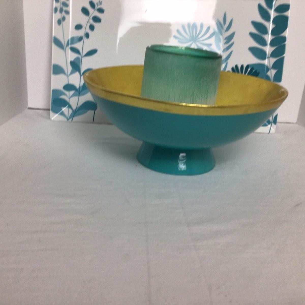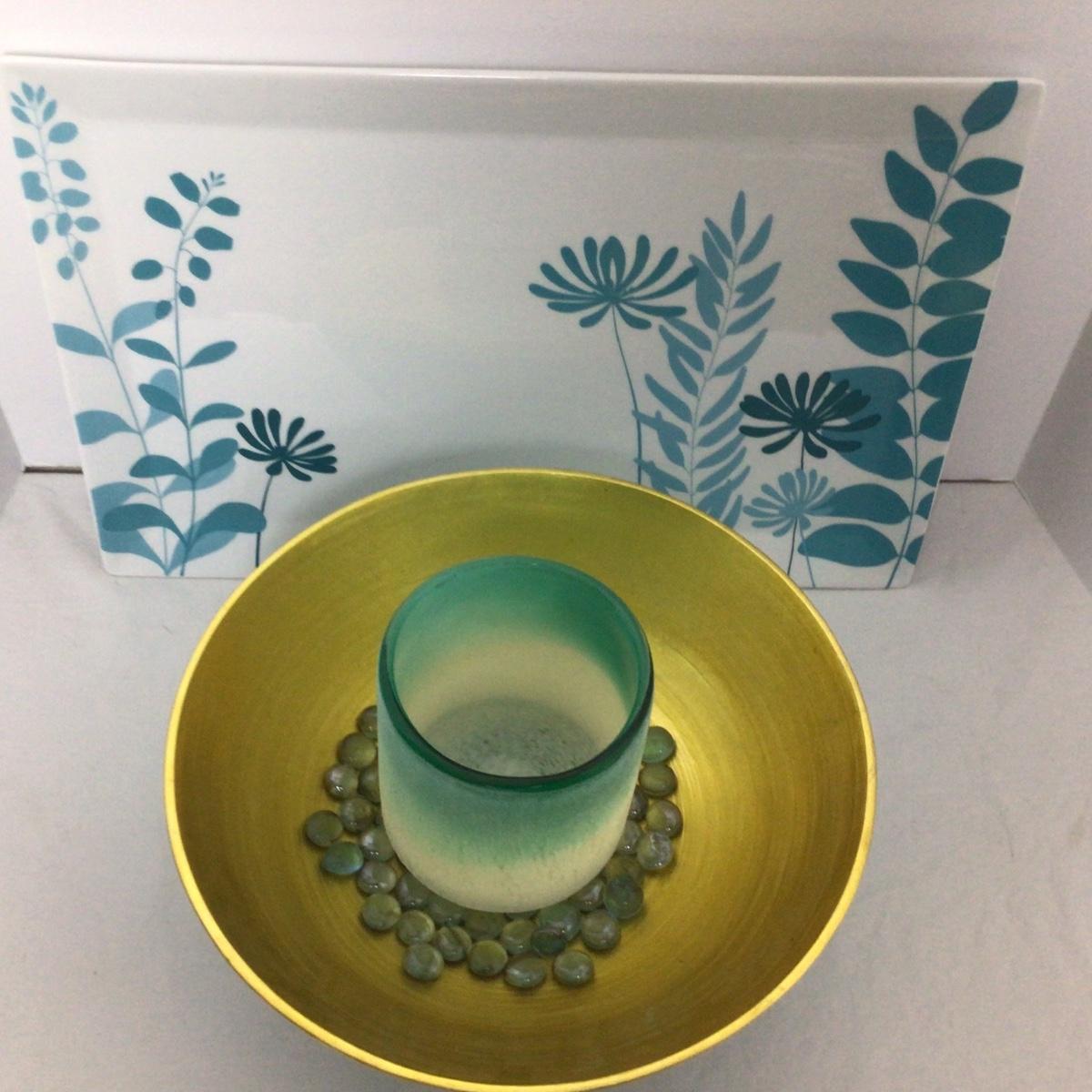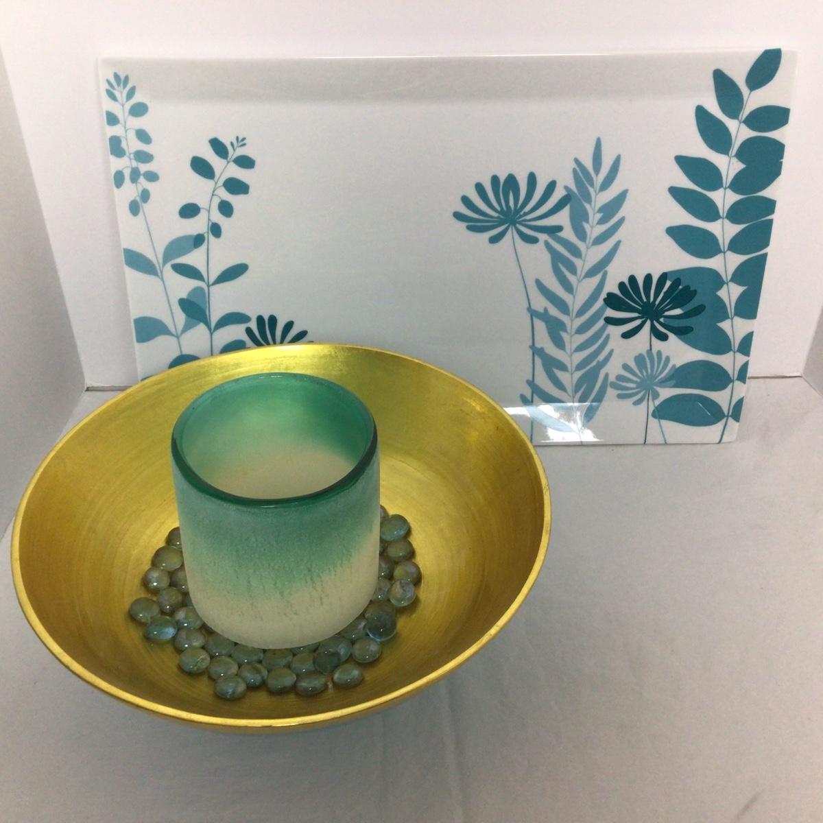 The tray is by Cellar, gold tone bowl with blue candle holder.