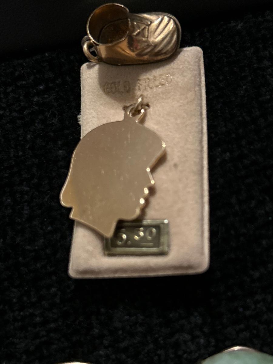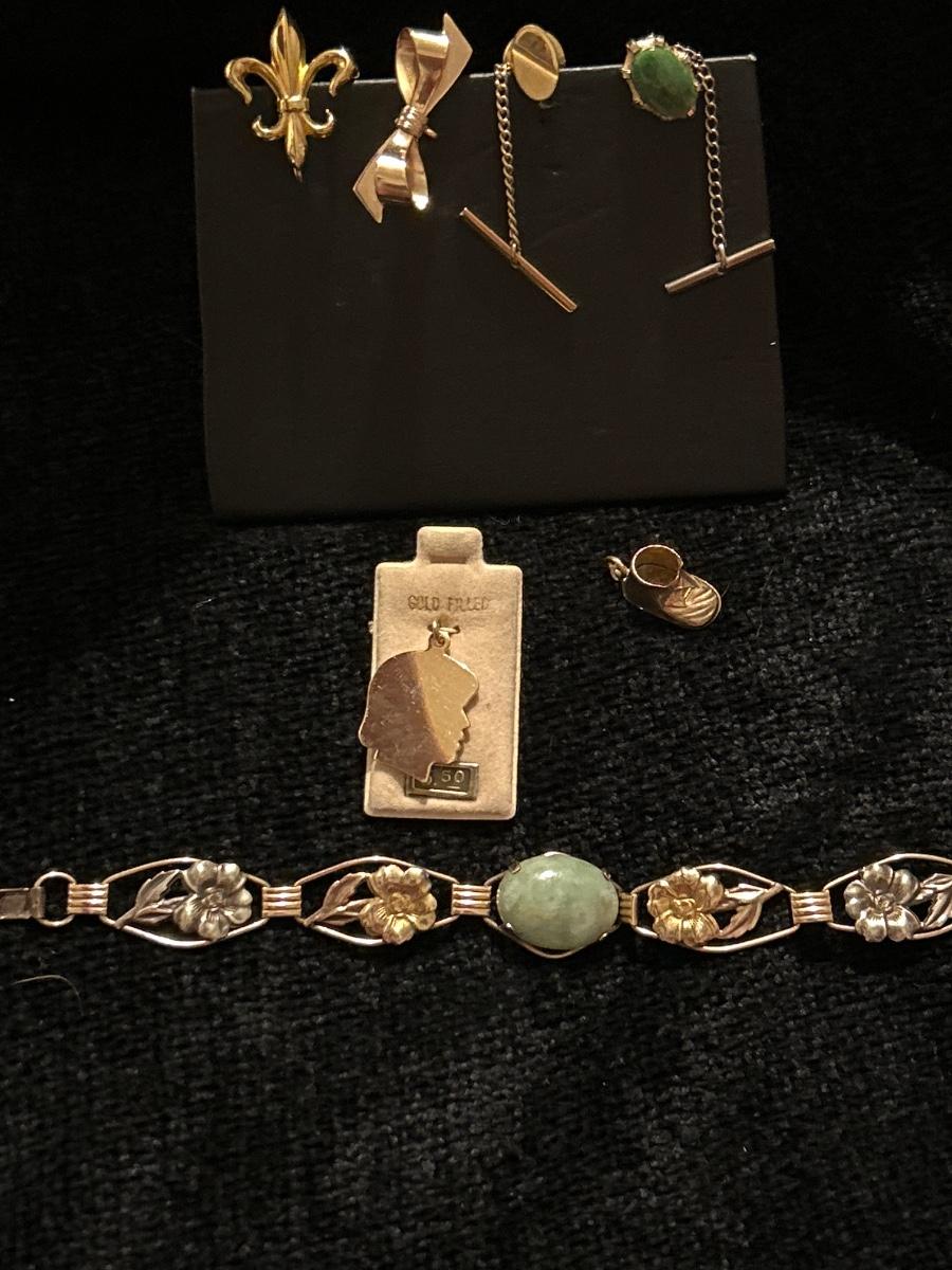 2 pins, 2 tie tacks, 2 charms & 1 bracelet-not sure what the center stone is.
