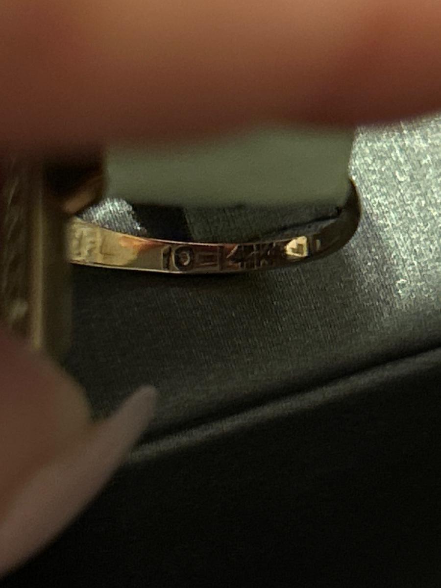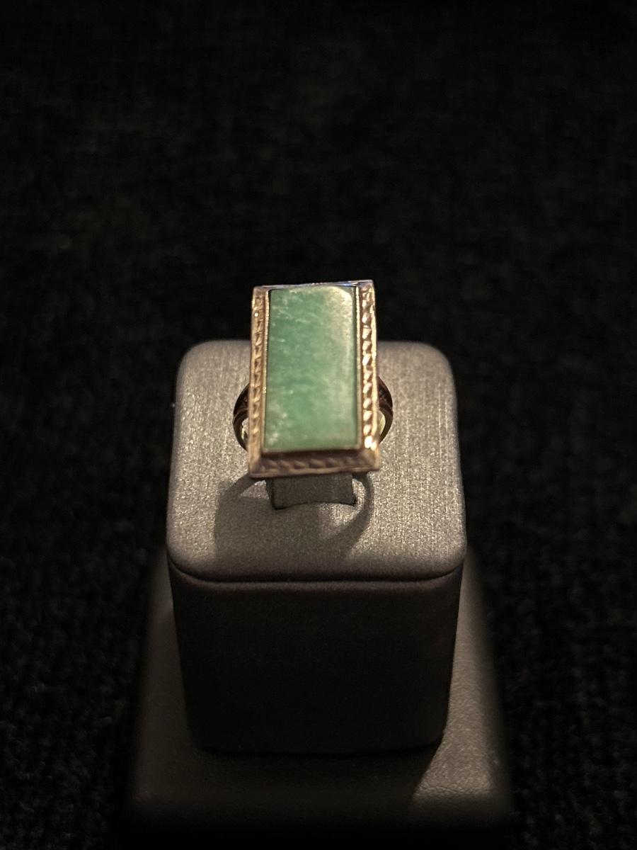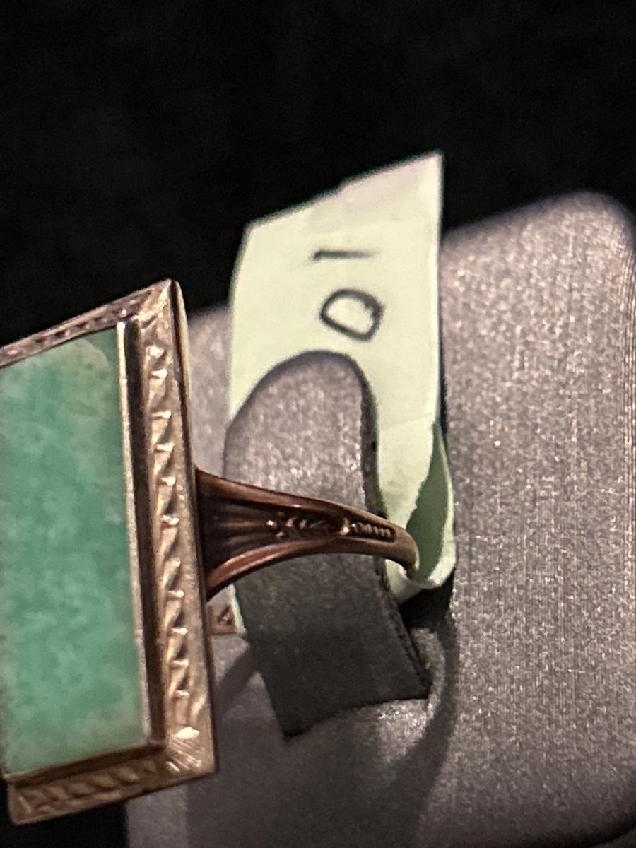 This is also an art deco piece with a beautiful, greenish-blue colored center stone. It looks yellow gold to me.