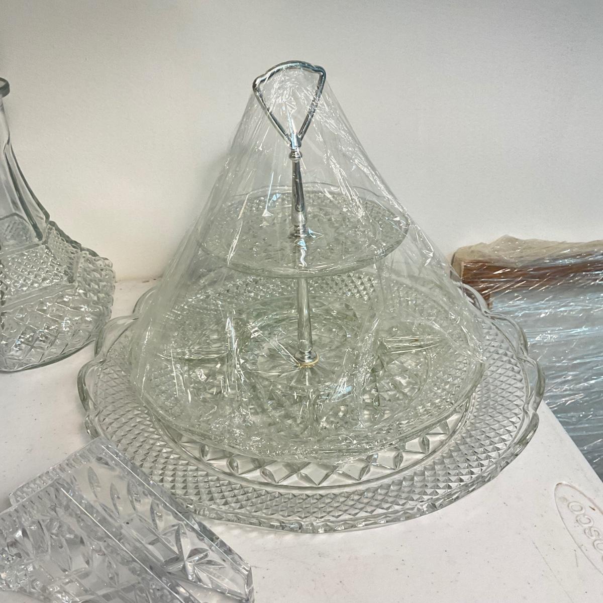 silver-plated bowl, two tier serving dish, decanter, pedestal dish and 2 crystal Shannon napkin holders