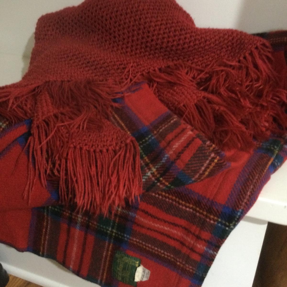 Red shawl is handmade, the red tartan blanket is made by Archie Brown & Son in Bermuda.