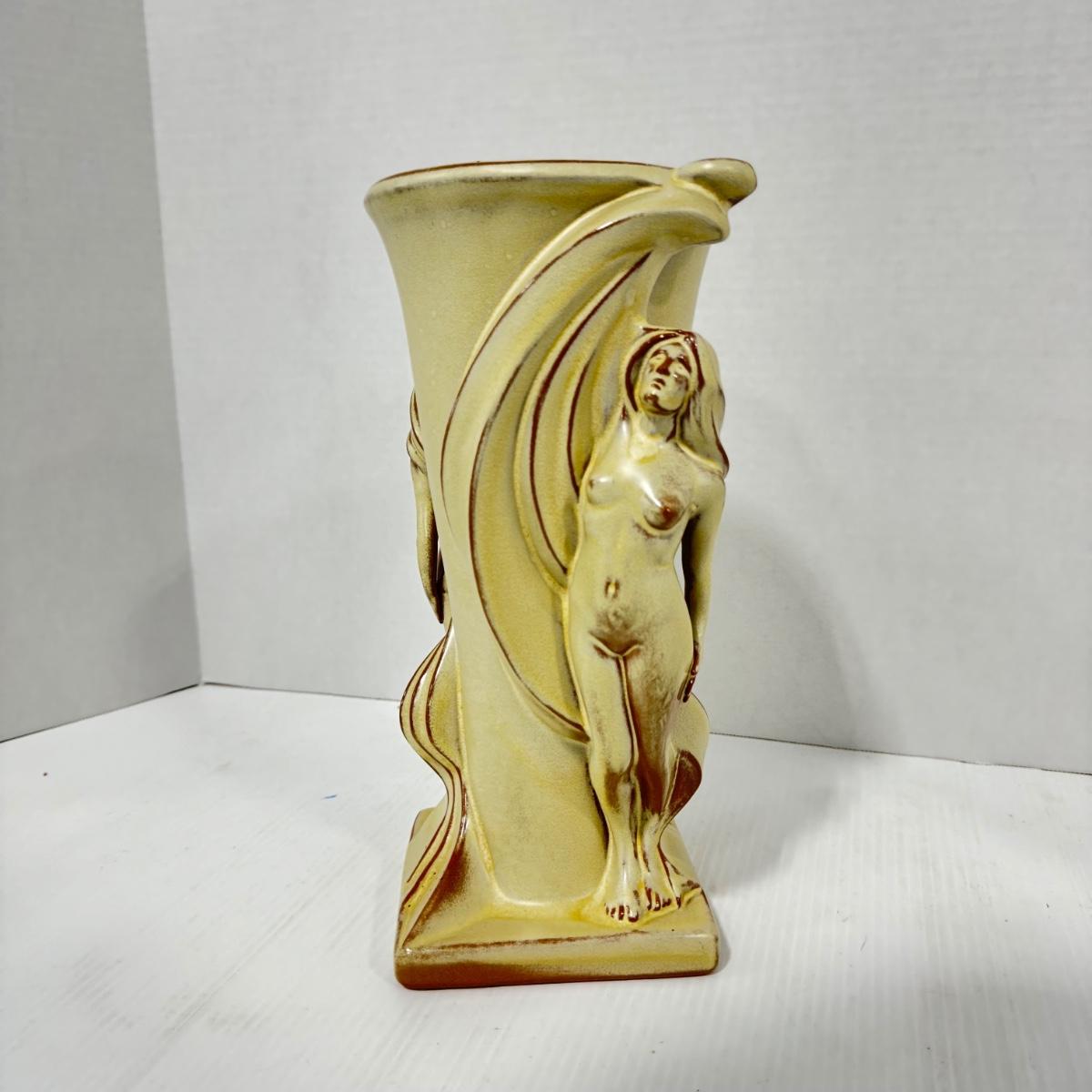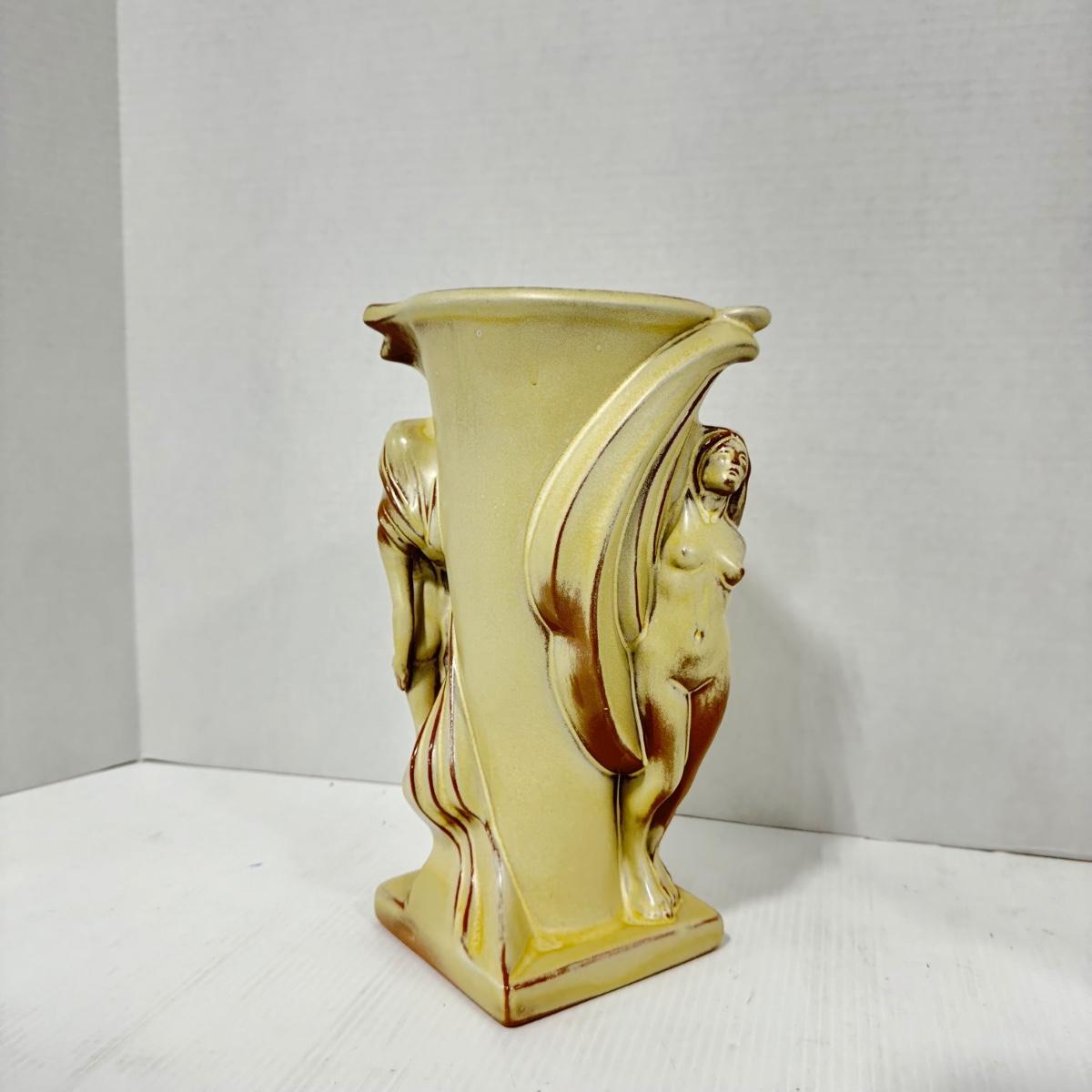Frankoma Cream Colored Art Pottery vase with female nudes designed by Gerald Smith. The vase with two nudes, with their drapery floating to the side. Made with Tan Firing Clay