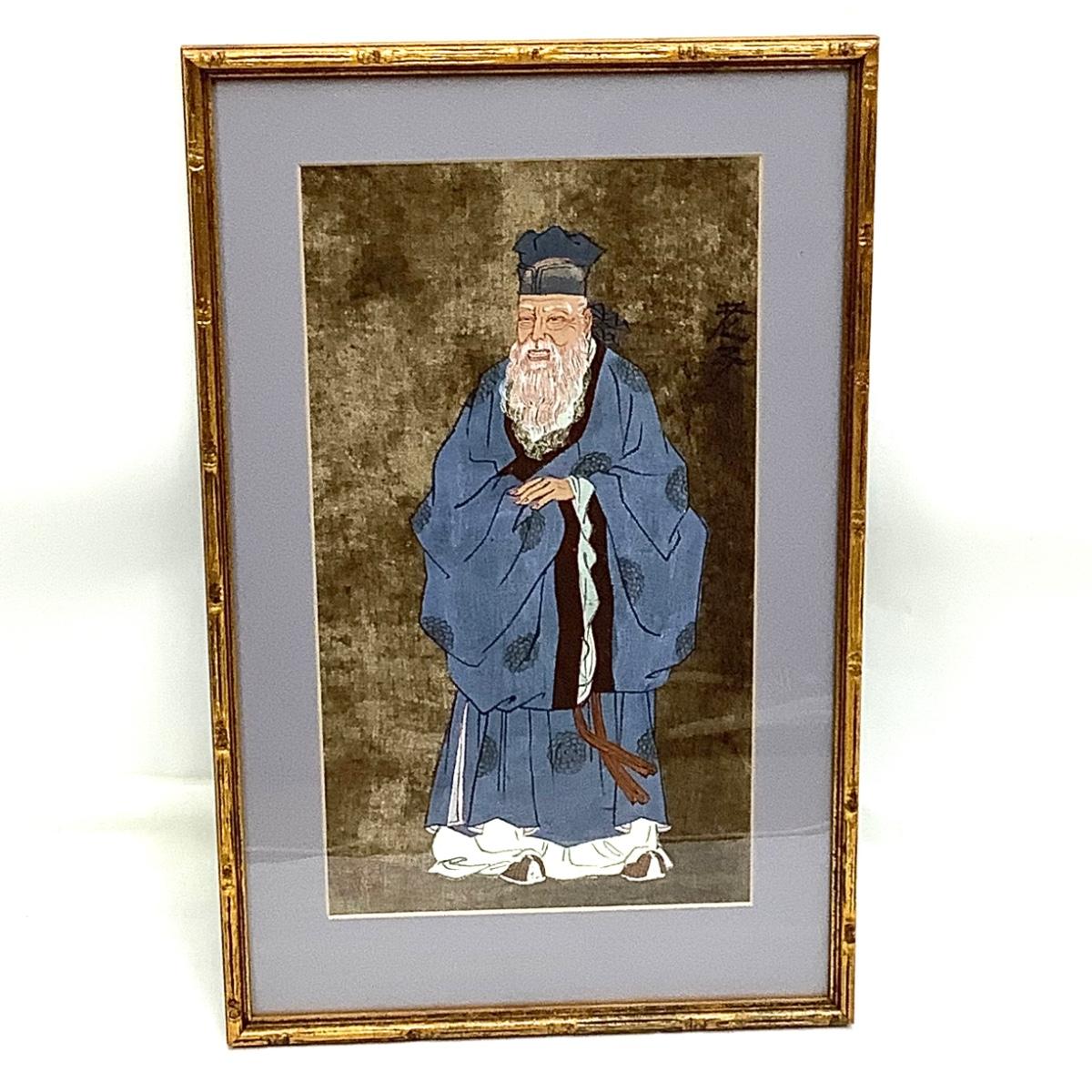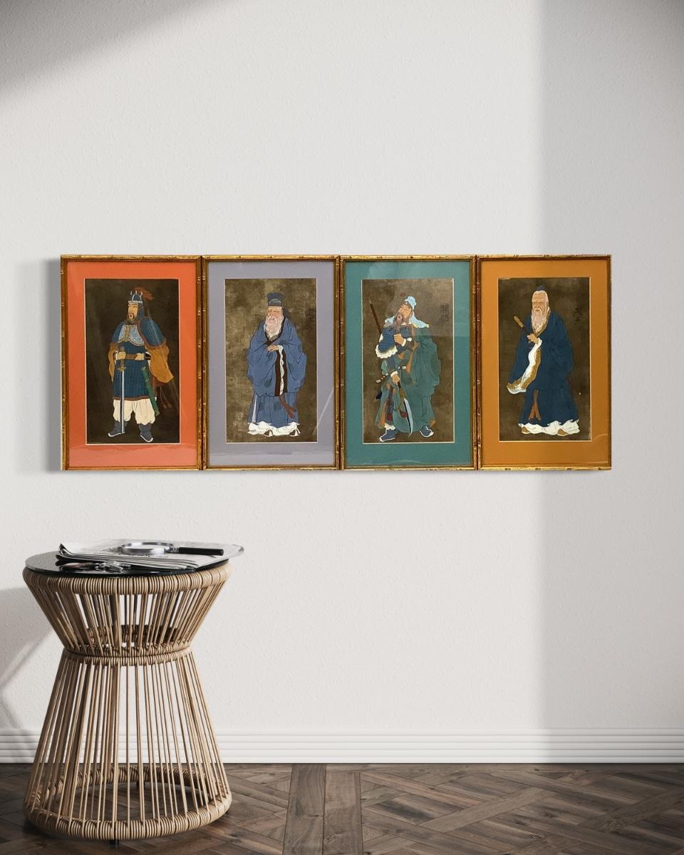 Each piece is 18" high x 15.5" wide in a faux bamboo frame. General EULJI MOON DEOK was the Premier of the Kokuryo kingdom. Lao Tze was a Chinese philospoher whom founded Taoism. Kwan-Yui was a famed general of the Sshou-Han Dynasty. Confucius is the founder of Confucianism.