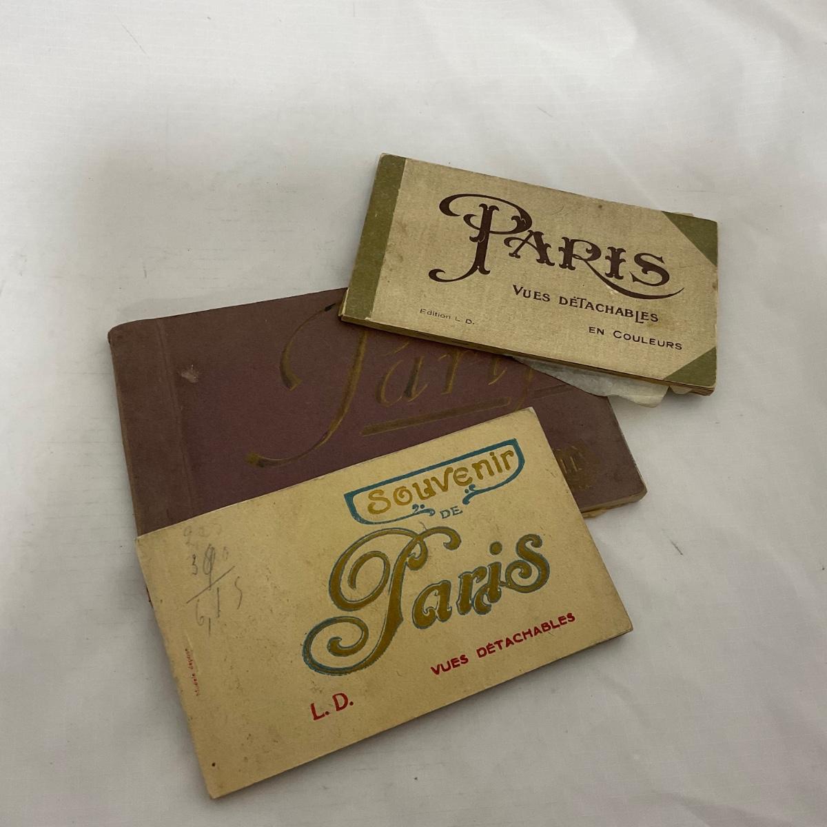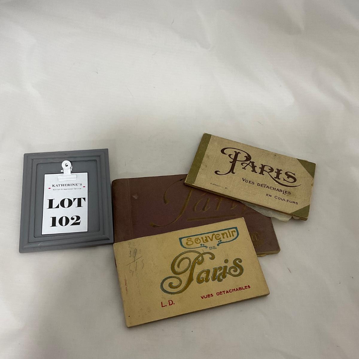 Three World War I era Paris photo postcard booklets from a soldier collection. Two booklets 3.5 inches by 6 inches. One booklet 4.5 inches by 7.5 inches. Please see photos for details and condition. ::: Shipping is available on this lot. If you require shipping you must let us know at the close of the auction. We will coordinate with you after the item has been won. Shipping fees will include insurance up to or exceeding the value of all items being mailed. If you have any questions regarding this lot please contact the auctioneer either via this website, by direct email or by phone. PICK UP TIMES and other important information can be found in the TERMS and DESCRIPTION of the auction. Please take a look for pertinent information. Thanks!
