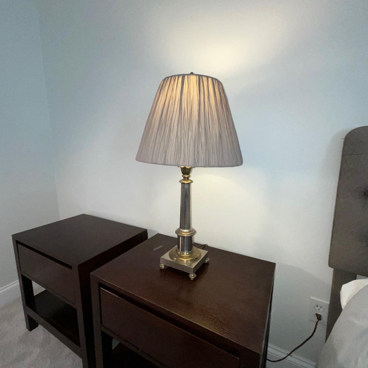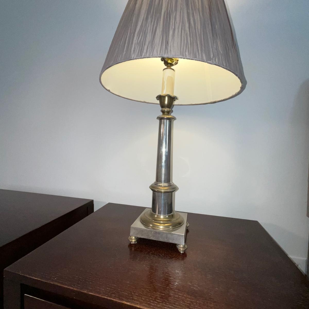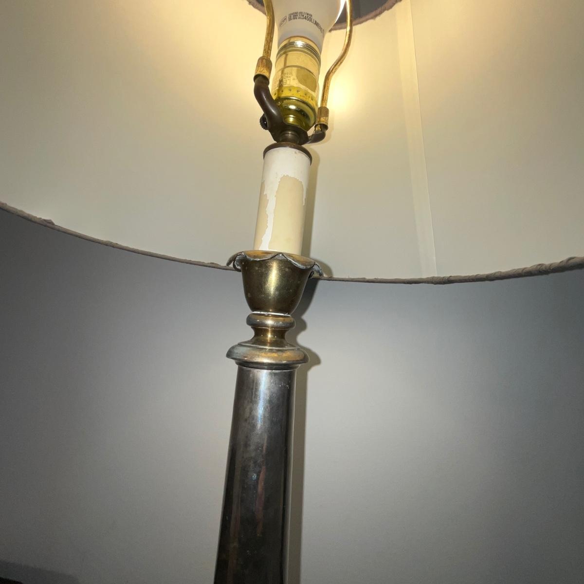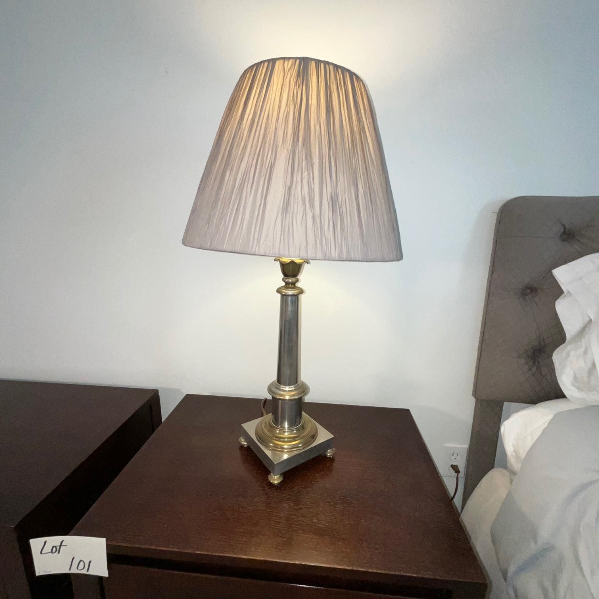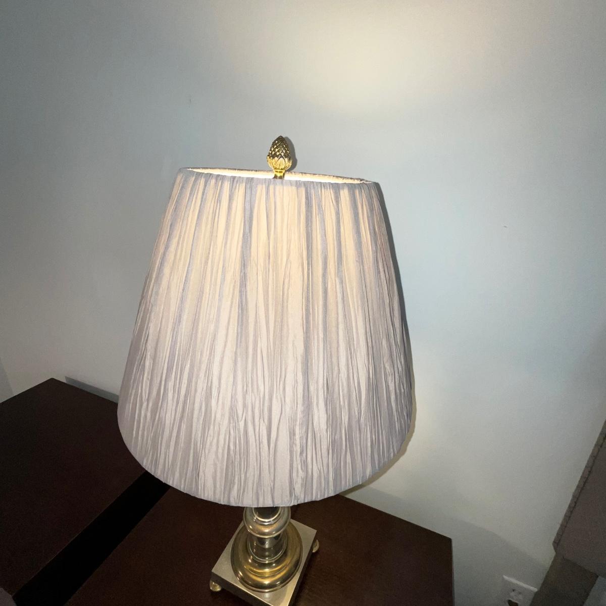 102 Silver and Brass Plated Lamp with Pleated Silk Shade with Pineapple Finial