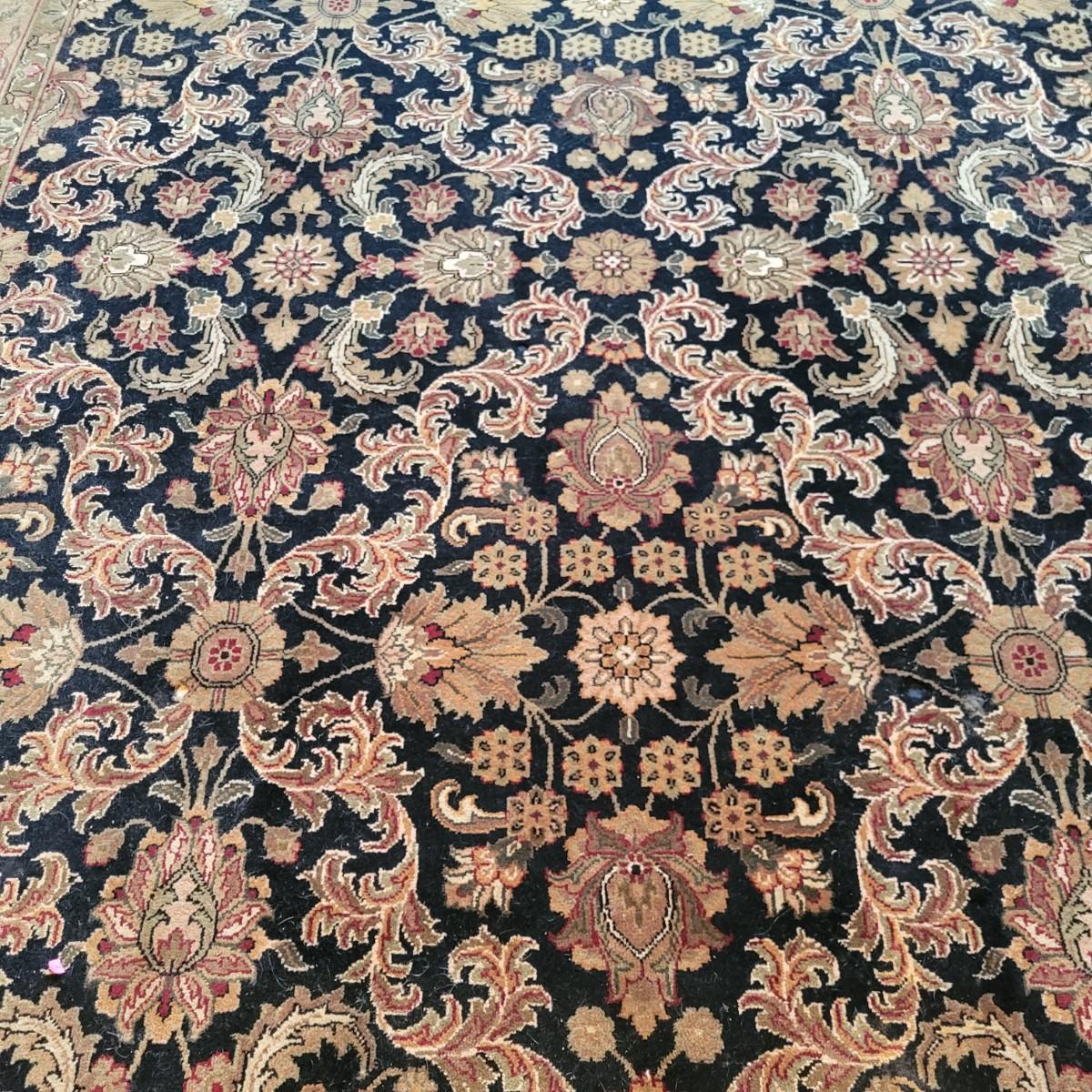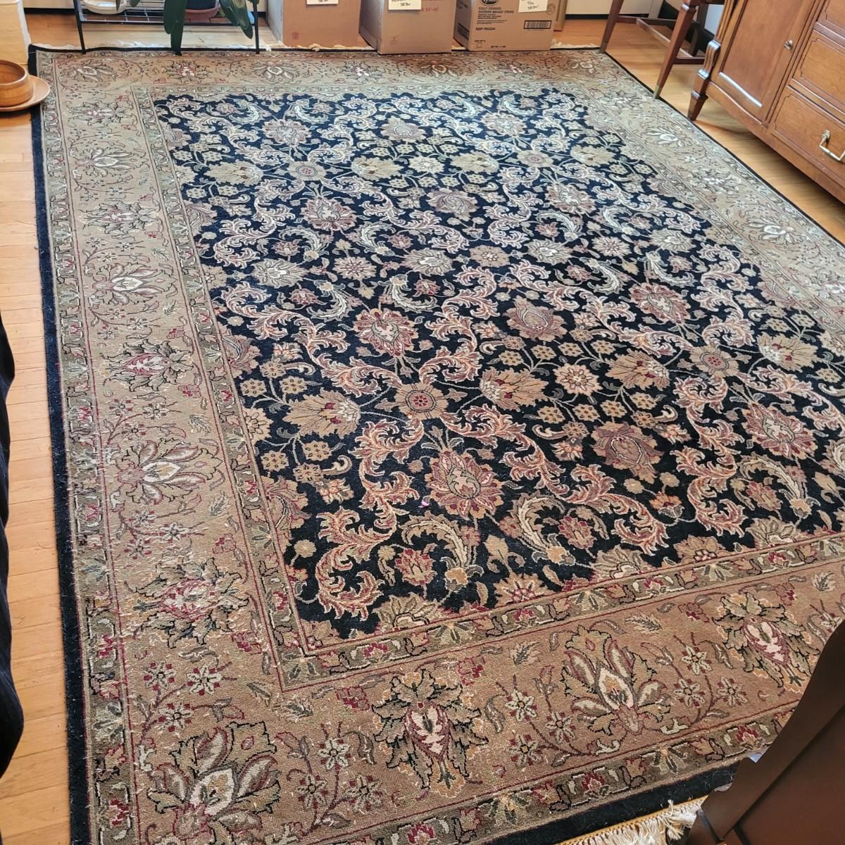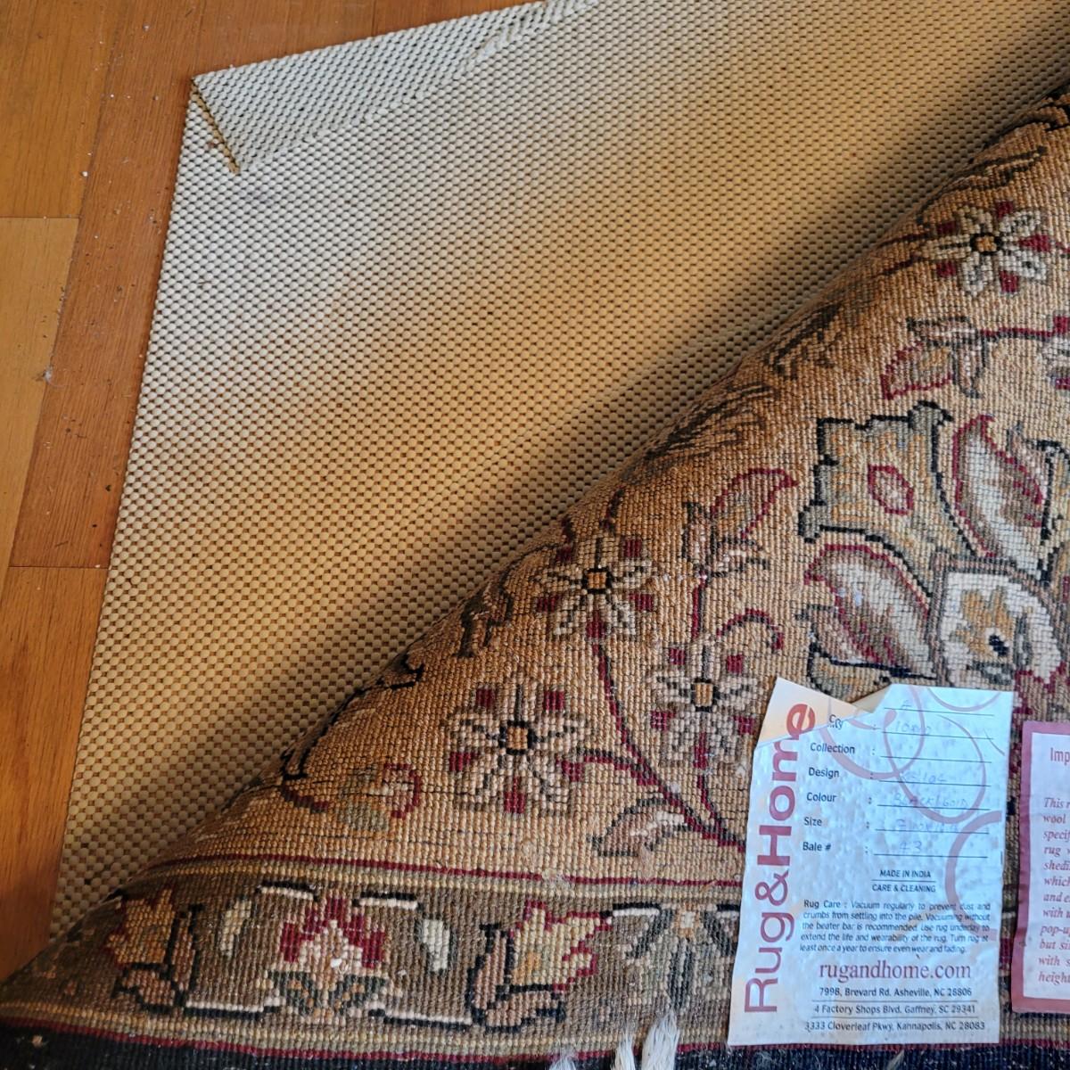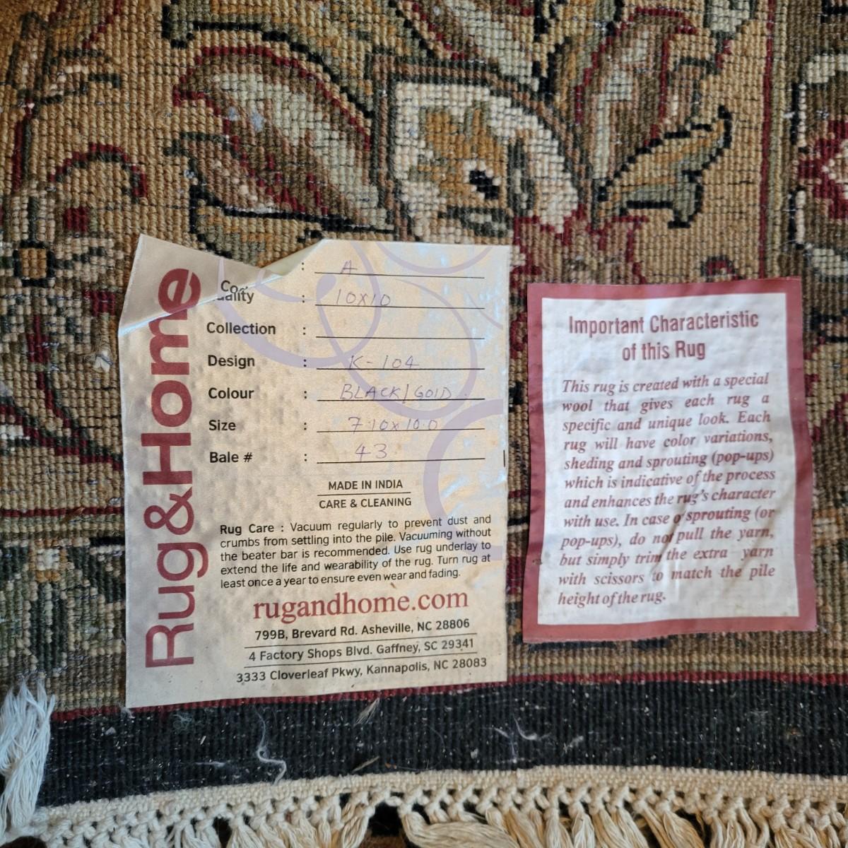A Rug & Home area rug. Tag states that it is wool and measures 7’10” x 10’. It has black and gold coloring with red and green accents. Non slip rug pad is included. Local pickup only. Winning bidder must bring assistance to help move and load this item due to its weight and/or size.