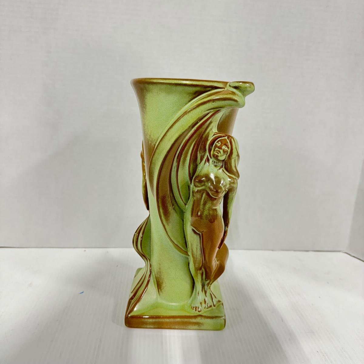 Frankoma Green art pottery vase with female nudes designed by Gerald Smith. The vase with two nudes, their billowing drapery floating to the side. Made with Tan Firing Clay