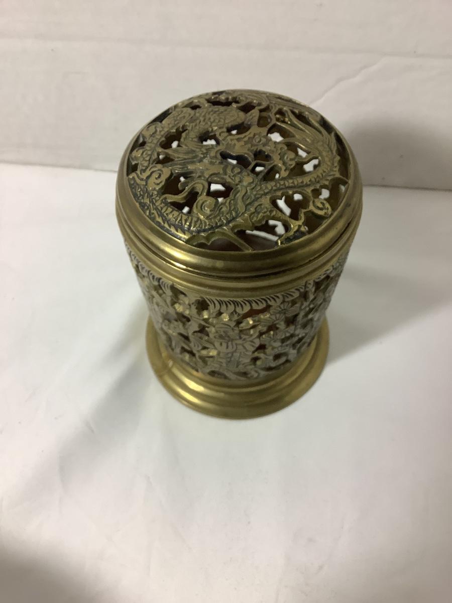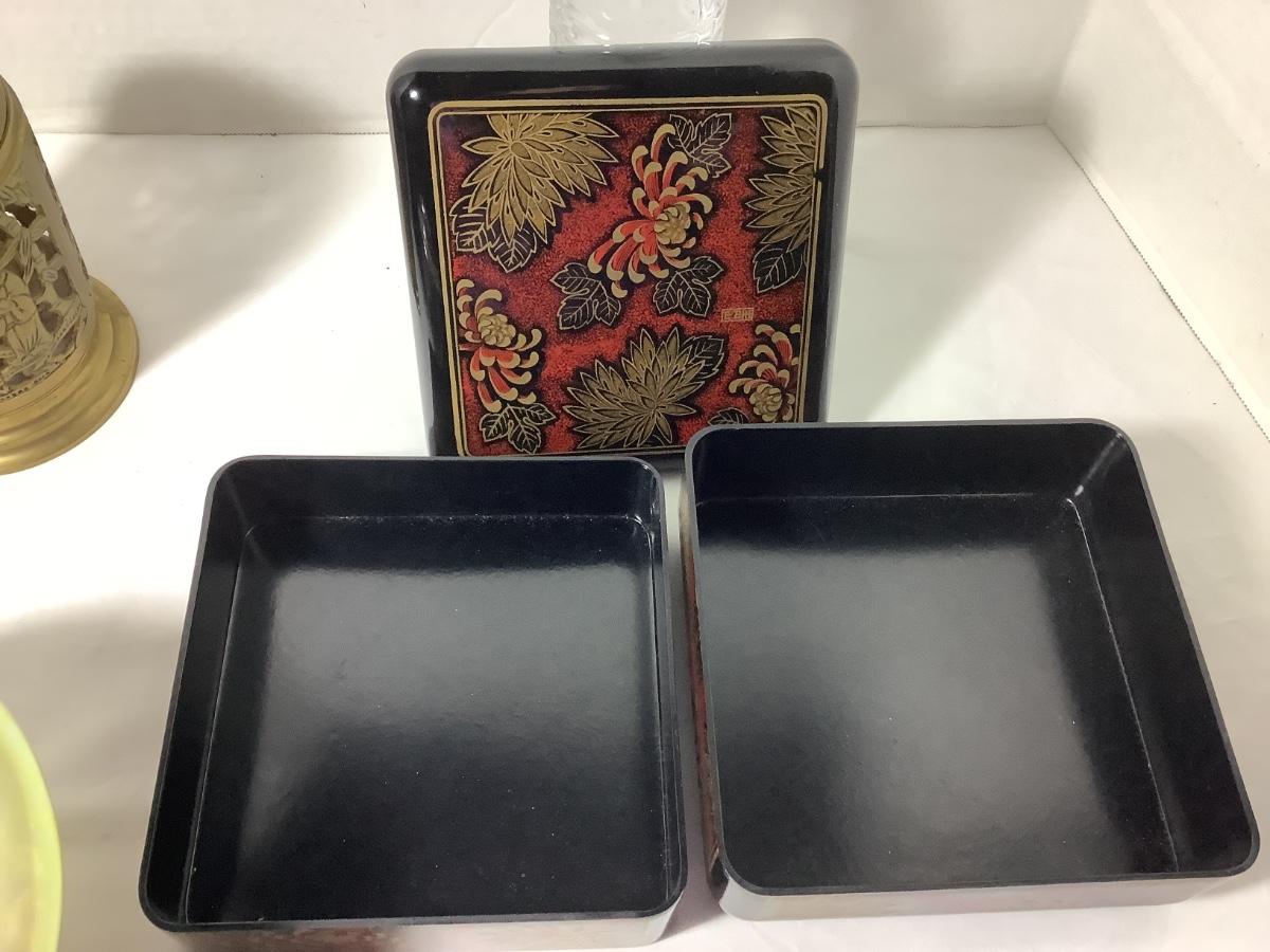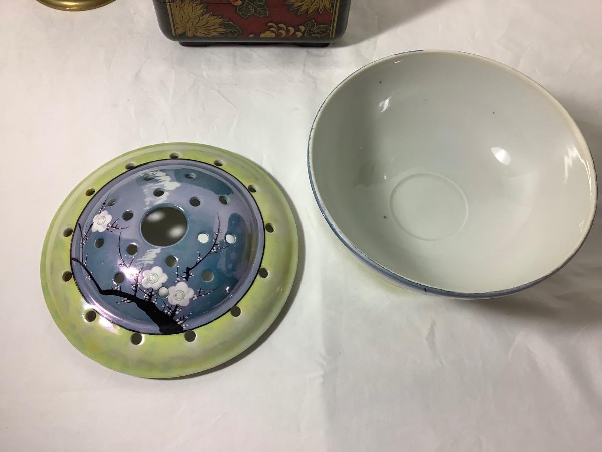 Lusterware Flower Frog, Decrative box with 2 compartments, gold metal candle holder with screw top (5" tall)
