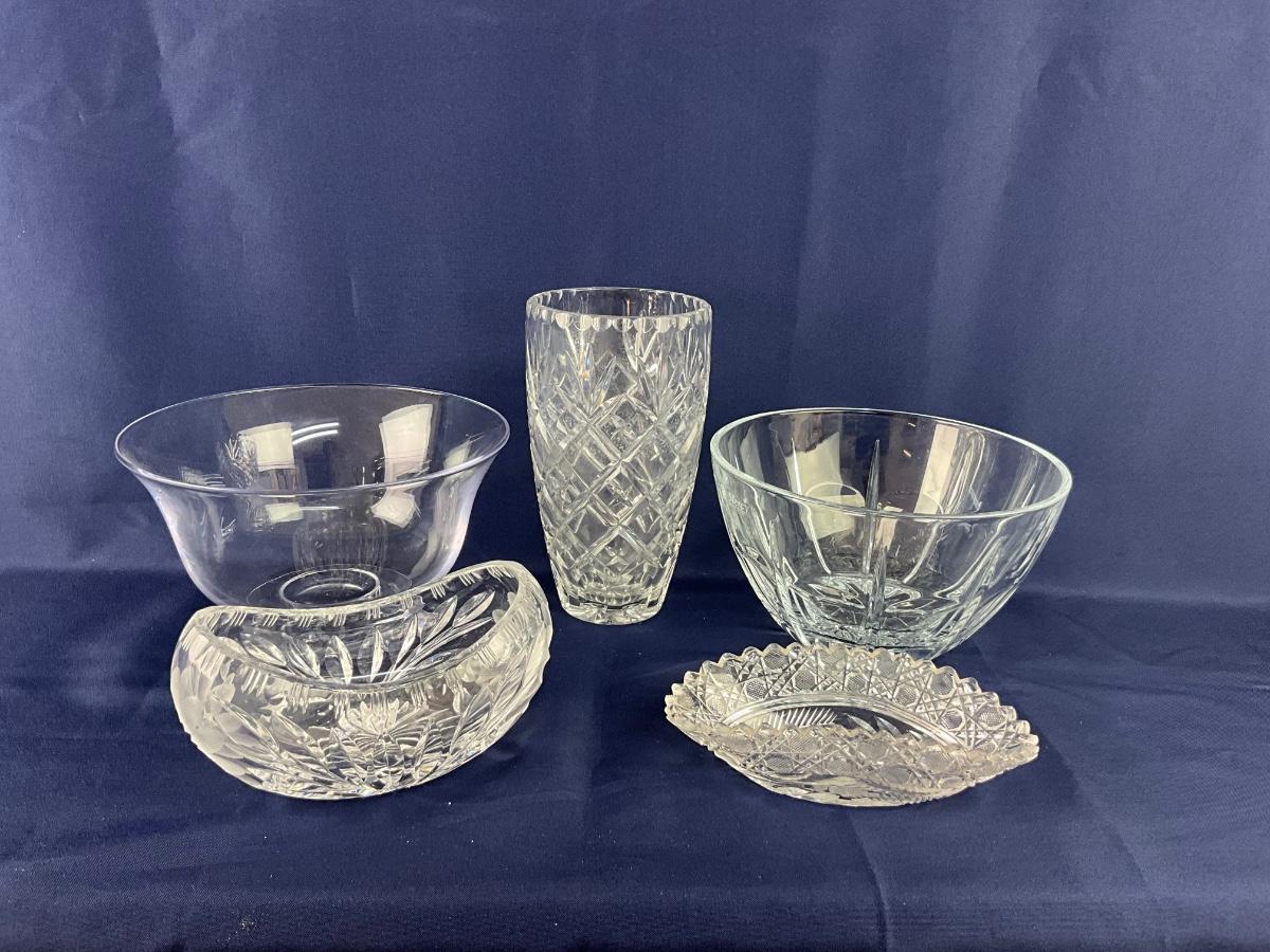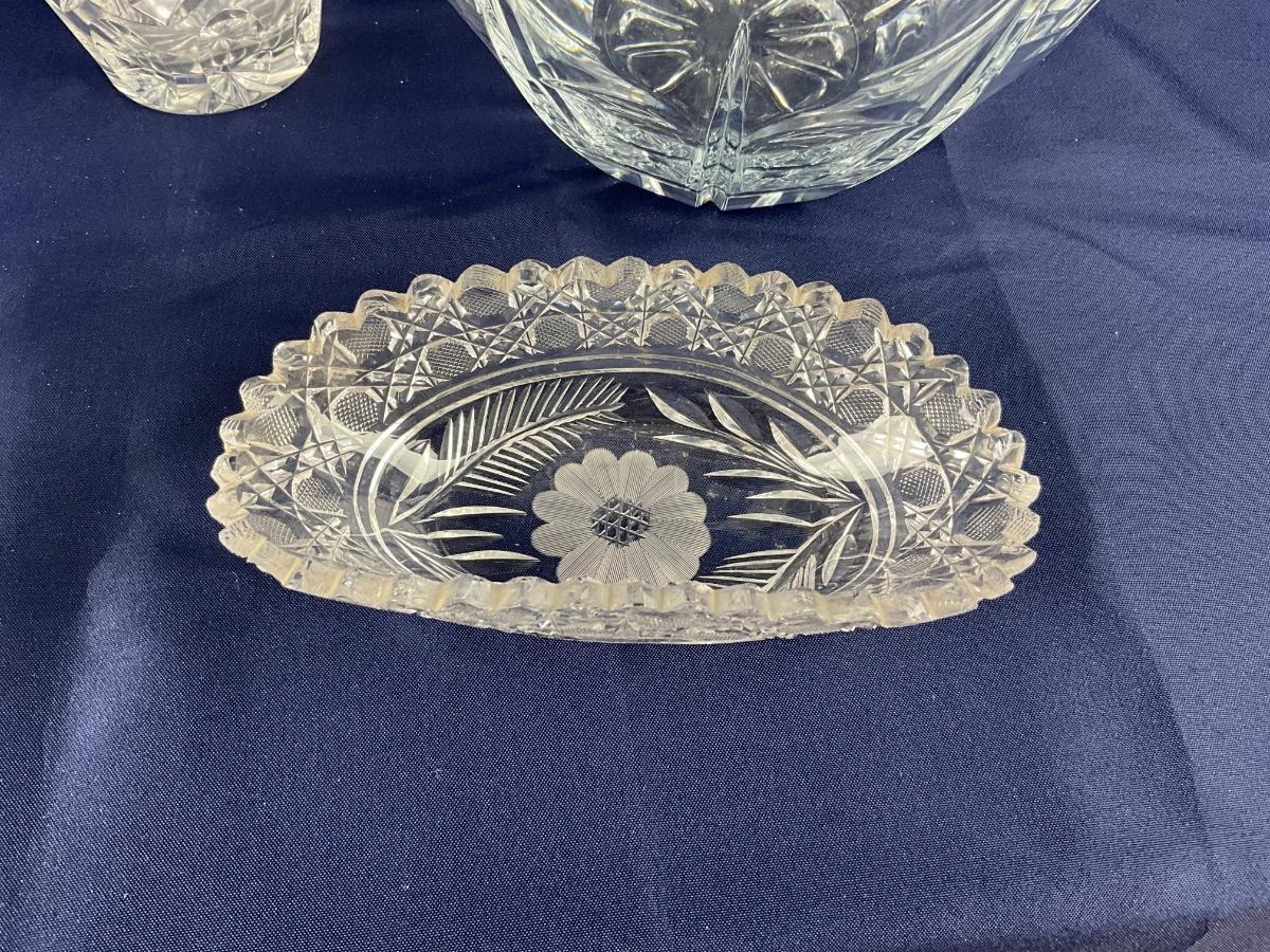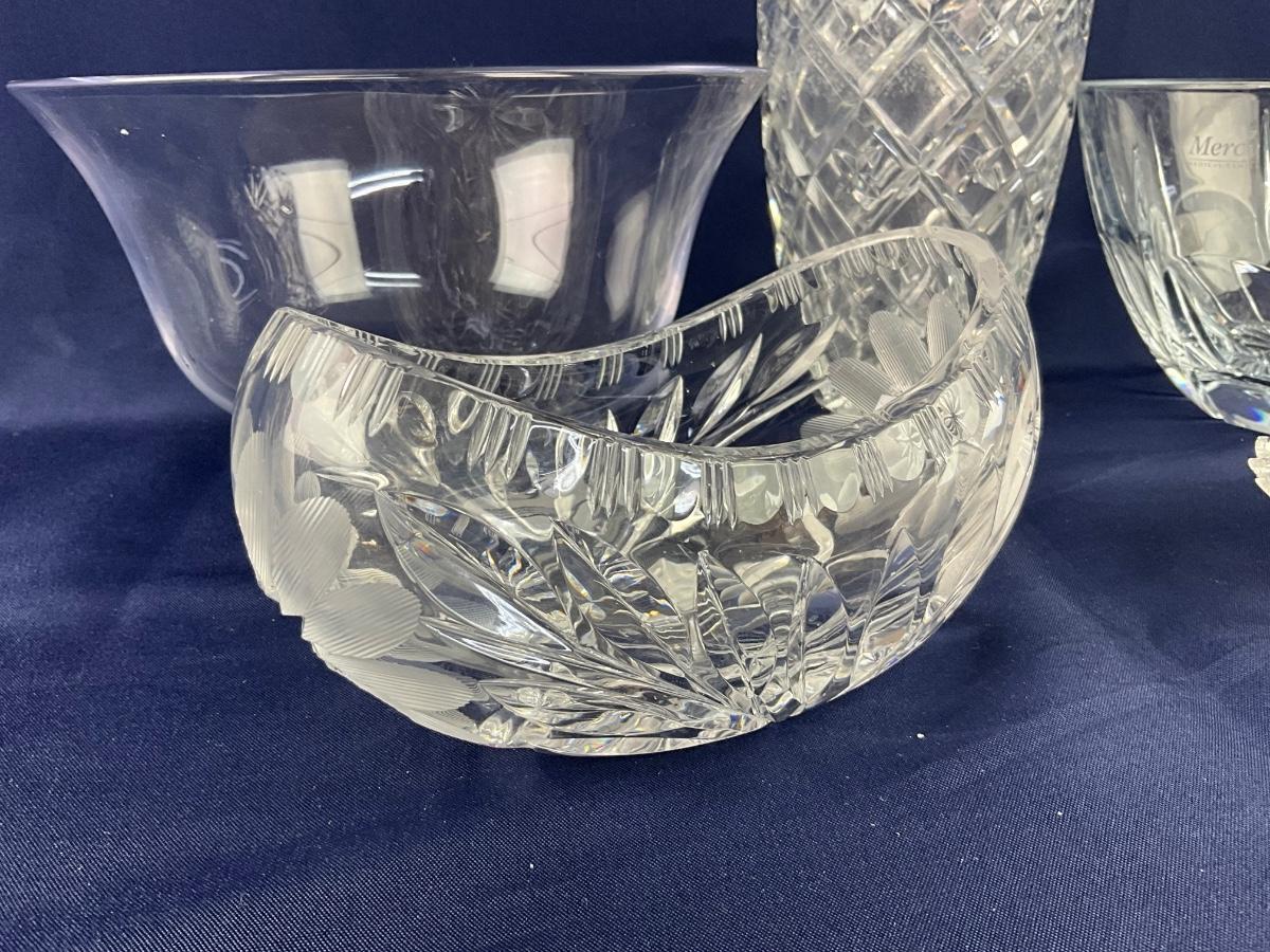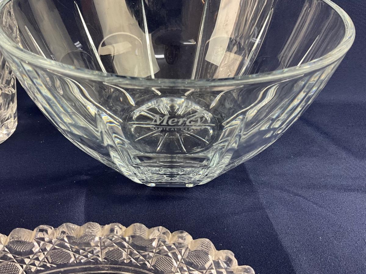 Includes Ceskci crystal vase (8.25”H), Antique cut crystal dish (7”L x 3.25”D), Mercy Medical Center bowl (8.5”Diameter x 5”H)