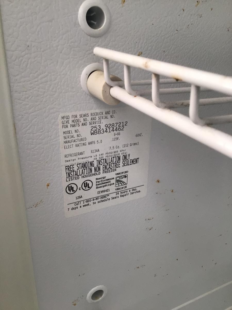 1021 Kenmore Upright Freezer Model: 253.9287212