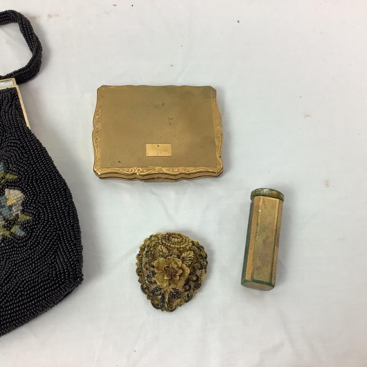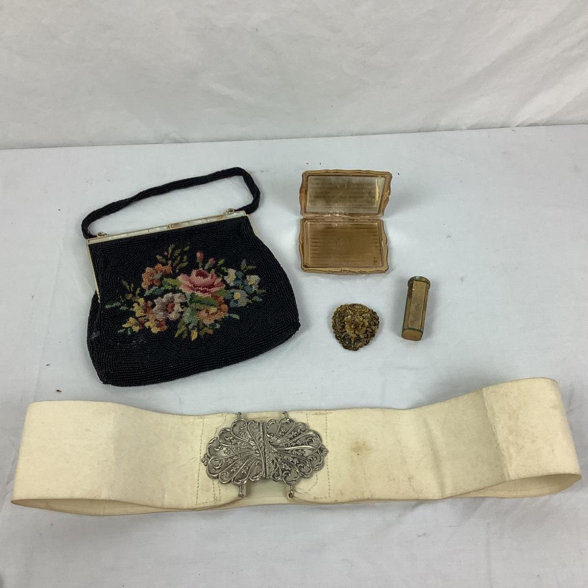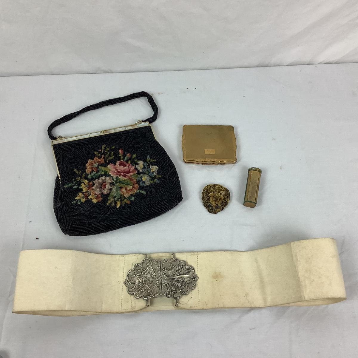 1021 Vintage Beaded Bag with Stratton Compact,Lipstick, and Silvertone Belt