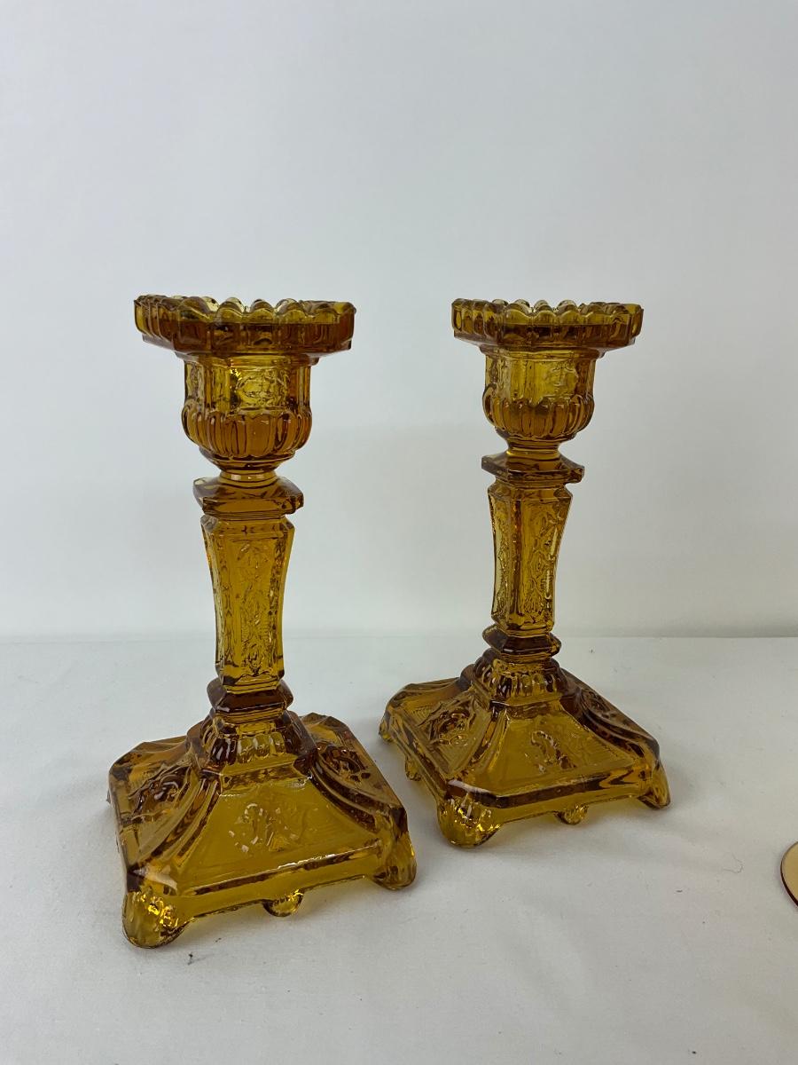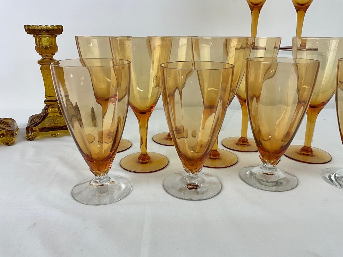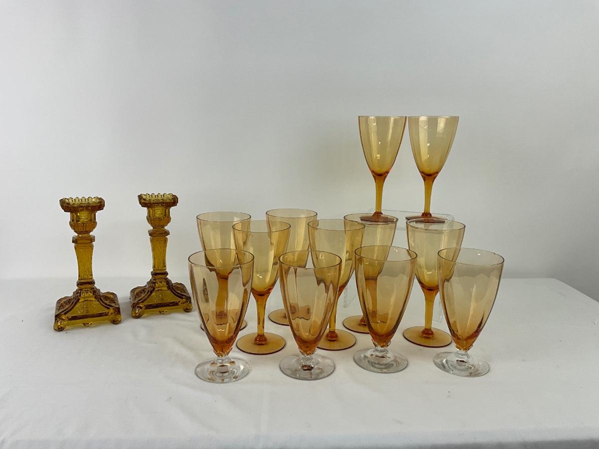1022 Lot Of Amber Glass Glass Goblets, and Candlesticks