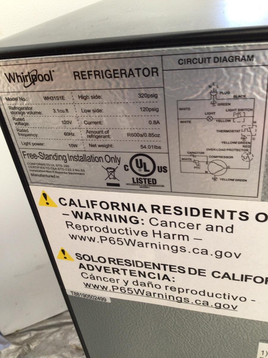 1022 Whirlpool Mini Refrigerator & Freezer Model: WH31S1E