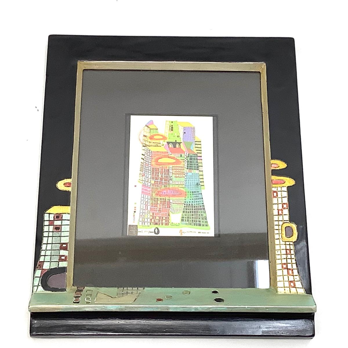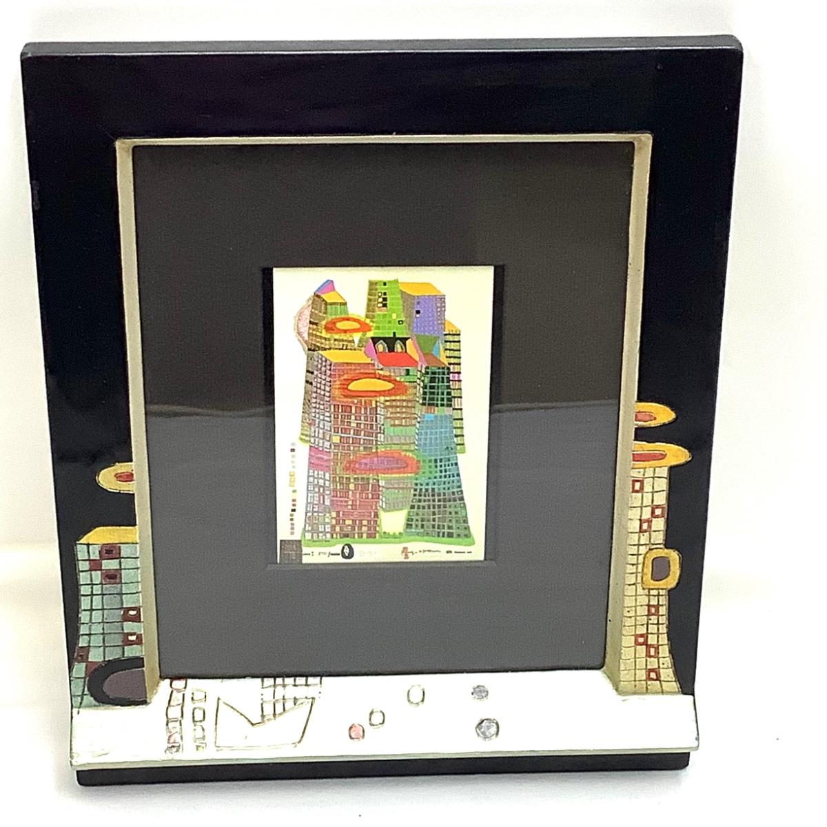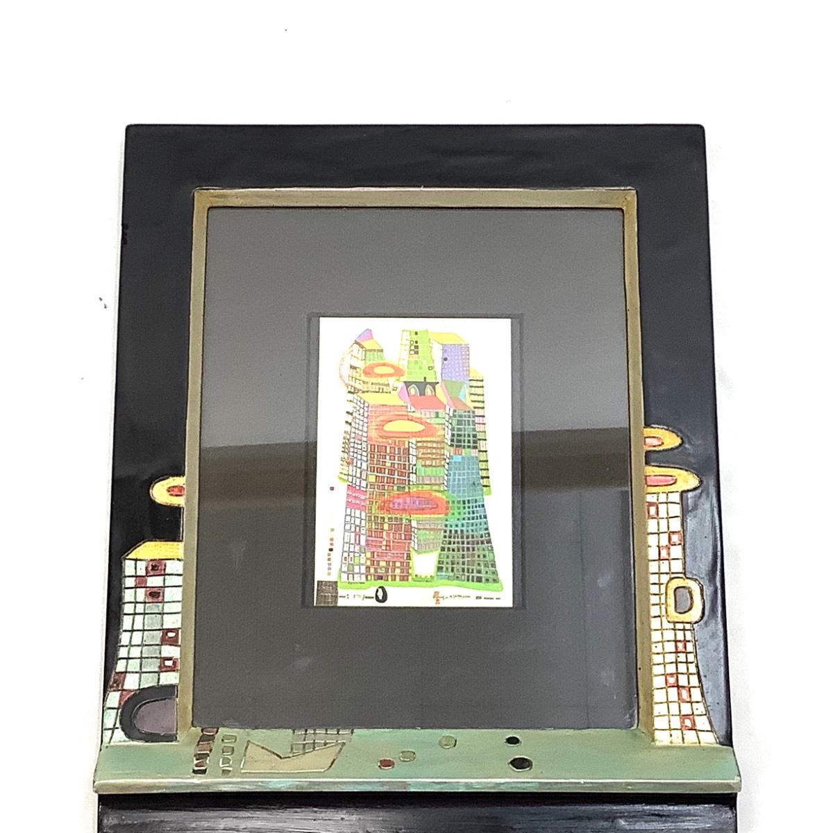 The frame is a piece of art as well as the color screenprint with metallic embossing on fabriano paper. The art measures 11.25" wide x 13.5" high x 1.5" deep. It is numbered 8,942/10,000. The frame is chipping slightly. The artist Friedensreich Hundertwasser was an Austrian visual artist and also worked on environmental protection. He was born in Dec. 1928 and died aboard The Queen Mary II in 2000. He is a highly honored artist and architect that has works still standing throughout New Zealand.