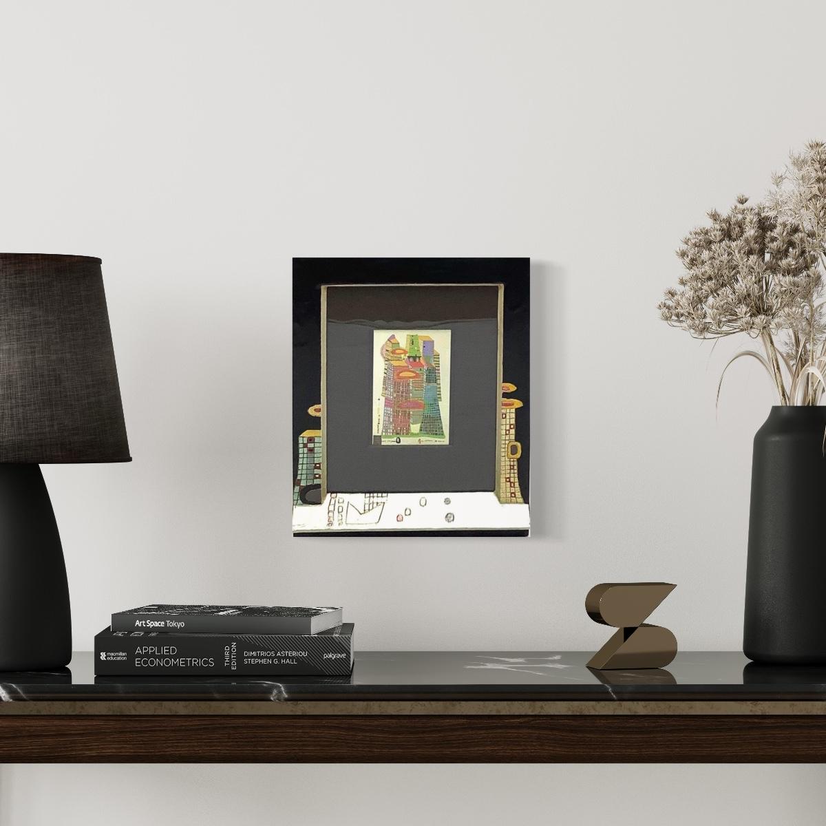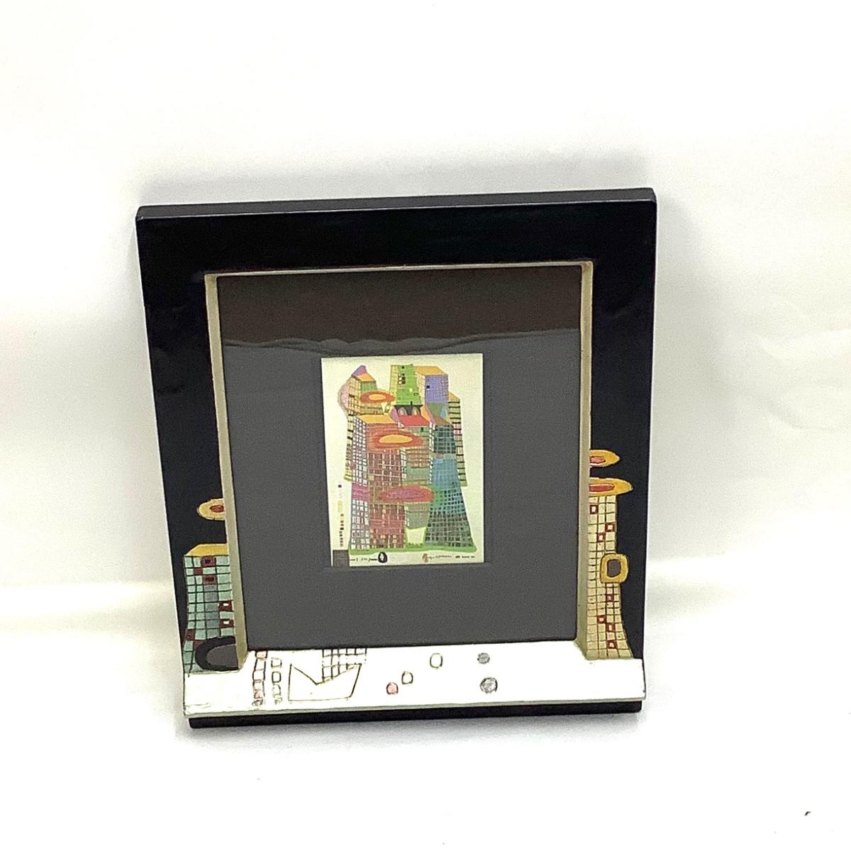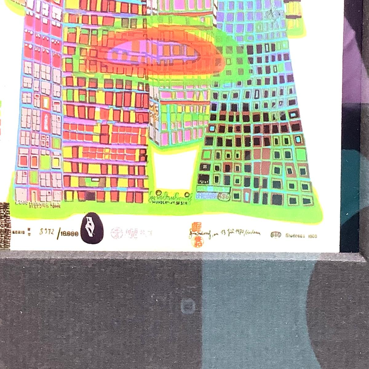 The frame is a piece of art as well as the color screenprint with metallic embossing on fabriano paper. The art measures 11.25" wide x 13.5" high x 1.5" deep. It is numbered 8,942/10,000. The frame is chipping slightly. The artist Friedensreich Hundertwasser was an Austrian visual artist and also worked on environmental protection. He was born in Dec. 1928 and died aboard The Queen Mary II in 2000. He is a highly honored artist and architect that has works still standing throughout New Zealand.