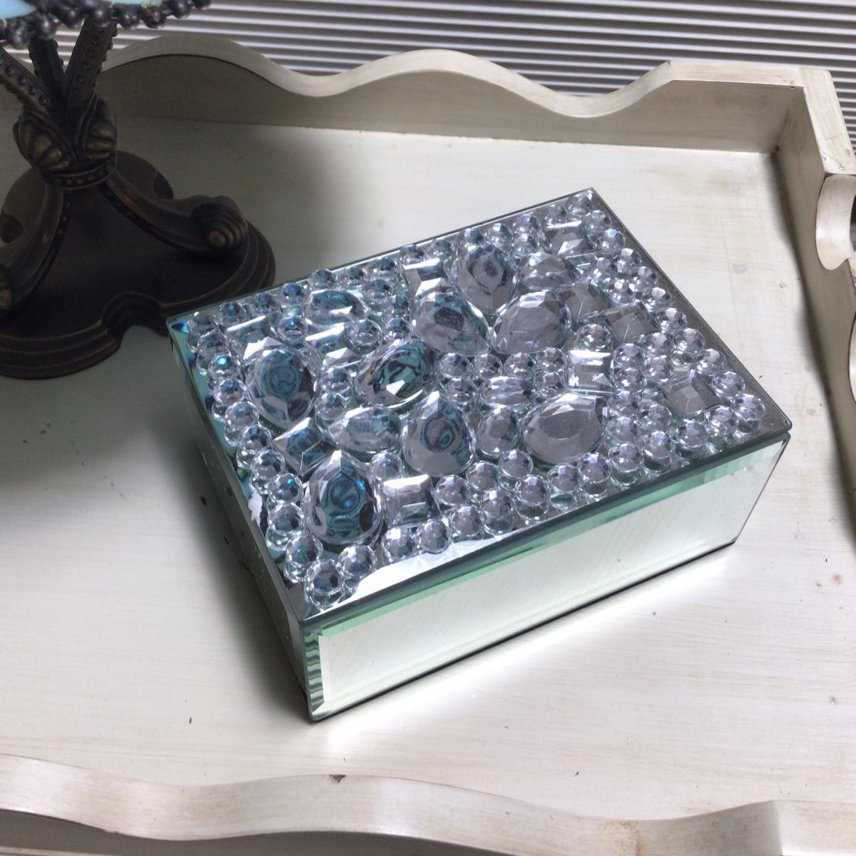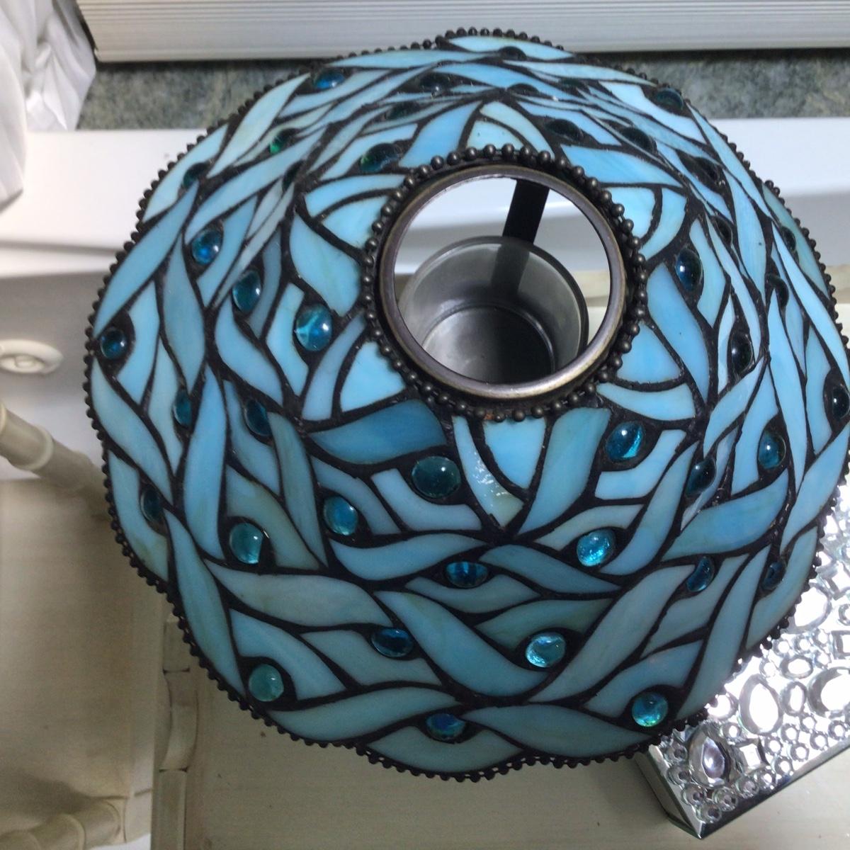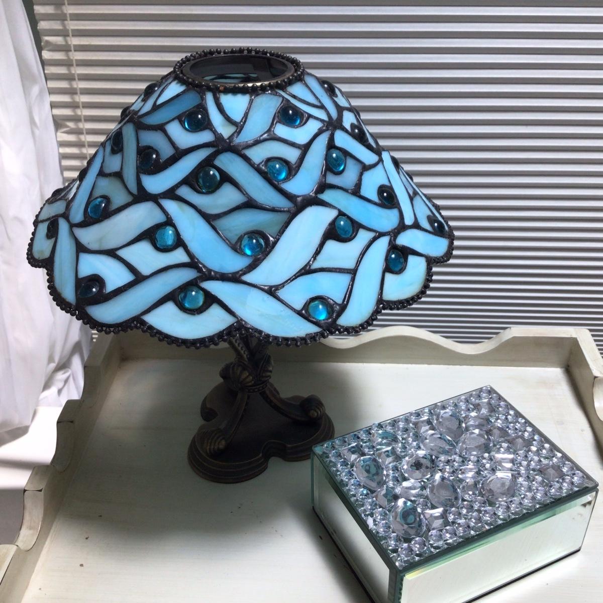 Lot contains blue stained glass votive holder and silver jeweled box.