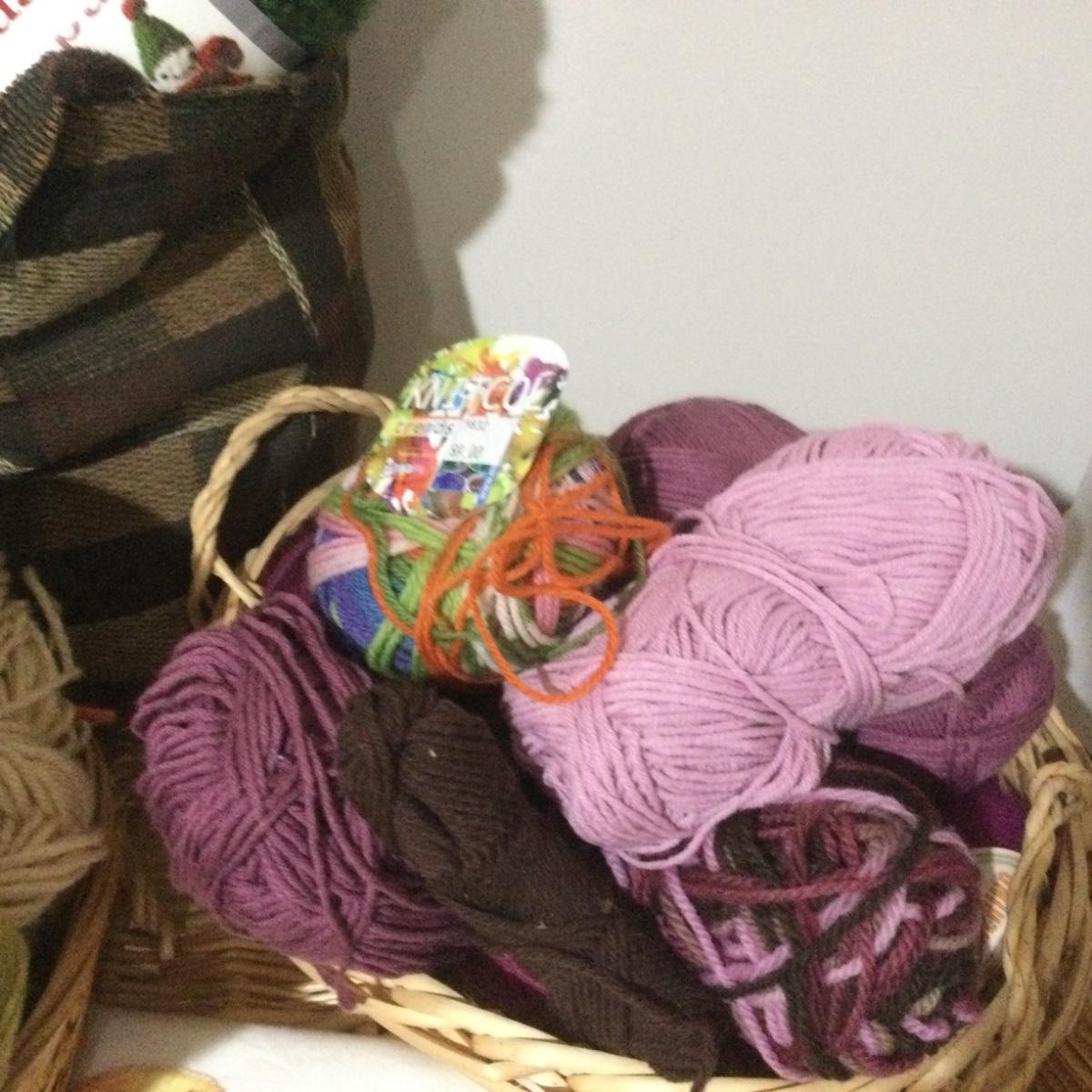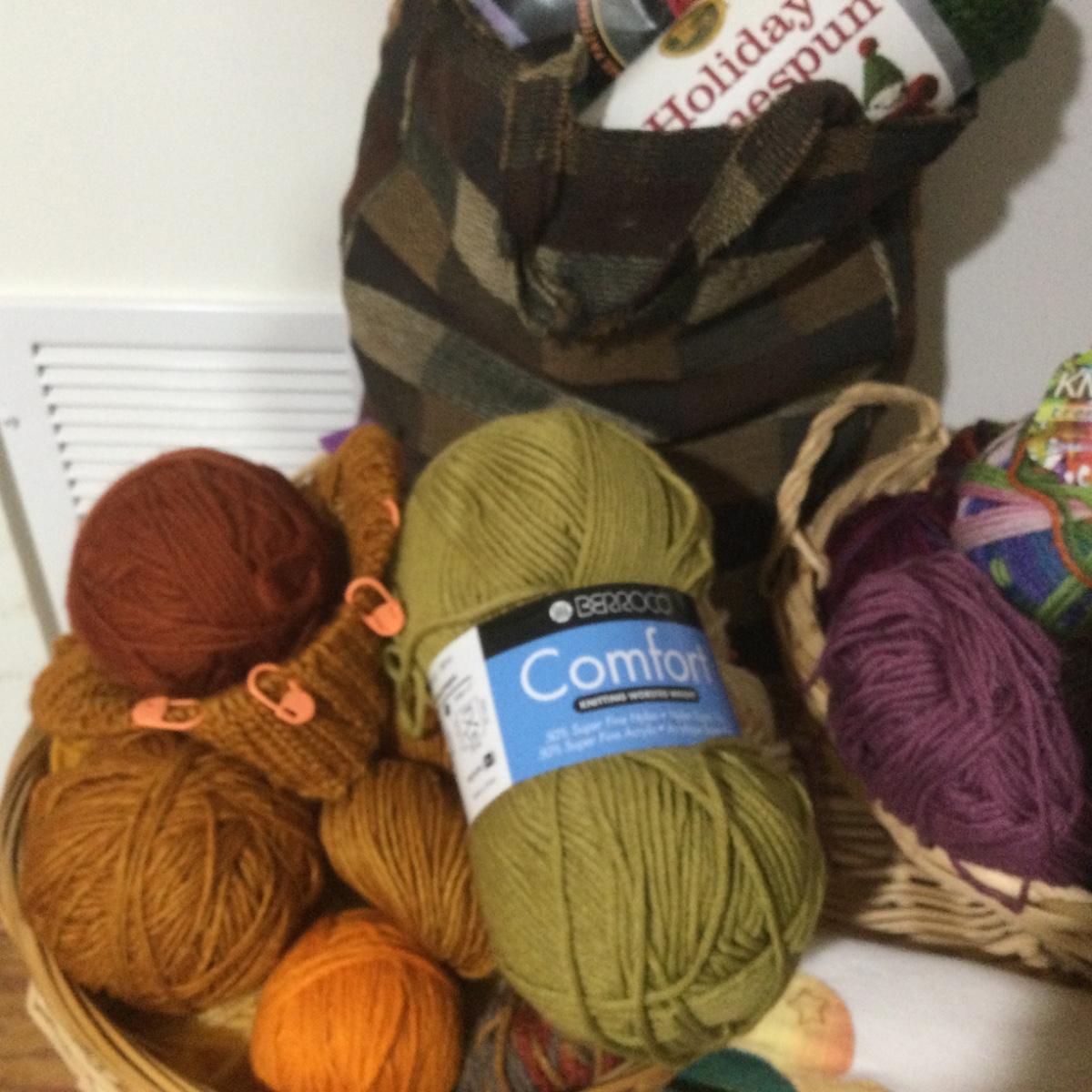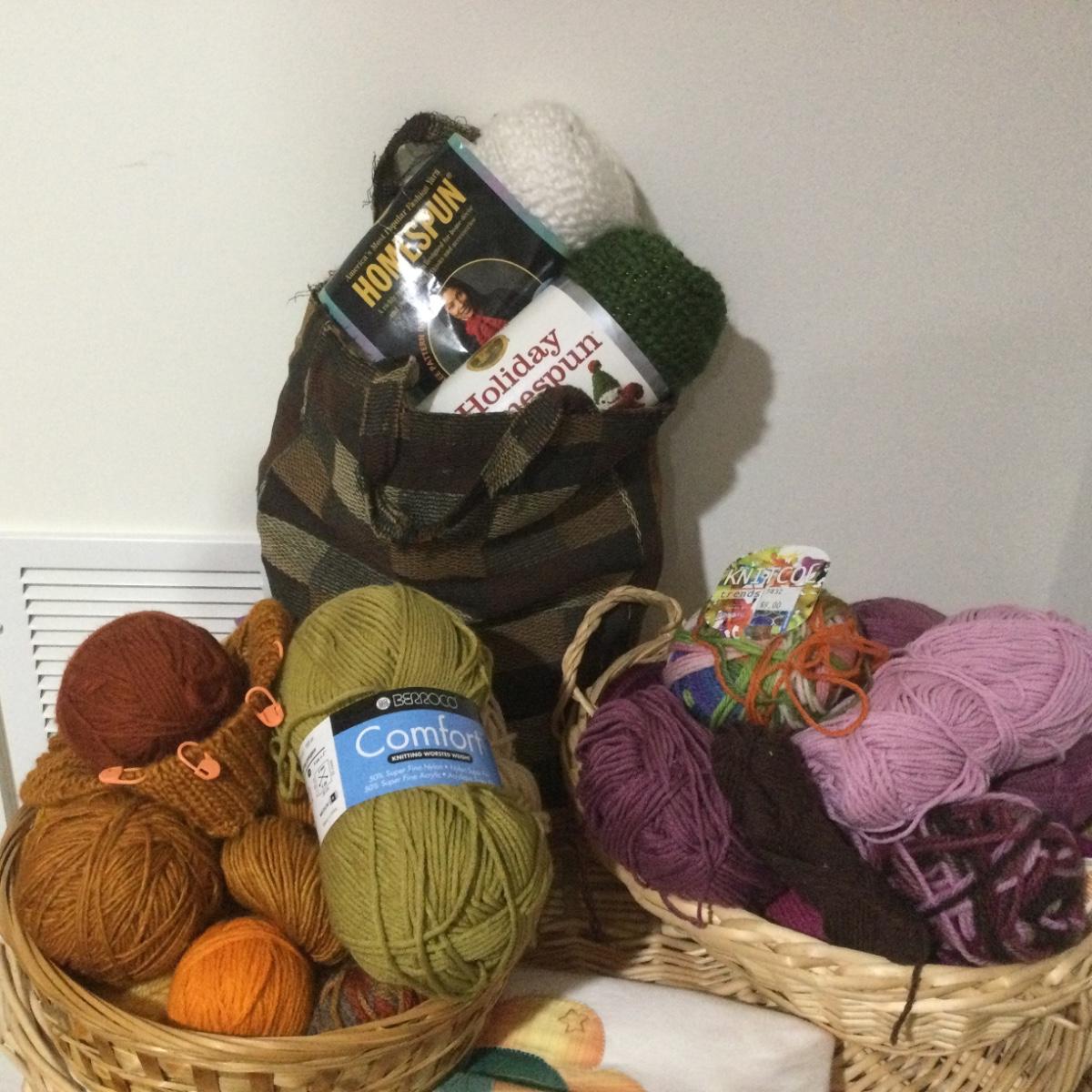 There are 2 baskets of assorted yarn and a bag with assorted homespun yarn.
