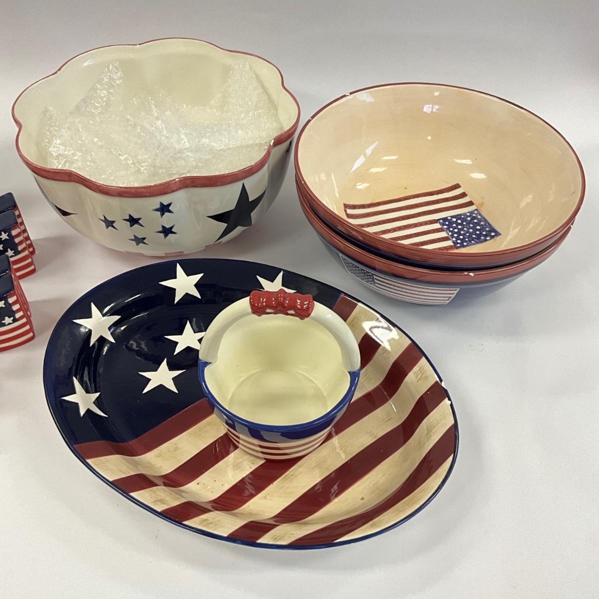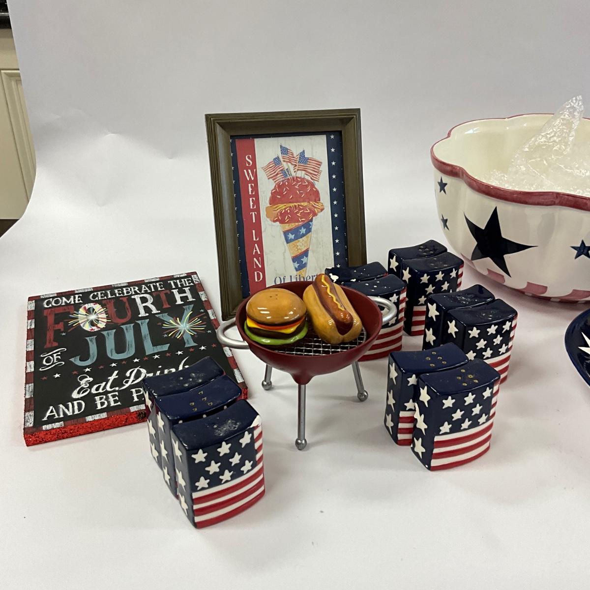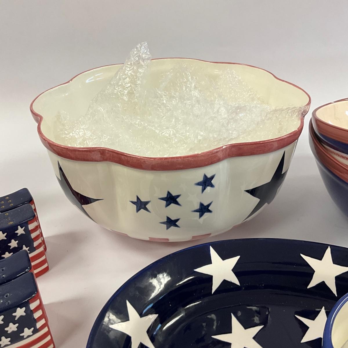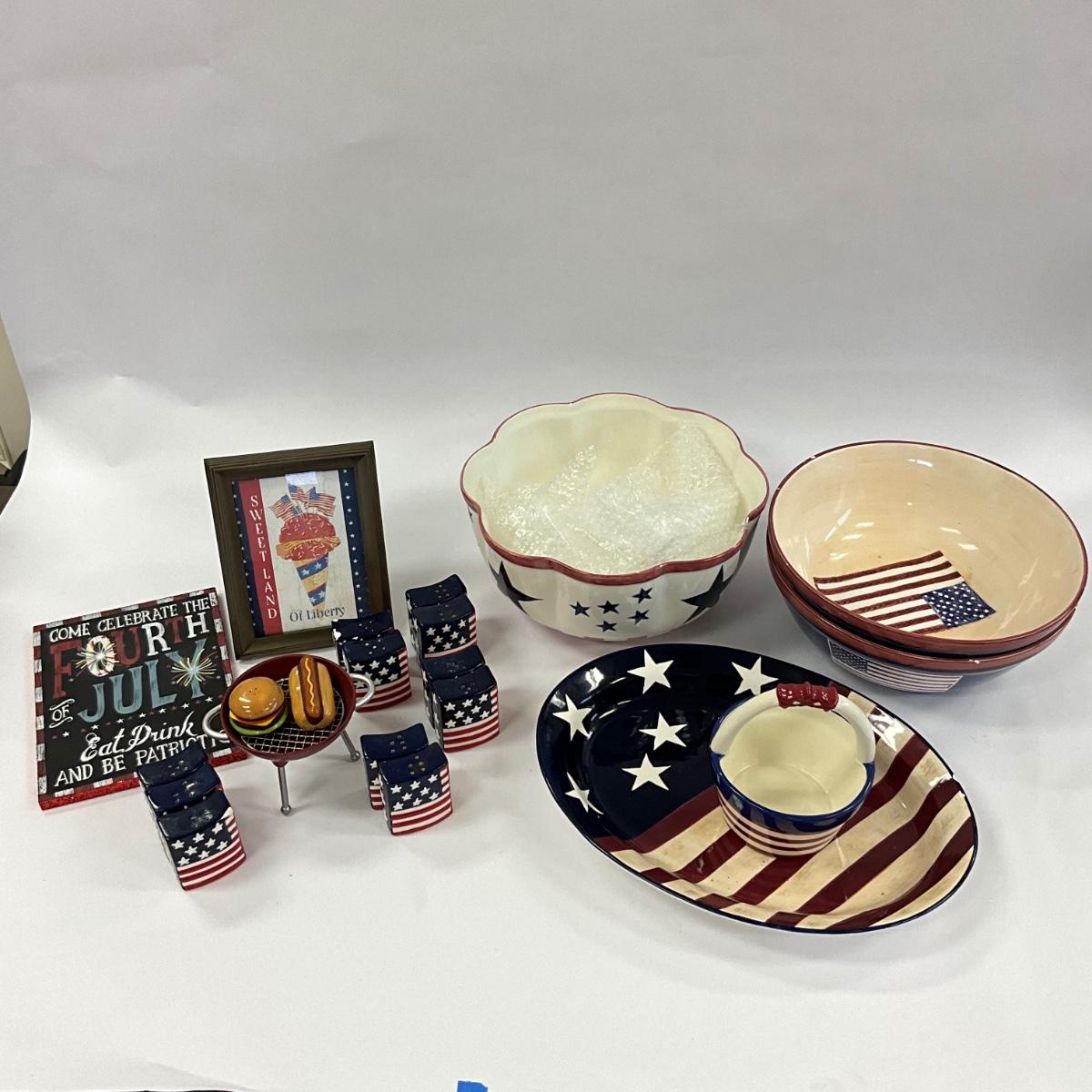 Large serving bowls , oval platter , salt and pepper shakers, BBQ salt and pepper with 4th of july decor