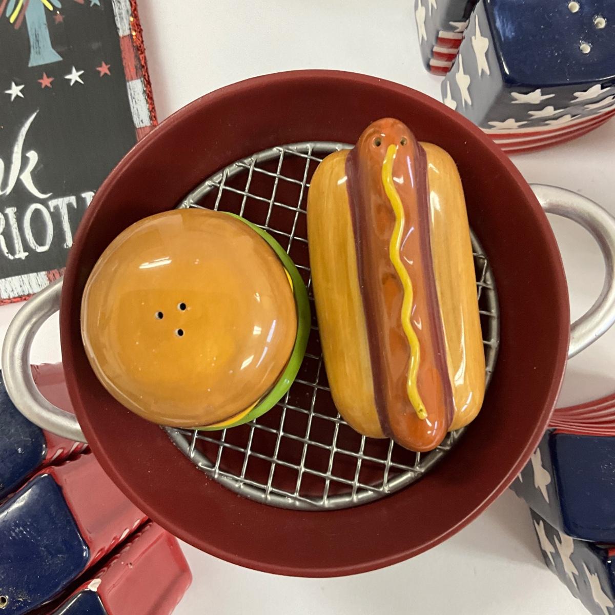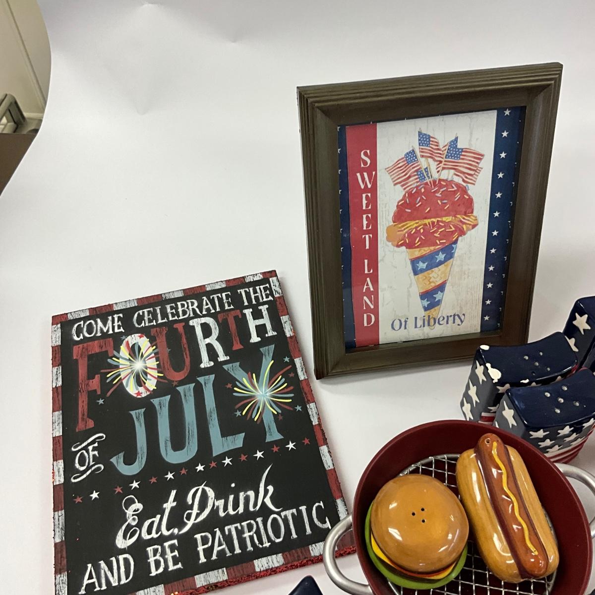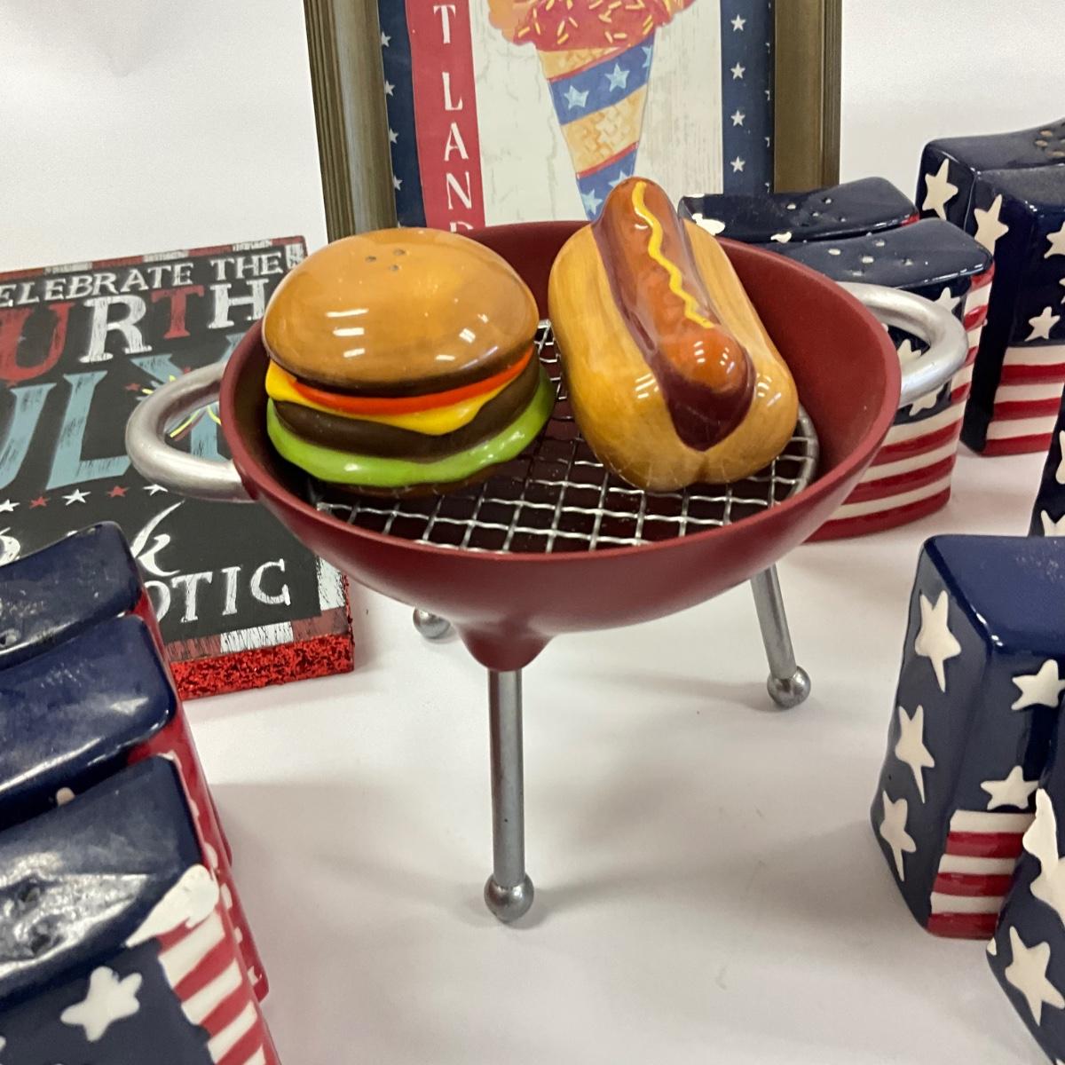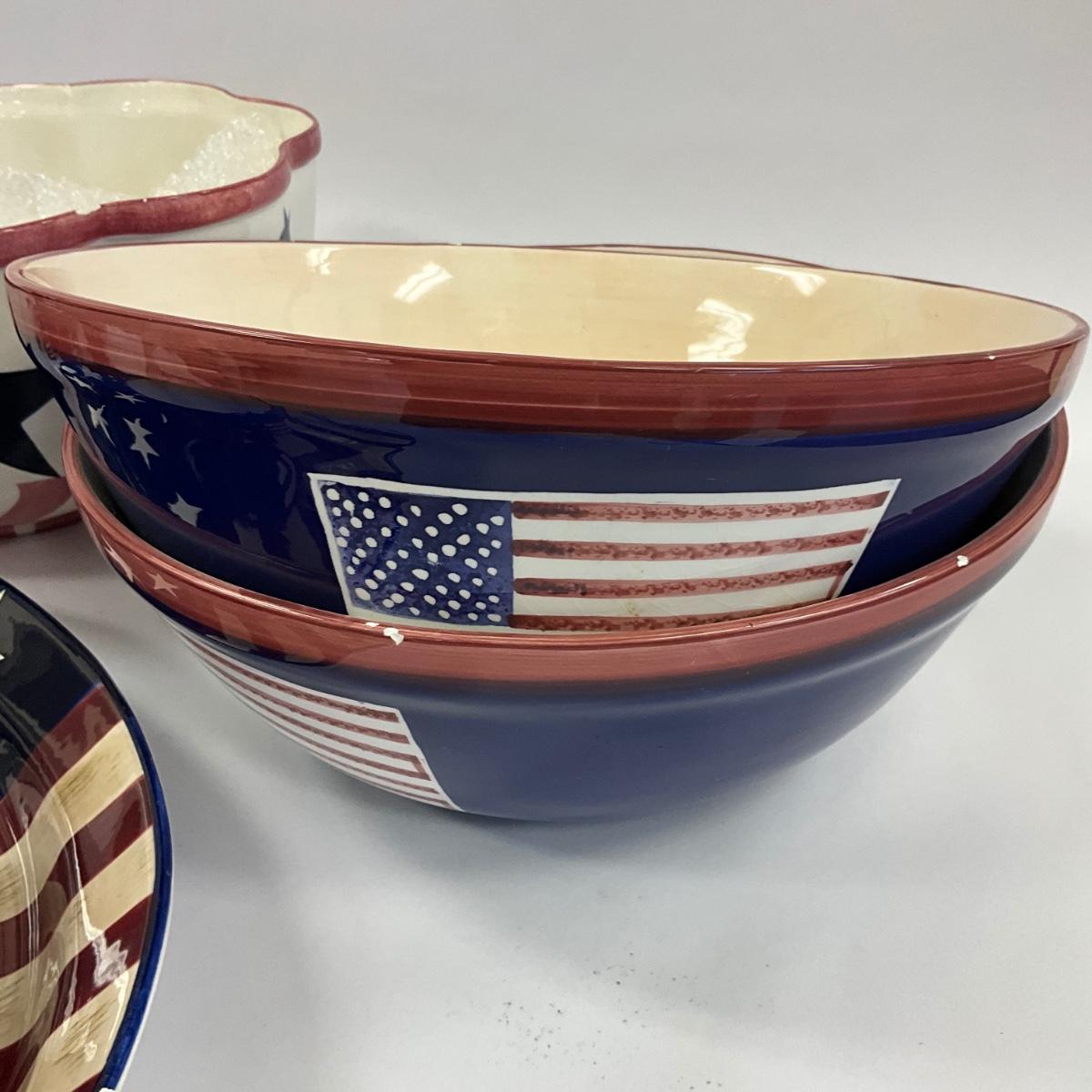 Large serving bowls , oval platter , salt and pepper shakers, BBQ salt and pepper with 4th of july decor