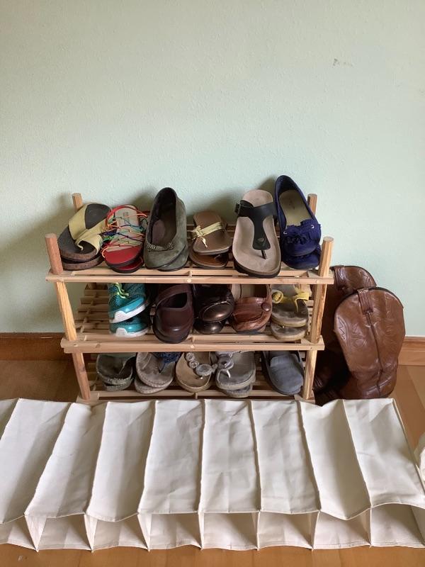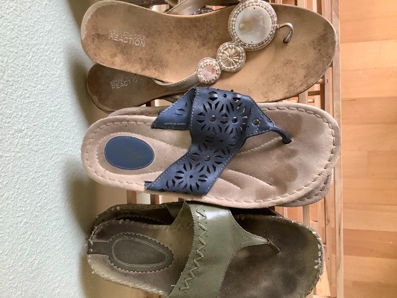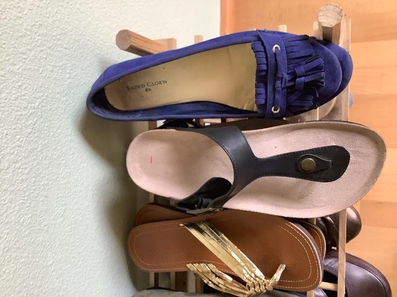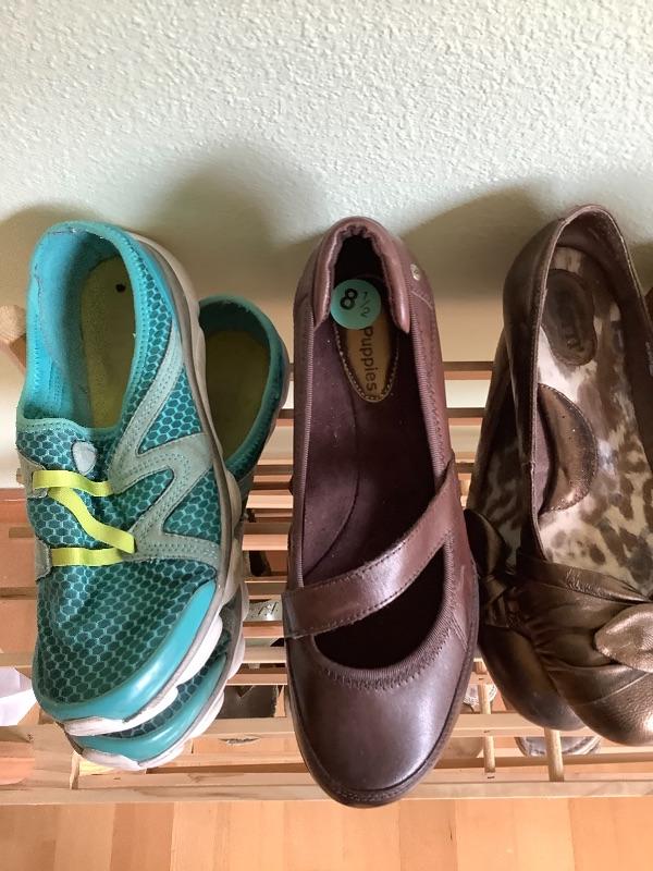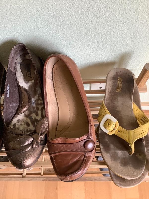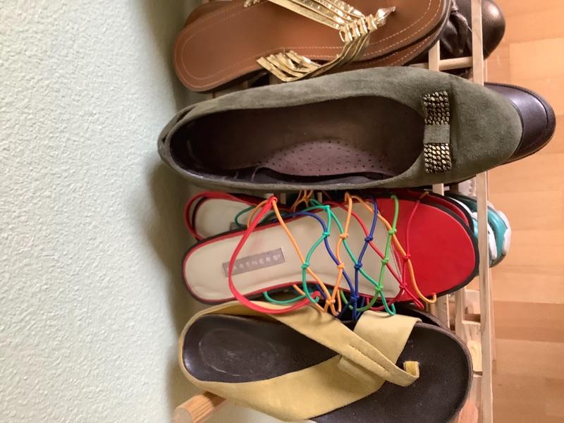 Lot of woman’s shoes sizes 8 and 8-1/2. Sizes run wide. includes hanging shoe rack and does not include wooden shoe racks