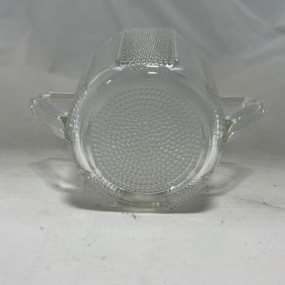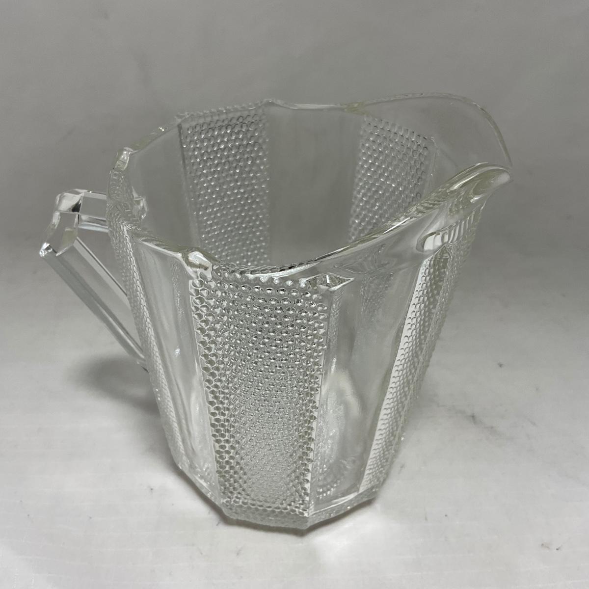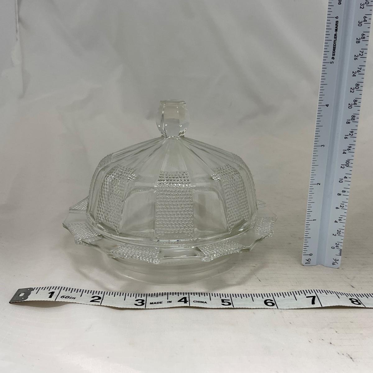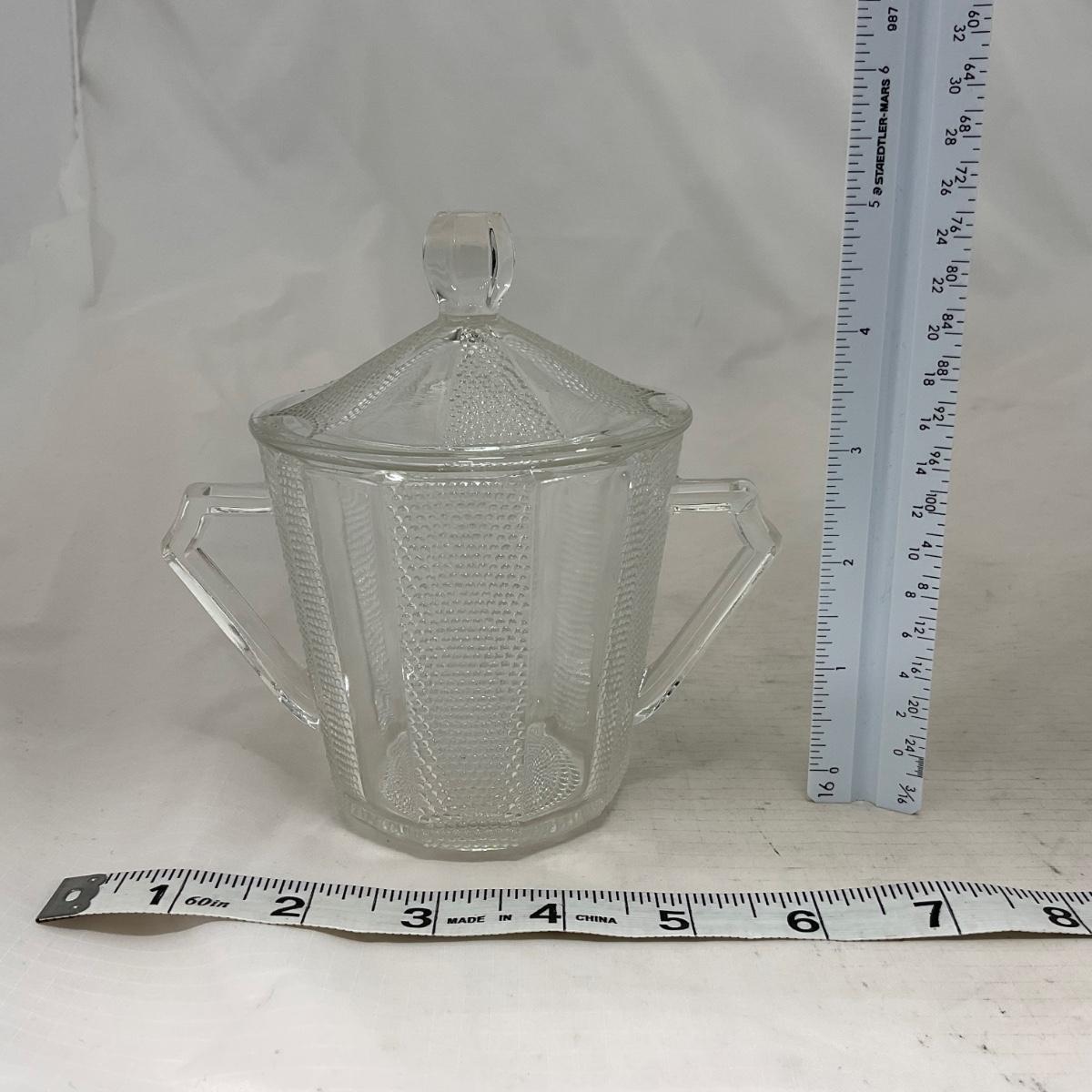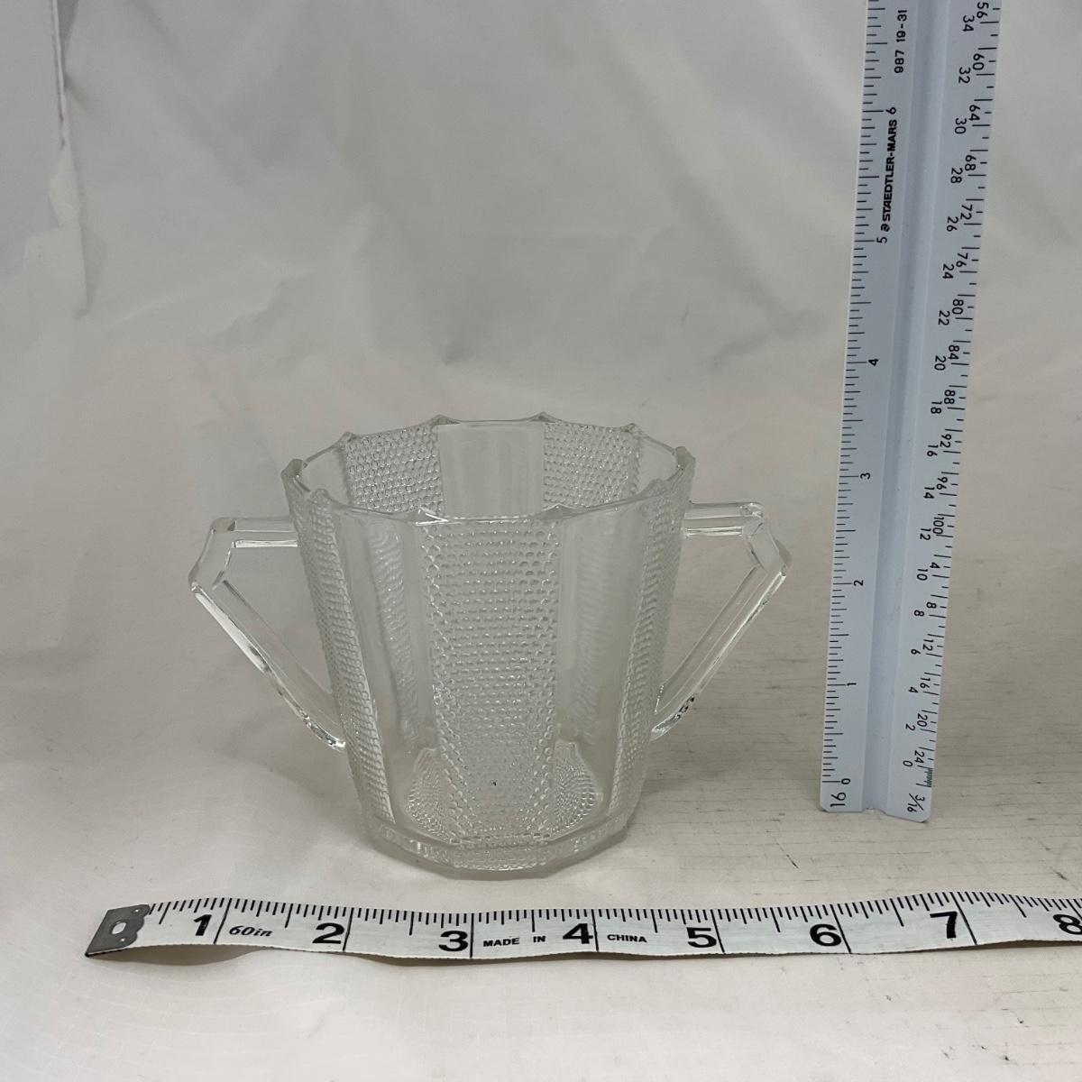 Five pieces total this is a clear dotted pattern glass covered butter dish, covered sugar dish and creamer. This set is well loved and has some small damage and chip along the inside where the lid meets the base. Please see photos for details and condition. ::: Shipping is available on this lot. If you require shipping you must let us know at the close of the auction. We will coordinate with you after the item has been won. Shipping fees will include insurance up to or exceeding the value of all items being mailed. If you have any questions regarding this lot please contact the auctioneer either via this website, by direct email or by phone. PICK UP TIMES and other important information can be found in the TERMS and DESCRIPTION of the auction. Please take a look for pertinent information. Thanks!