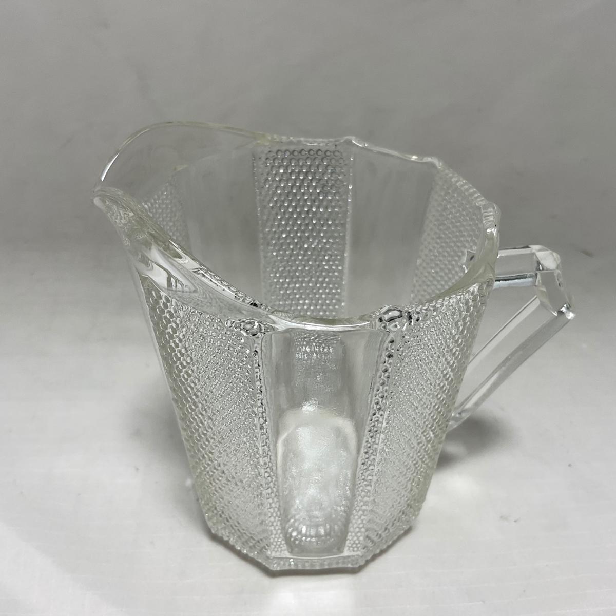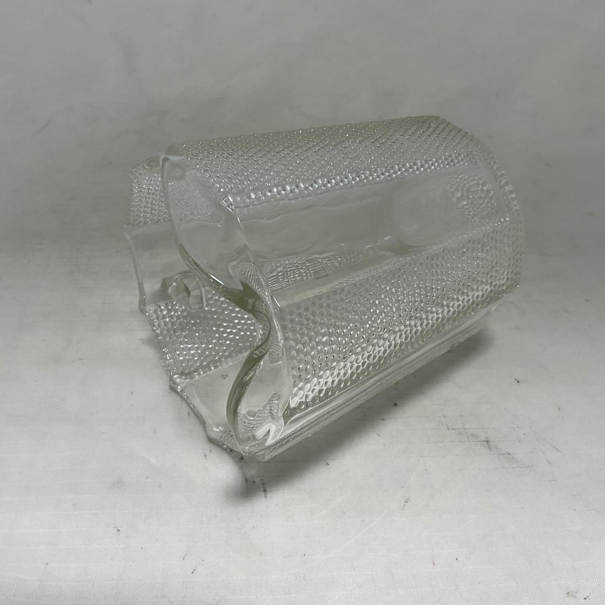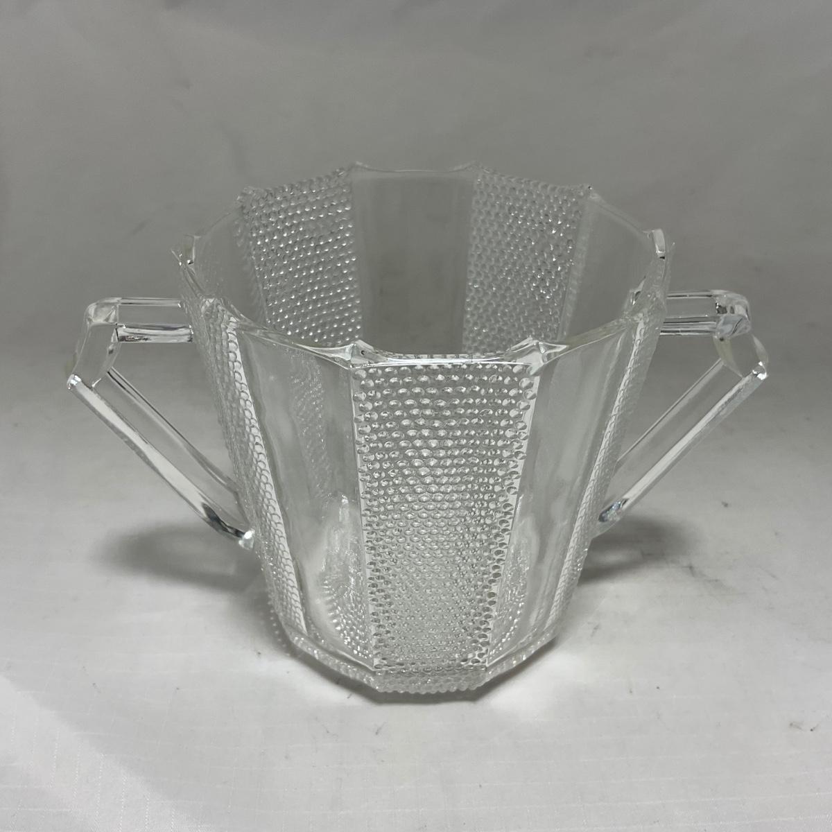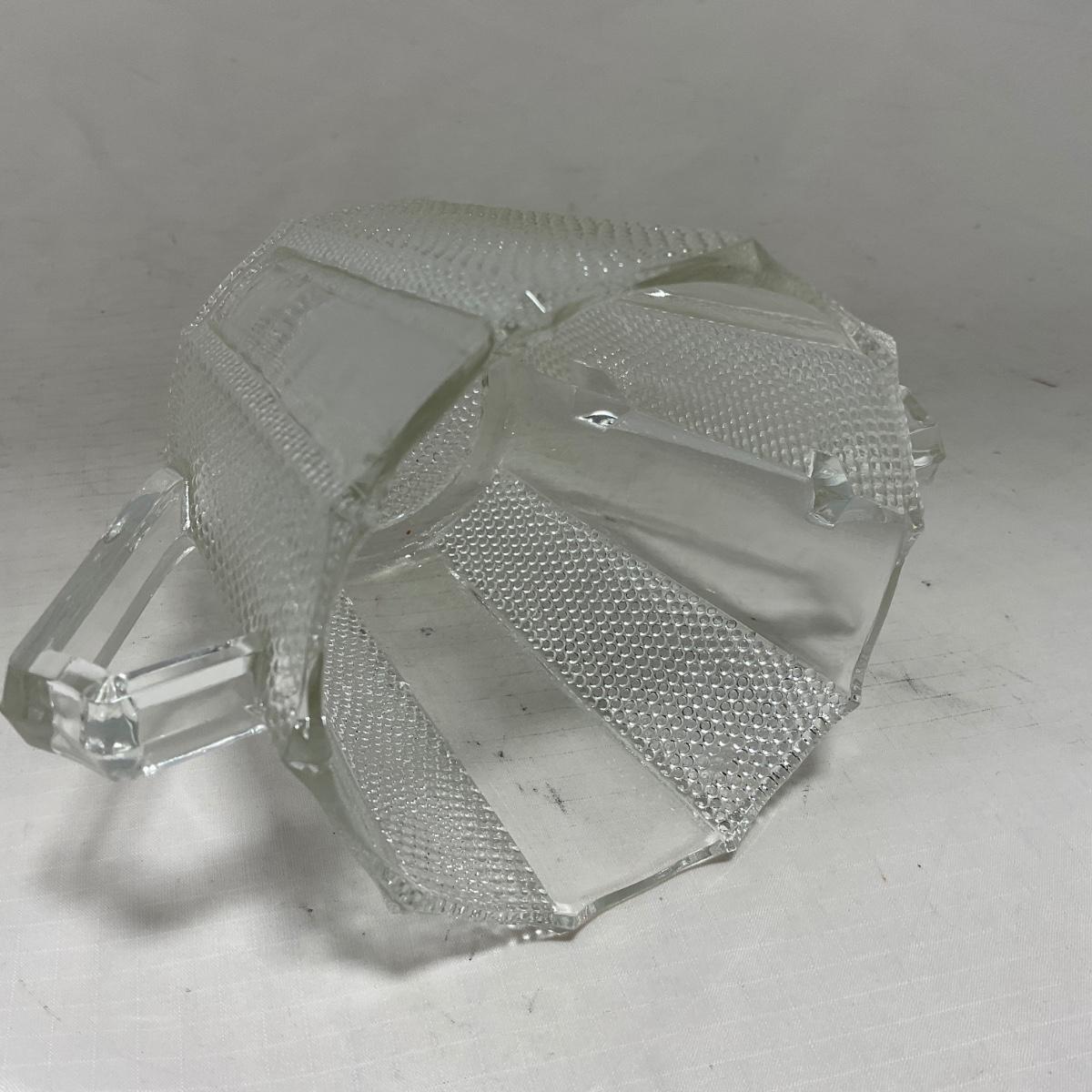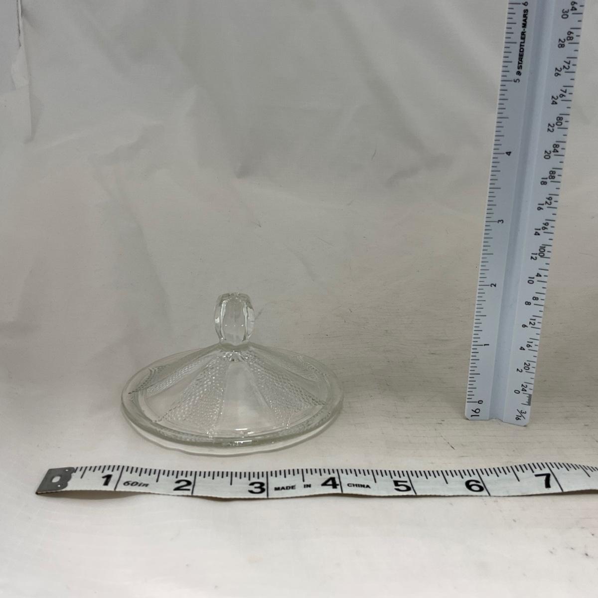 Five pieces total this is a clear dotted pattern glass covered butter dish, covered sugar dish and creamer. This set is well loved and has some small damage and chip along the inside where the lid meets the base. Please see photos for details and condition. ::: Shipping is available on this lot. If you require shipping you must let us know at the close of the auction. We will coordinate with you after the item has been won. Shipping fees will include insurance up to or exceeding the value of all items being mailed. If you have any questions regarding this lot please contact the auctioneer either via this website, by direct email or by phone. PICK UP TIMES and other important information can be found in the TERMS and DESCRIPTION of the auction. Please take a look for pertinent information. Thanks!