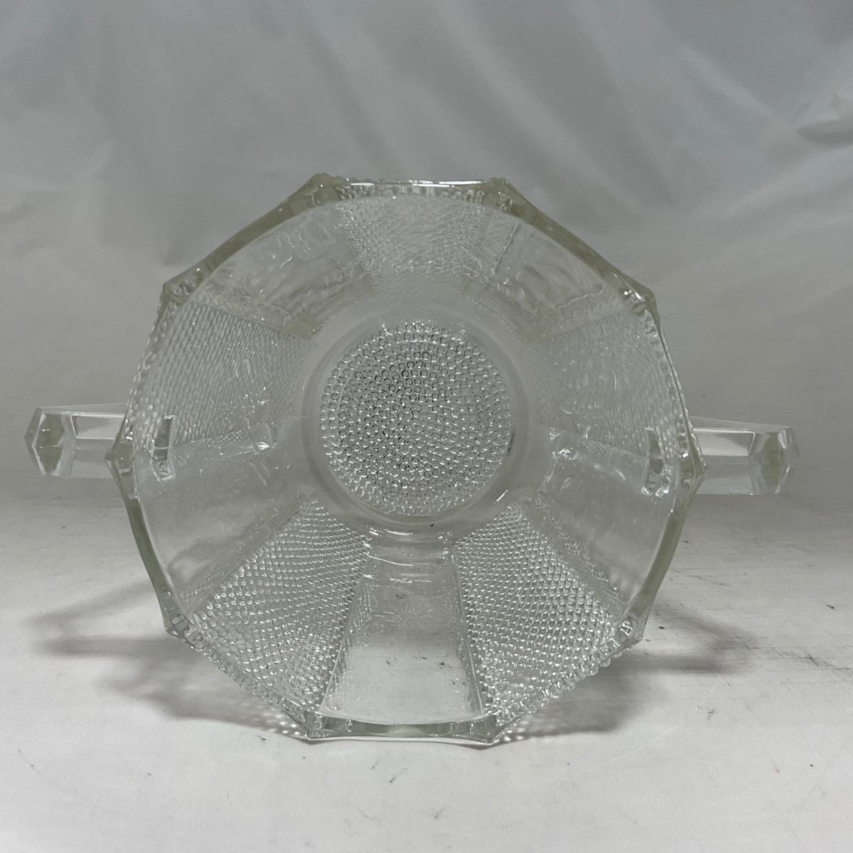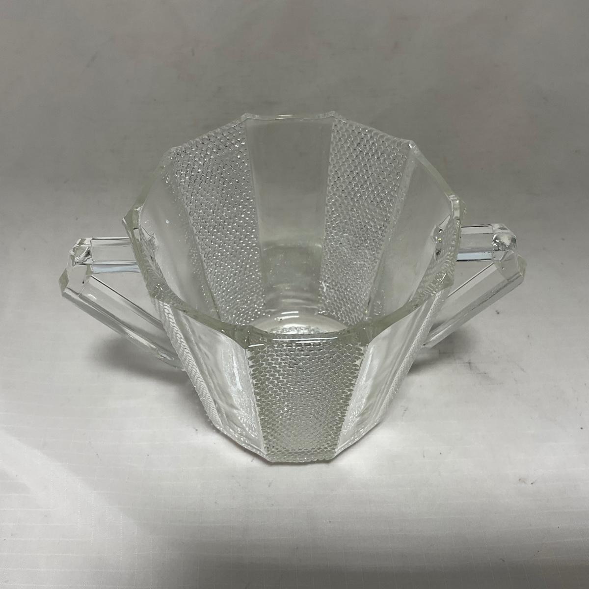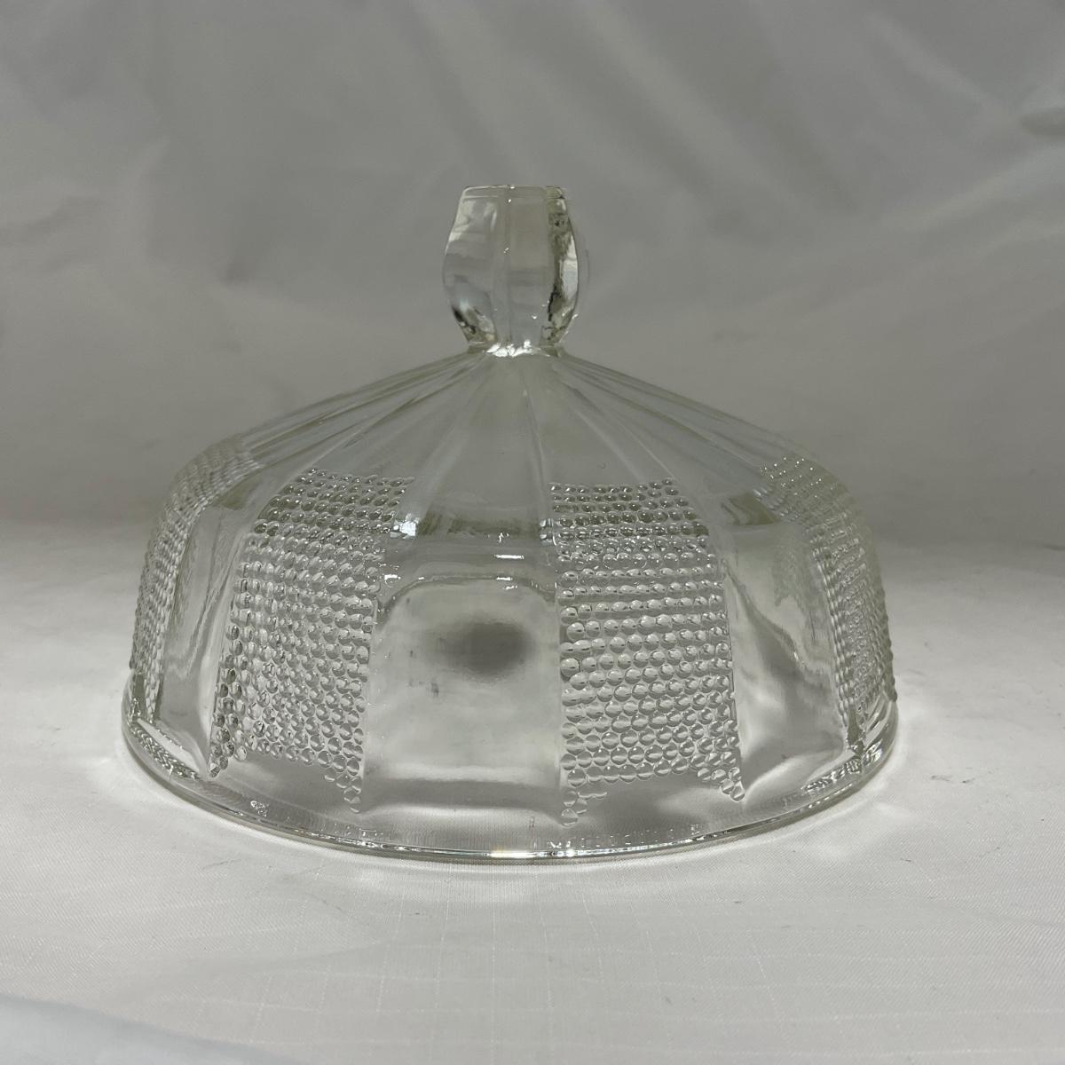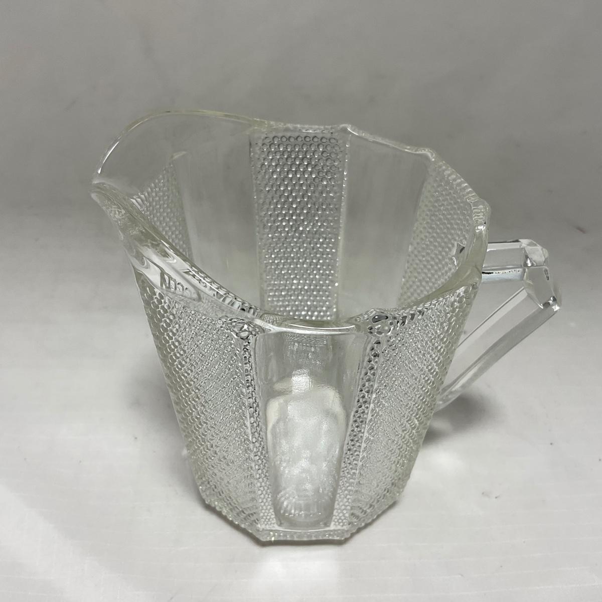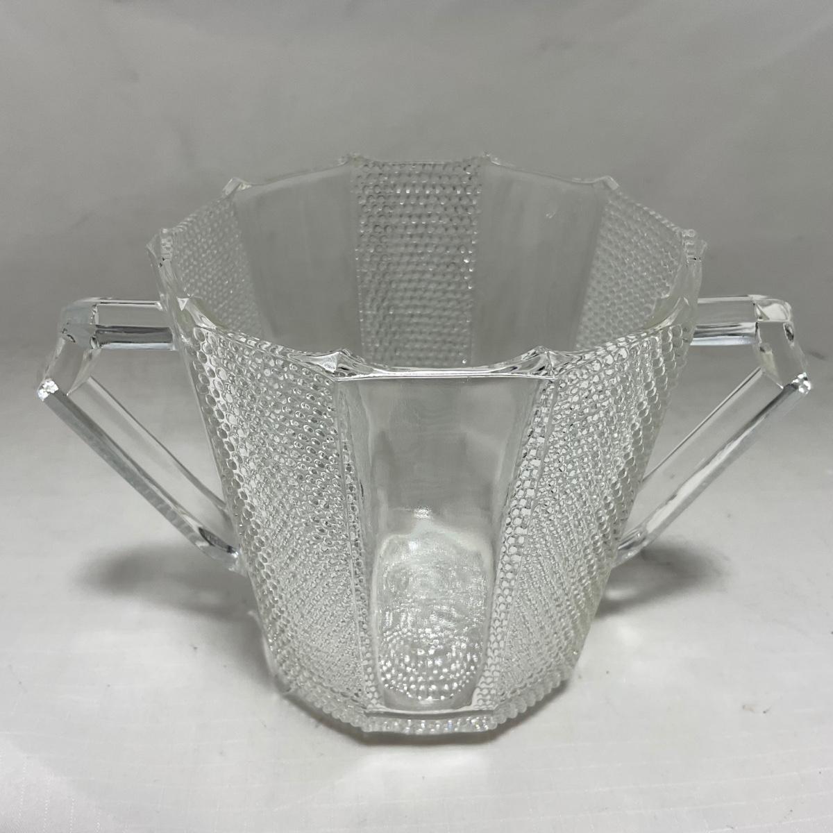 Five pieces total this is a clear dotted pattern glass covered butter dish, covered sugar dish and creamer. This set is well loved and has some small damage and chip along the inside where the lid meets the base. Please see photos for details and condition. ::: Shipping is available on this lot. If you require shipping you must let us know at the close of the auction. We will coordinate with you after the item has been won. Shipping fees will include insurance up to or exceeding the value of all items being mailed. If you have any questions regarding this lot please contact the auctioneer either via this website, by direct email or by phone. PICK UP TIMES and other important information can be found in the TERMS and DESCRIPTION of the auction. Please take a look for pertinent information. Thanks!