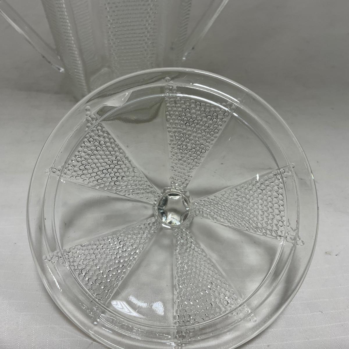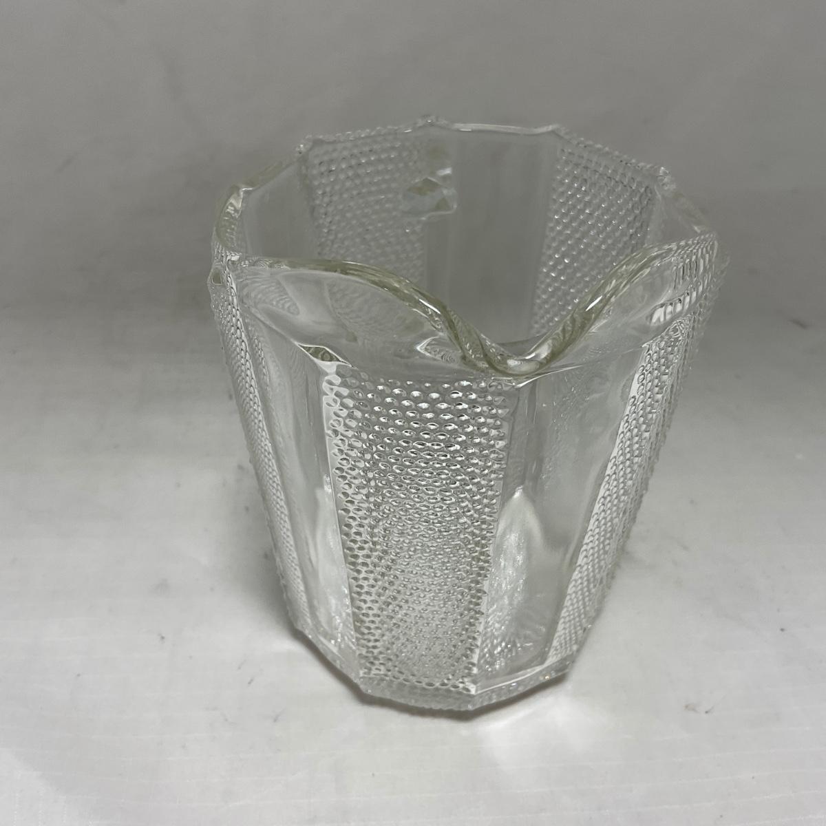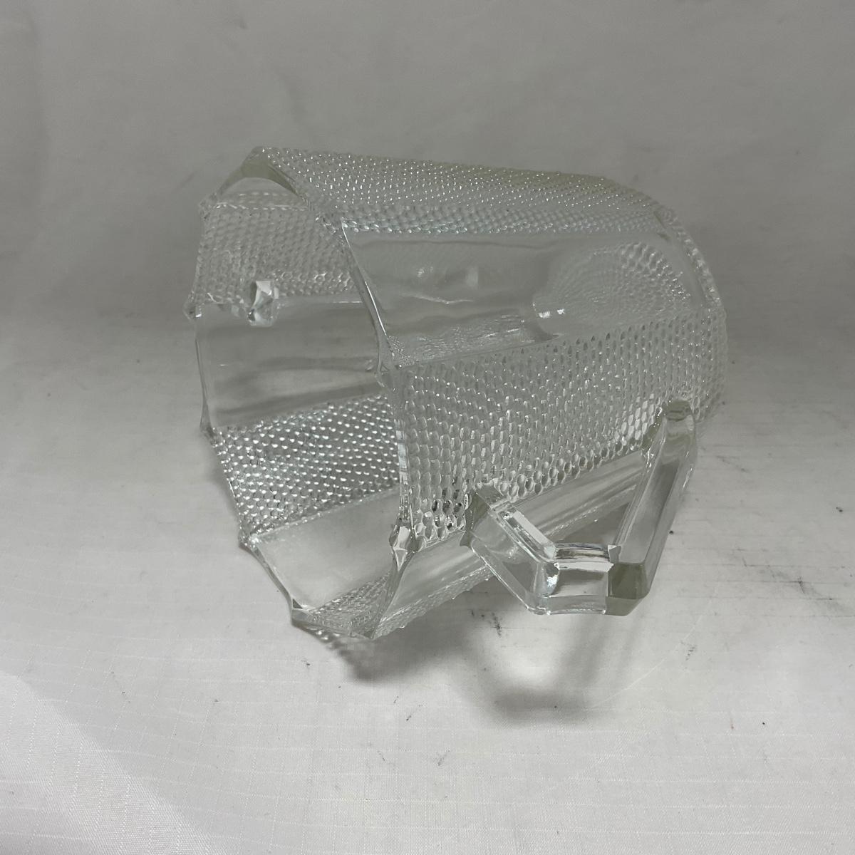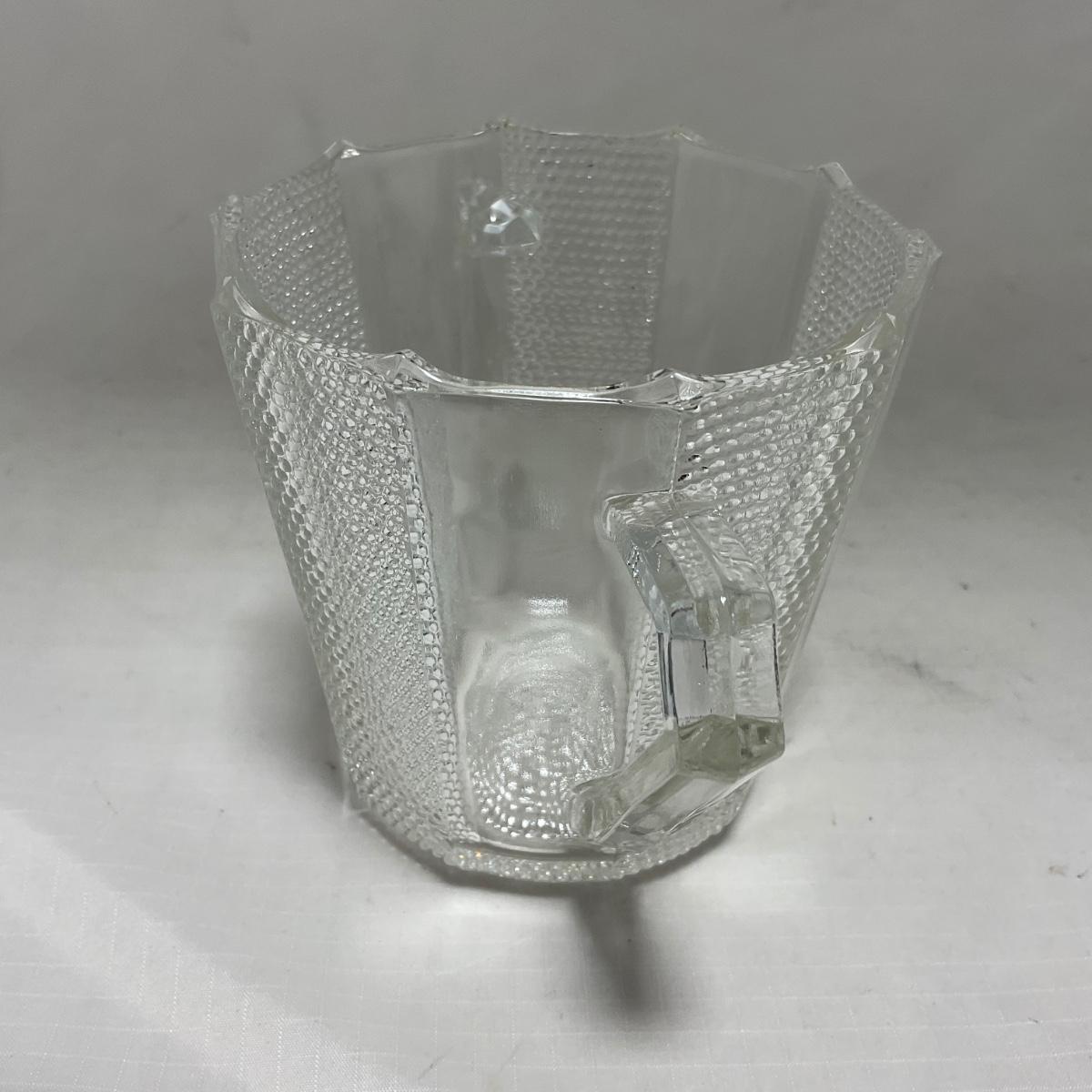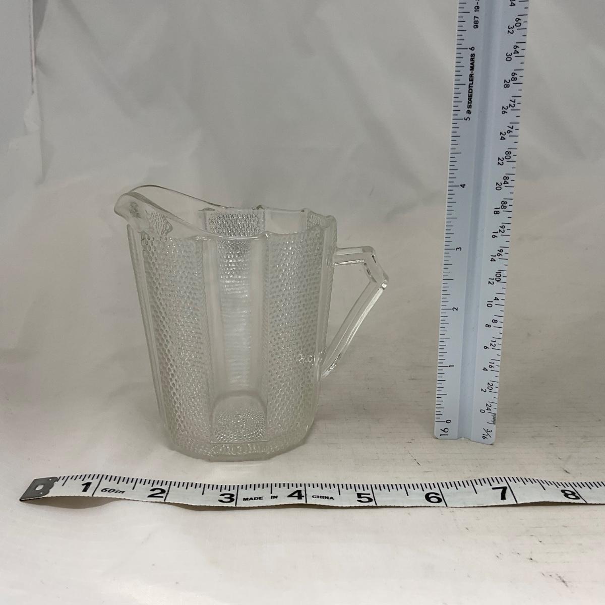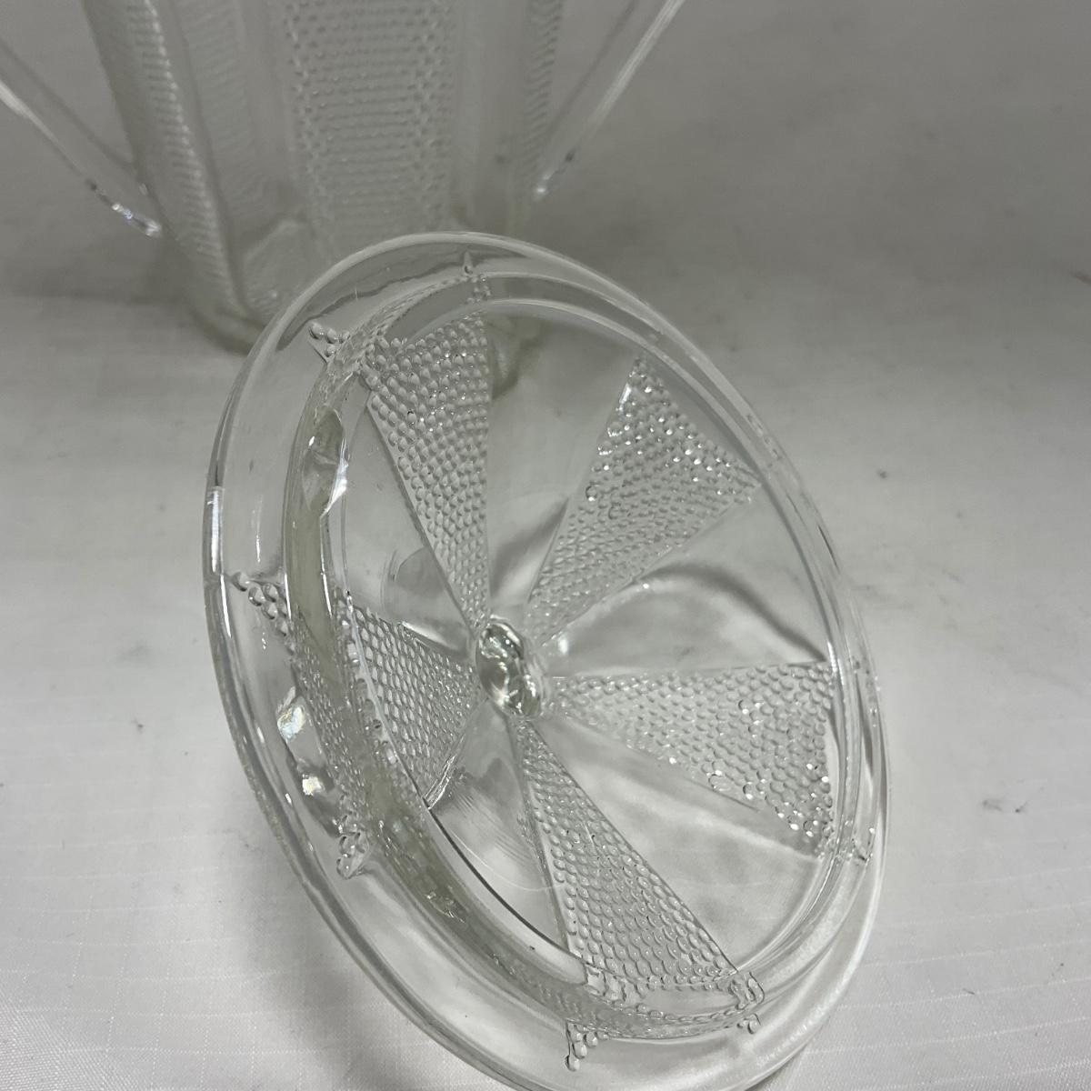 Five pieces total this is a clear dotted pattern glass covered butter dish, covered sugar dish and creamer. This set is well loved and has some small damage and chip along the inside where the lid meets the base. Please see photos for details and condition. ::: Shipping is available on this lot. If you require shipping you must let us know at the close of the auction. We will coordinate with you after the item has been won. Shipping fees will include insurance up to or exceeding the value of all items being mailed. If you have any questions regarding this lot please contact the auctioneer either via this website, by direct email or by phone. PICK UP TIMES and other important information can be found in the TERMS and DESCRIPTION of the auction. Please take a look for pertinent information. Thanks!