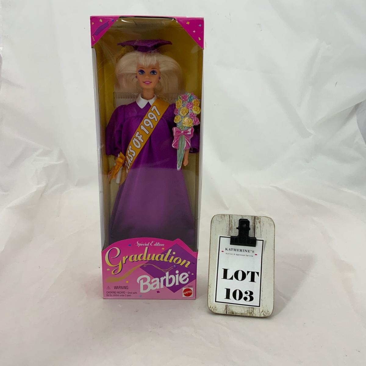 Graduation Barbie, Class of 1997. Doesn’t she look great in her mortar and tassel? No one should look that good in a graduation gown. Doll is new, in box. Please see photos for details and condition. !!! Proceeds from this auction will be donated to the NEW COMMUNITY SHELTER in Green Bay, Wisconsin. Please see Sale Description to the Left for more information. !!! ::: Shipping is available on this lot. If you require shipping you must let us know at the close of the auction. We will coordinate with you after the item has been won. Shipping fees will include insurance up to or exceeding the value of all items being mailed. If you have any questions regarding this lot please contact the auctioneer either via this website, by direct email or by phone. PICK UP TIMES and other important information can be found in the TERMS and DESCRIPTION of the auction. Please take a look for pertinent information. Thanks!