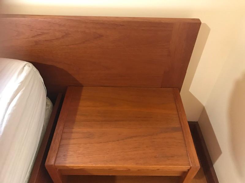 Mid Century Jesper Danish Modern Teak Queen Platform Bed with Floating Nightstands headboard measures 107” wide x 29” tall x 83” long