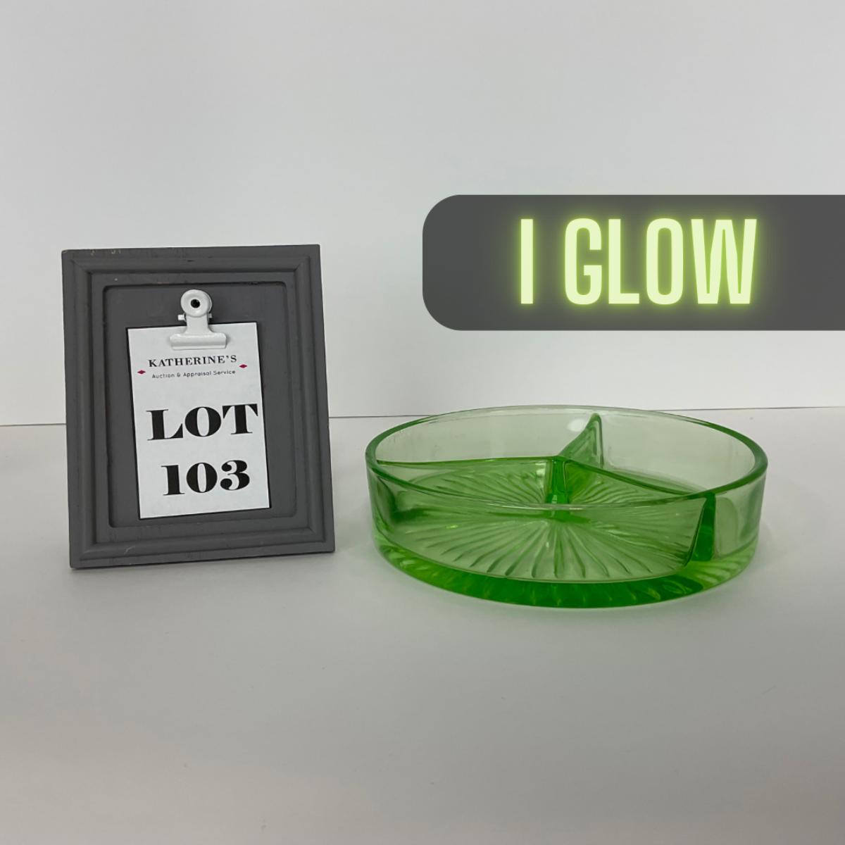 One green depression three part divided round dish. I am Uranium glass so I DO GLOW under blacklight. Please see photos for details and condition. ::: Shipping is available on this lot. If you require shipping you must let us know at the close of the auction. We will coordinate with you after the item has been won. Shipping fees will include insurance up to or exceeding the value of all items being mailed. If you have any questions regarding this lot please contact the auctioneer either via this website, by direct email or by phone. PICK UP TIMES and other important information can be found in the TERMS and DESCRIPTION of the auction. Please take a look for pertinent information. Thanks!