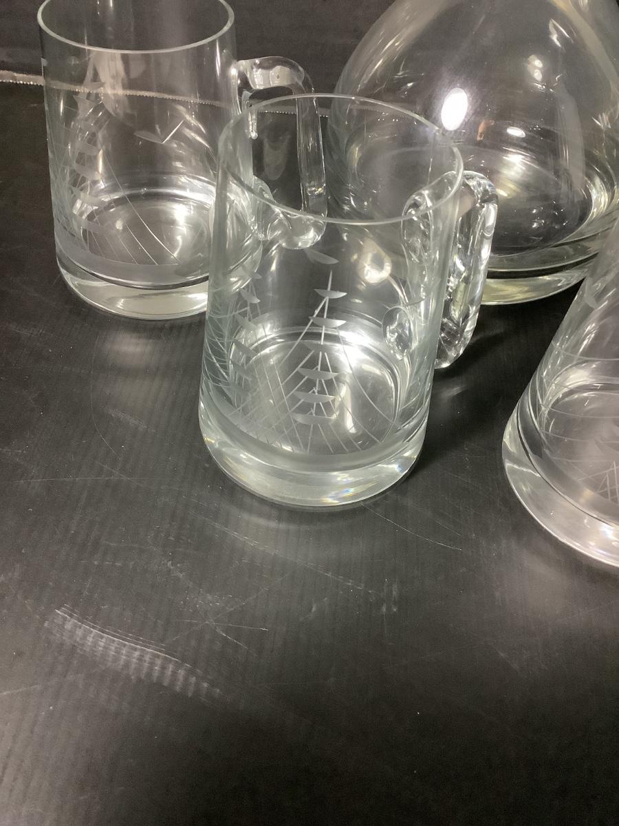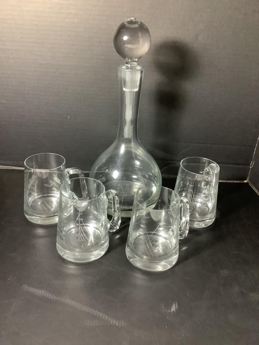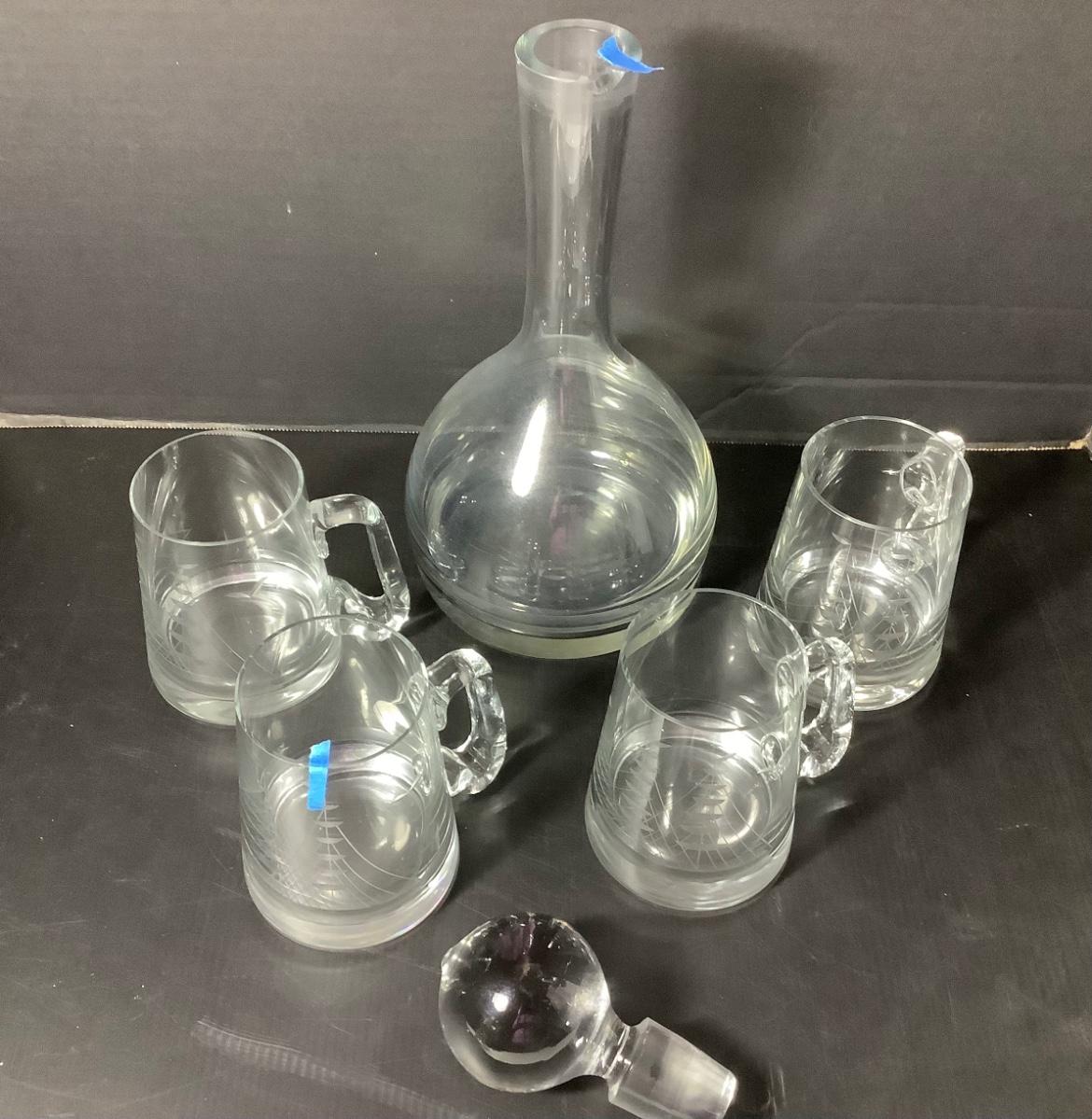 1031 Decanter & Crystal Mugs with Etched Sailboats
