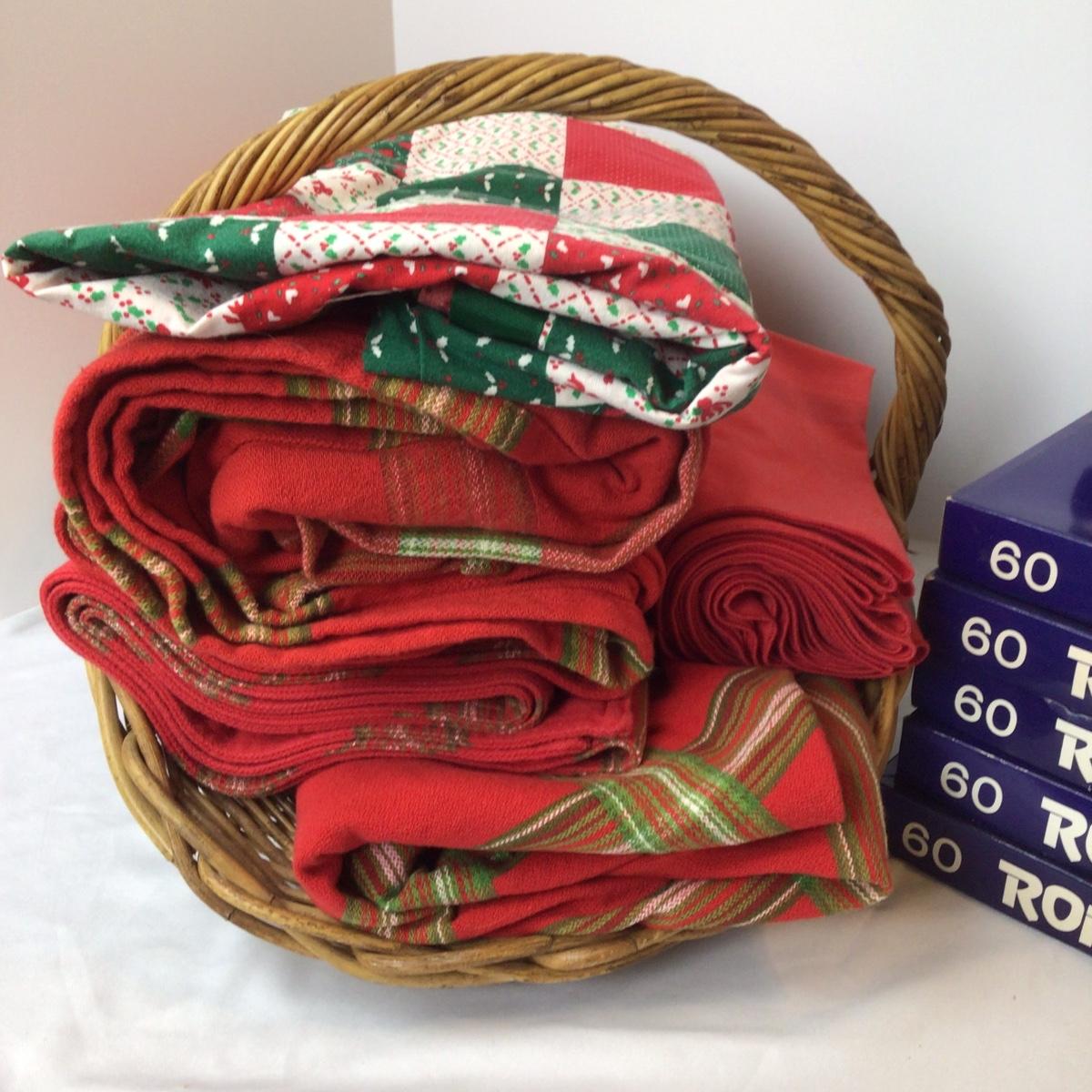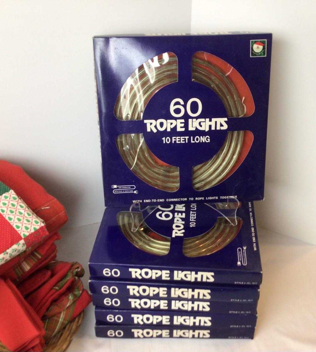 There are 6 boxes of holiday rope lights and an assortment of holiday table linens.
