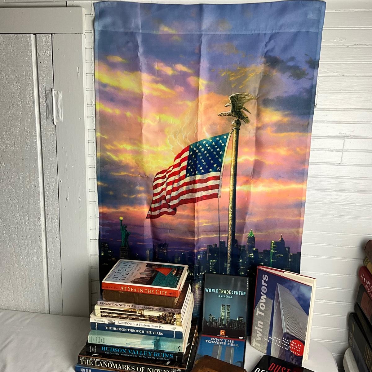 Hudson, NY, NYC, 9-11 Books , Framed 3 x 5 black and white photo of twin towers, and flag 36" x 24".