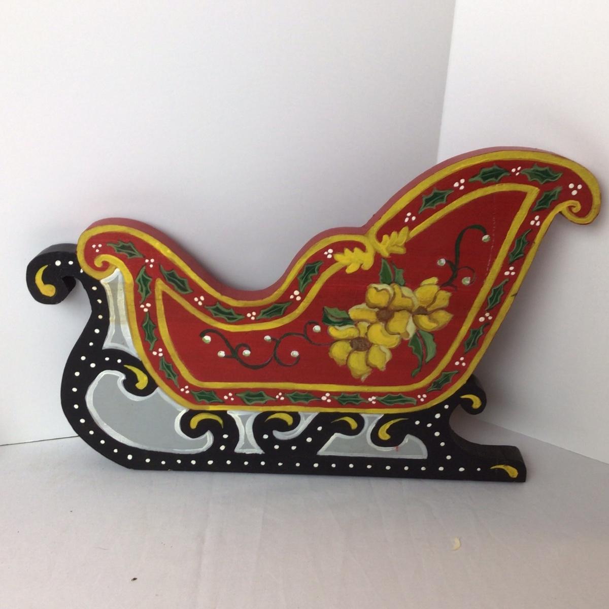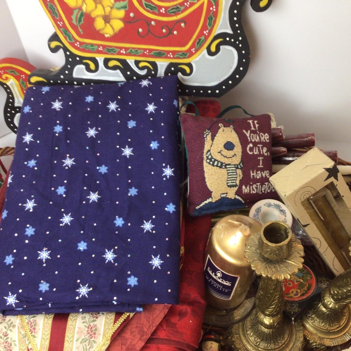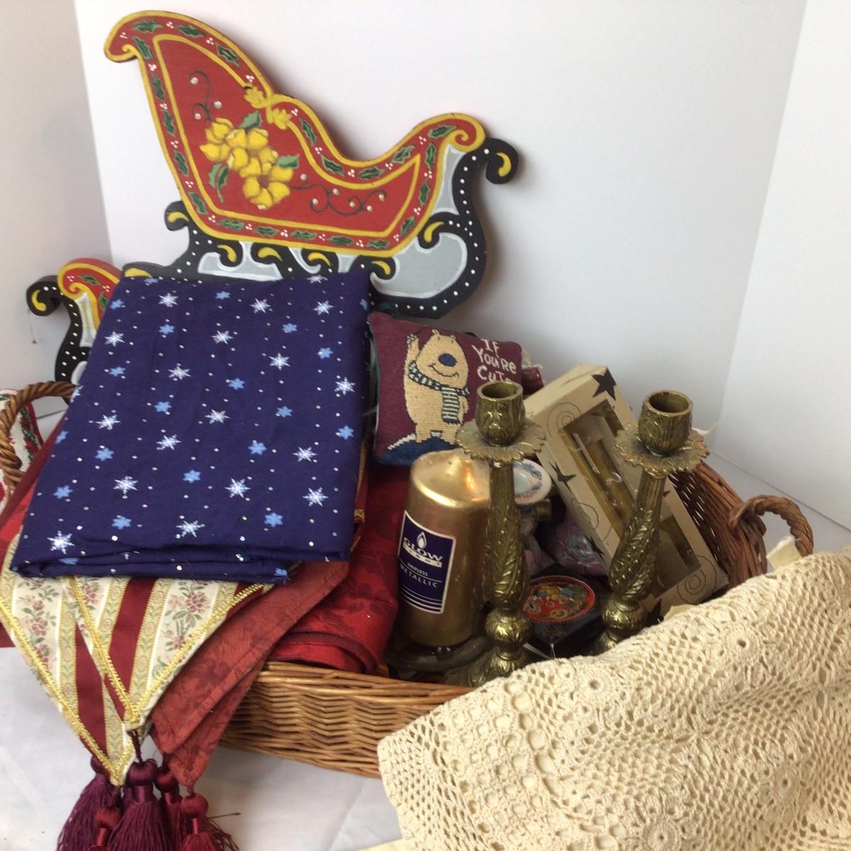 The lot contains crochet christmas tree skirt, wooden sleighs for decor, needlepoint pillows, candles and more.