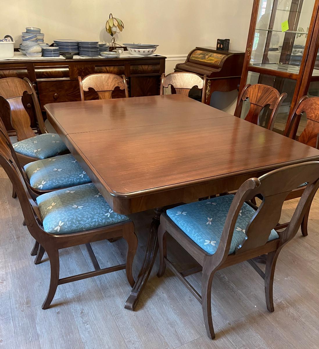 #104 Antique Mahogany Table. Refinished! Plus 8 Matching Chair. Reupholstered